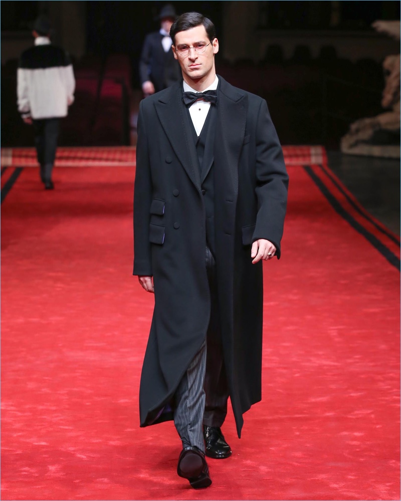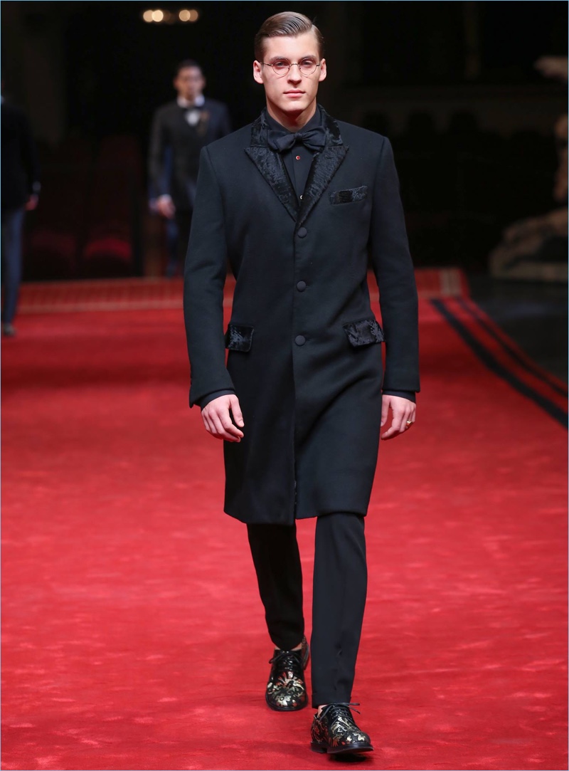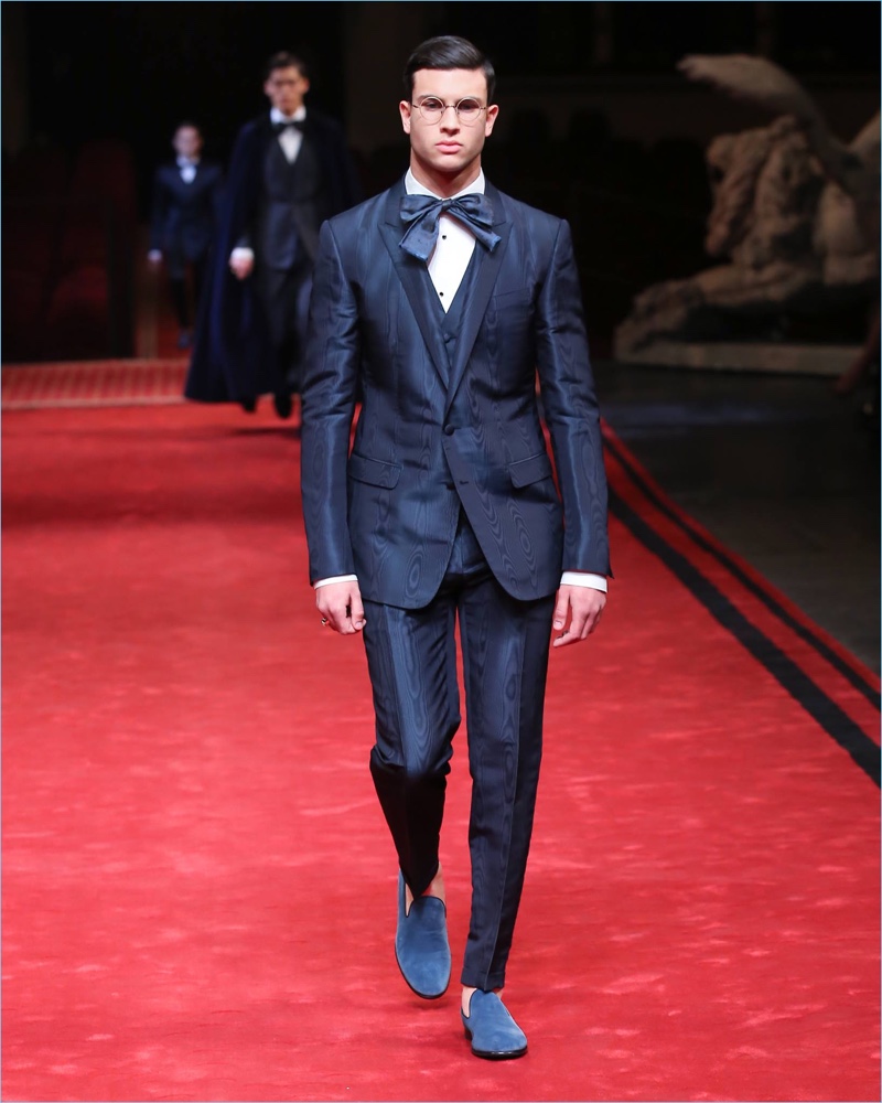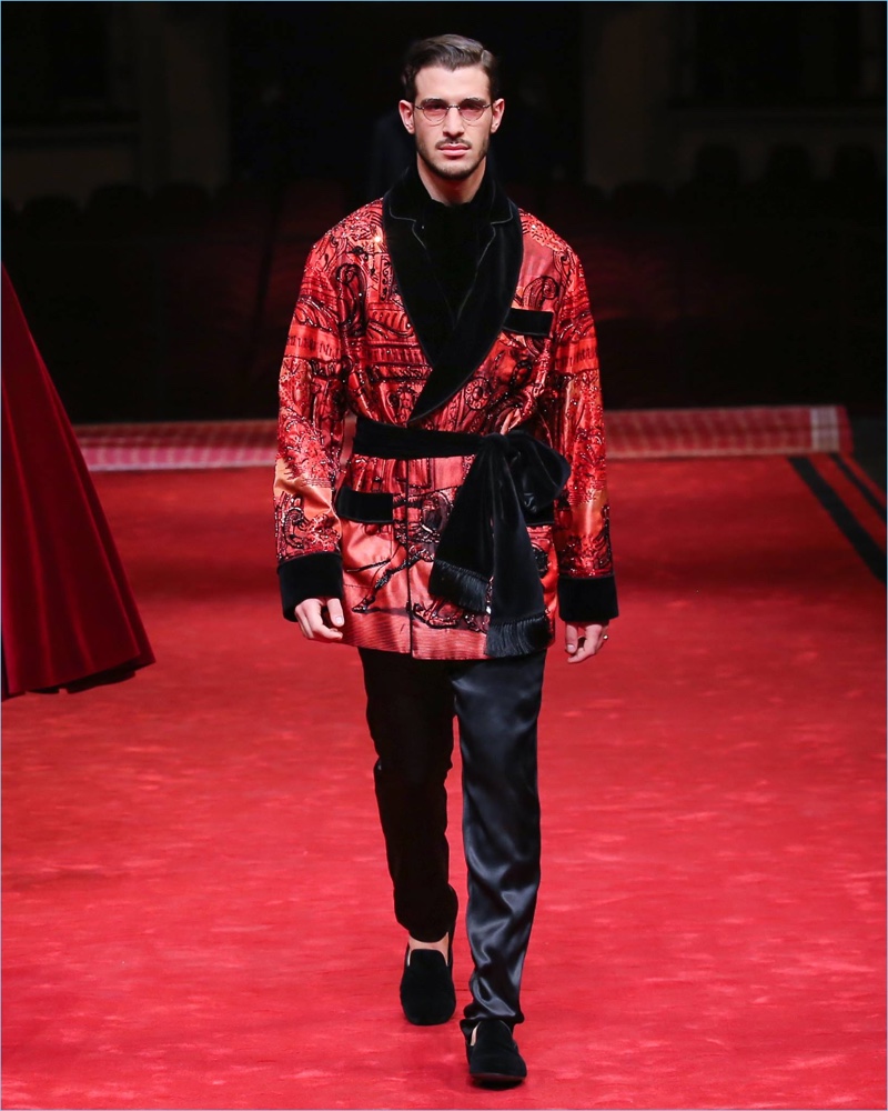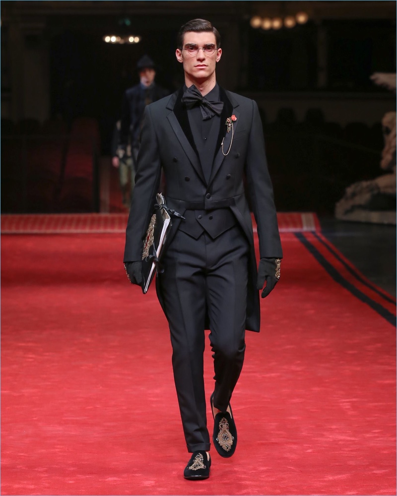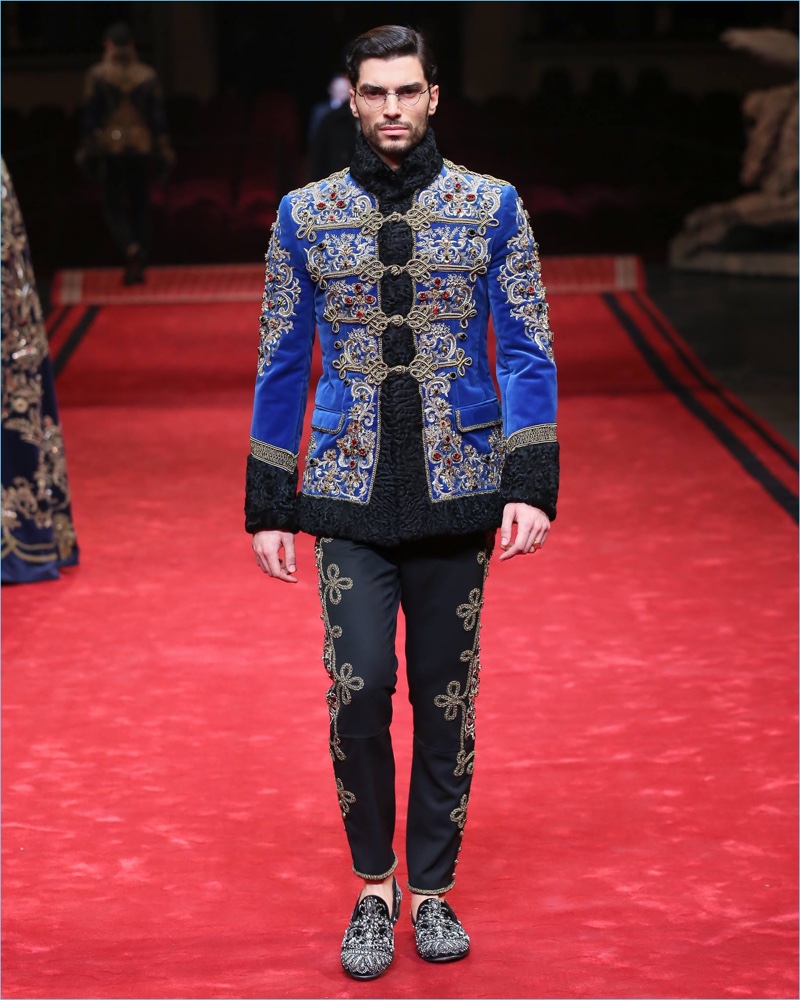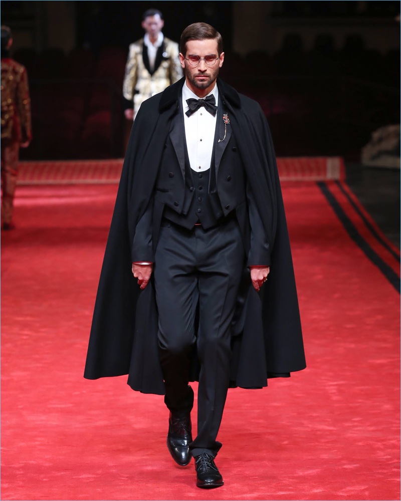 Luxurious topcoats, tailored waistcoats, fur adorned bombers, and graphic tuxedo jackets contribute to an extravagant showing. Exploring La Scala’s archives, several of Dolce & Gabbana’s bold prints referenced storied programs. Sparing no expense, the collection also featured gorgeous brocades, lavish velvets, and floral embellishments.