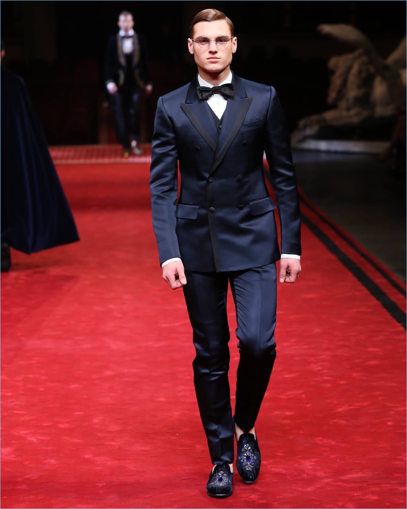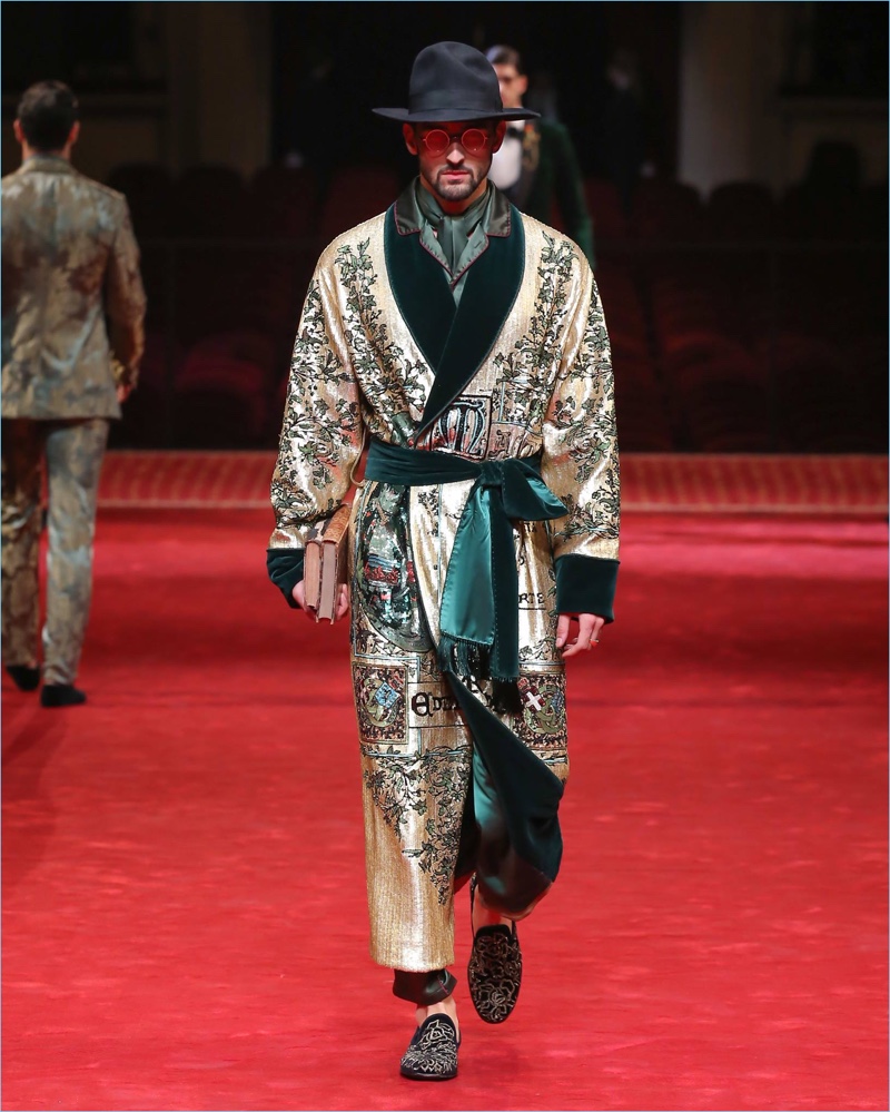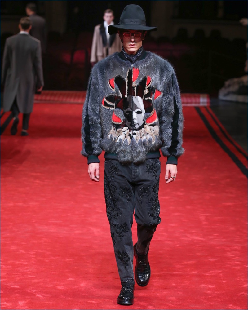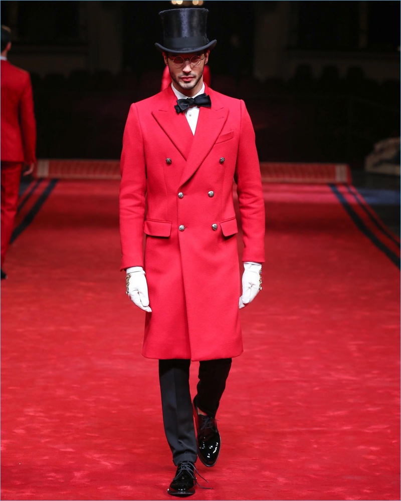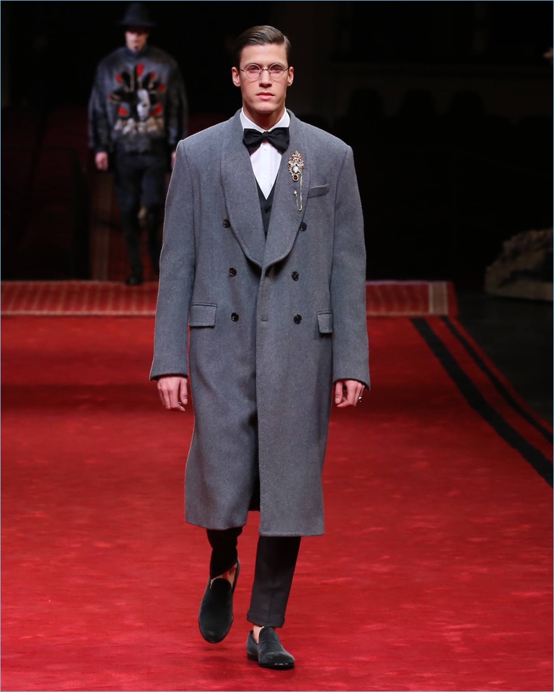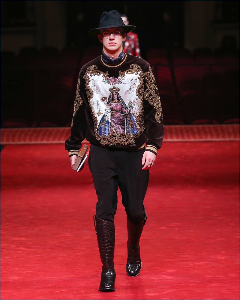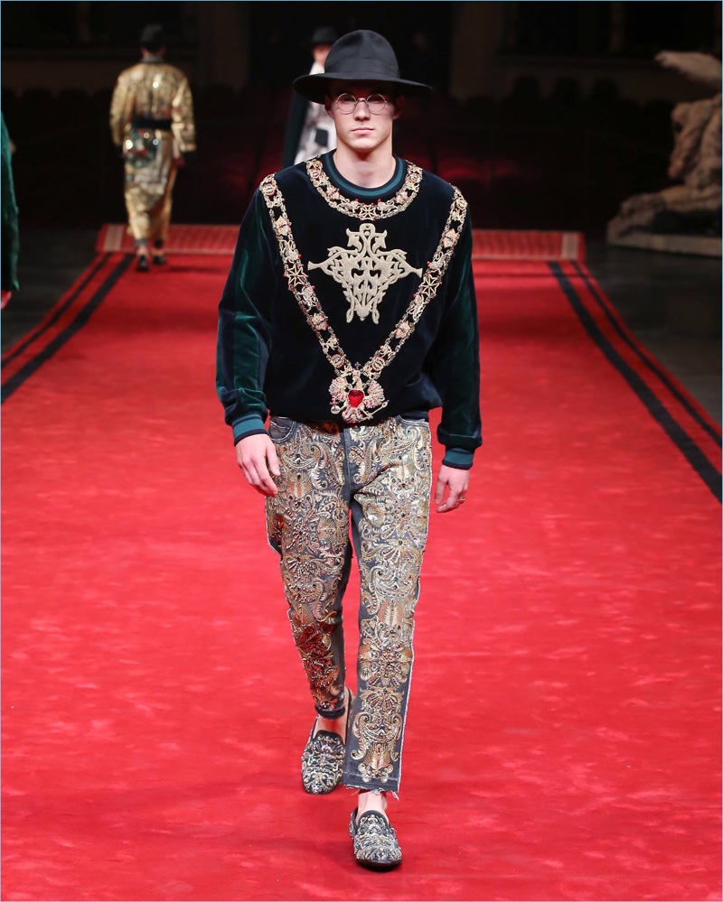Luxurious topcoats, tailored waistcoats, fur adorned bombers, and graphic tuxedo jackets contribute to an extravagant showing. Exploring La Scala’s archives, several of Dolce & Gabbana’s bold prints referenced storied programs. Sparing no expense, the collection also featured gorgeous brocades, lavish velvets, and floral embellishments.