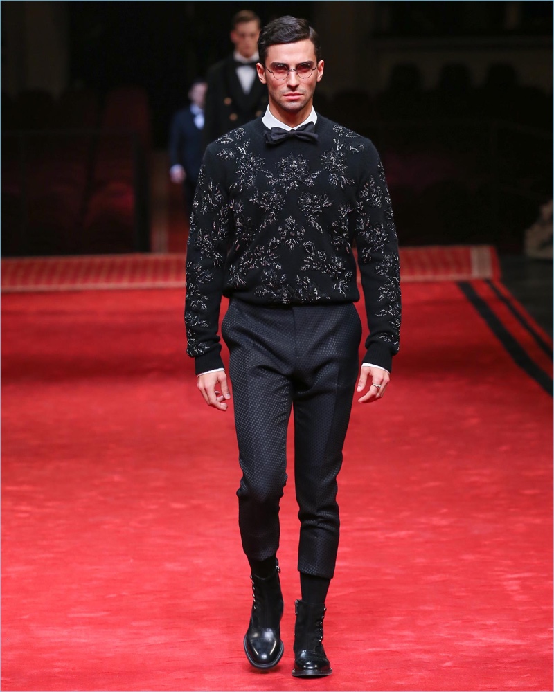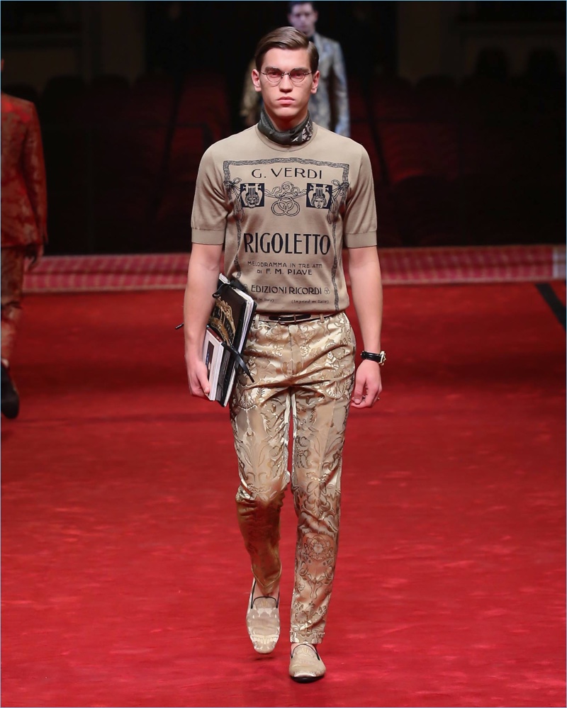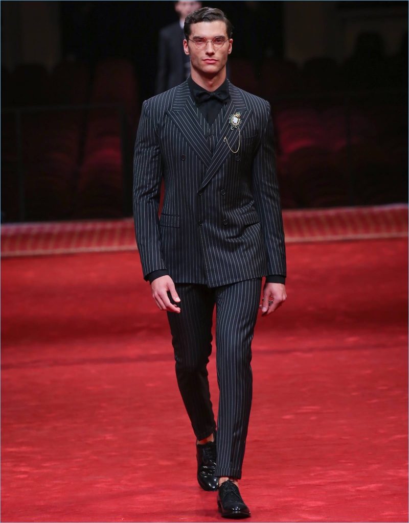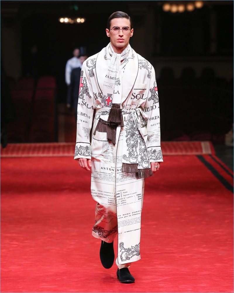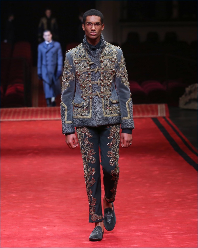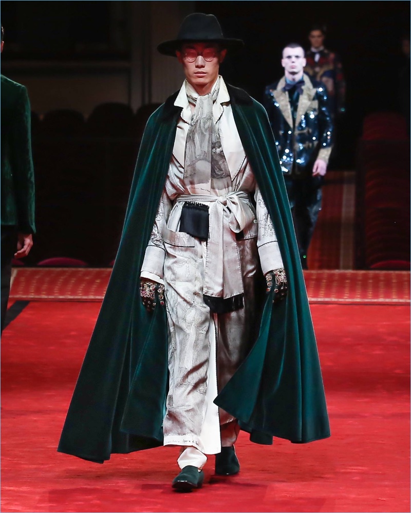 Luxurious topcoats, tailored waistcoats, fur adorned bombers, and graphic tuxedo jackets contribute to an extravagant showing. Exploring La Scala’s archives, several of Dolce & Gabbana’s bold prints referenced storied programs. Sparing no expense, the collection also featured gorgeous brocades, lavish velvets, and floral embellishments.