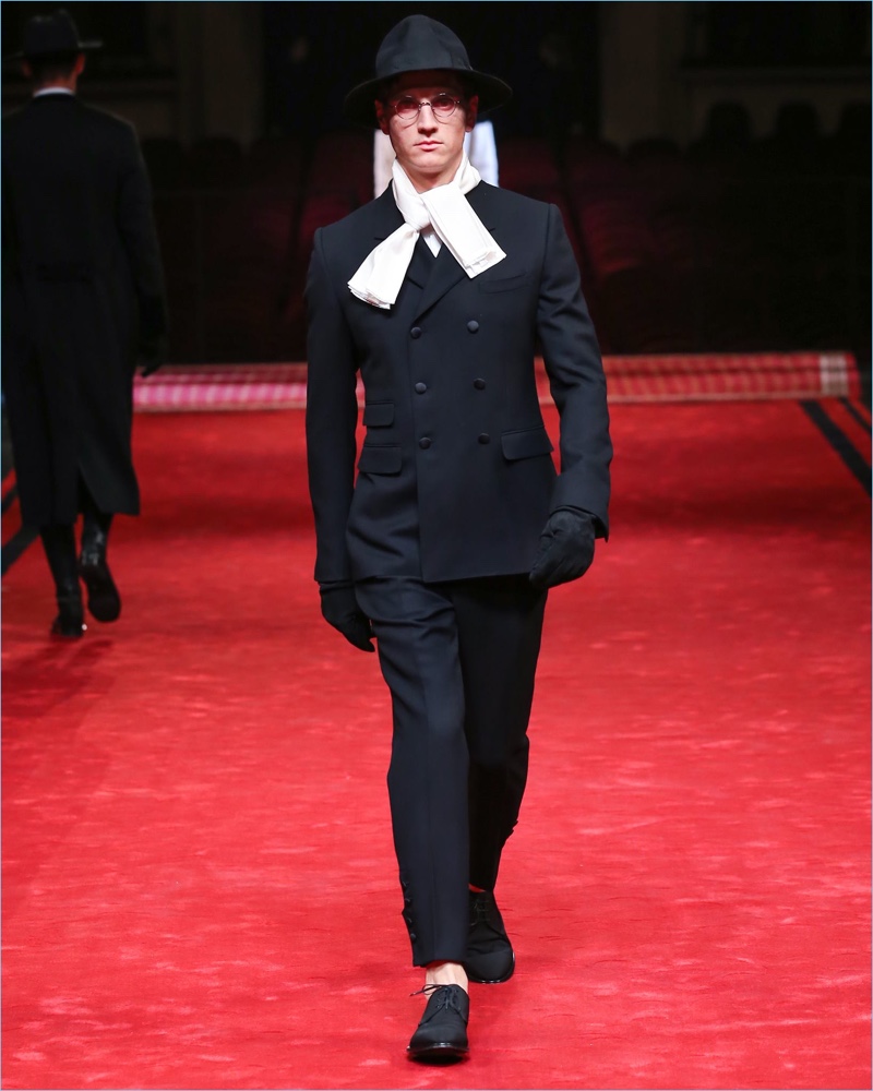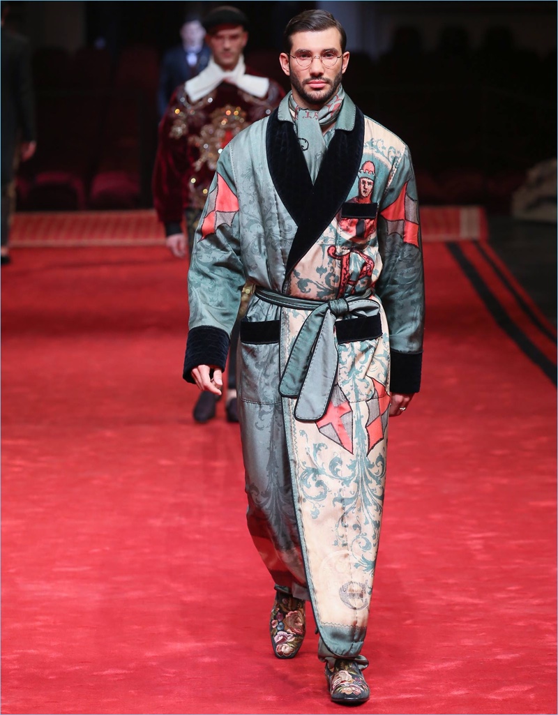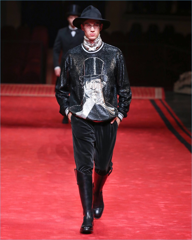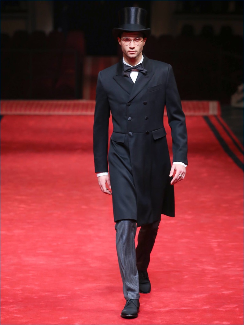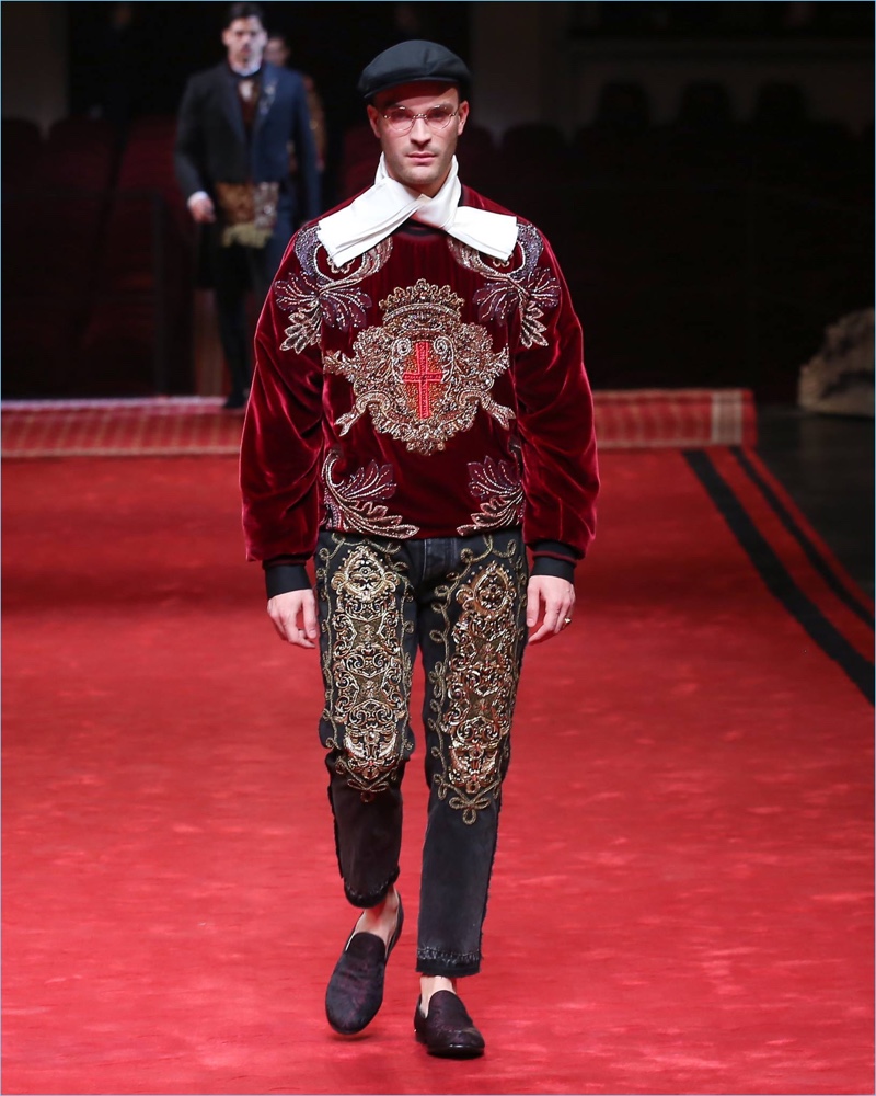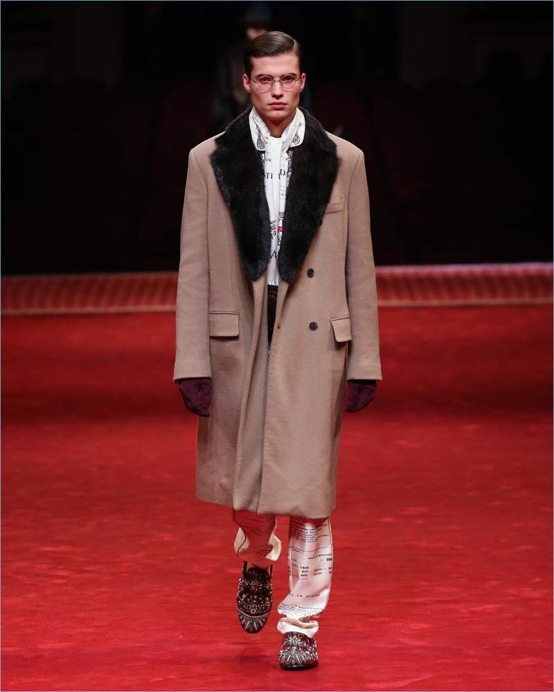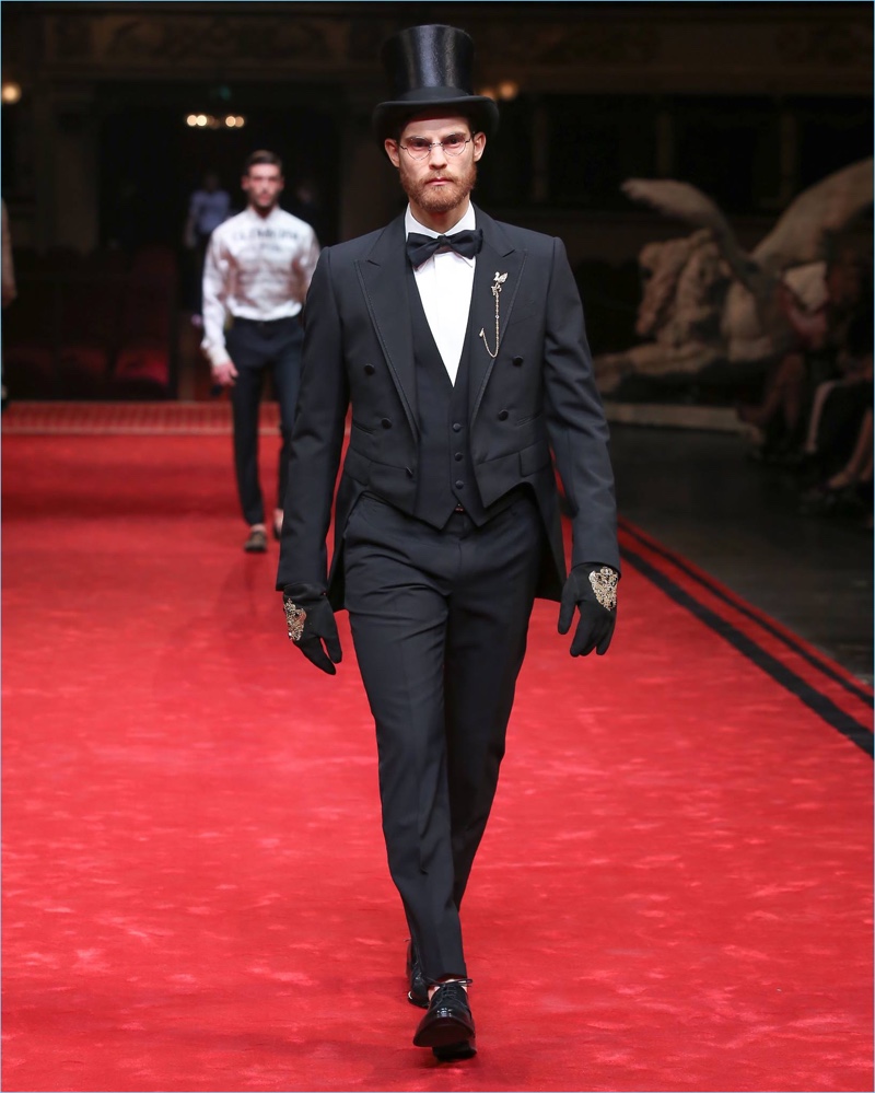 Luxurious topcoats, tailored waistcoats, fur adorned bombers, and graphic tuxedo jackets contribute to an extravagant showing. Exploring La Scala’s archives, several of Dolce & Gabbana’s bold prints referenced storied programs. Sparing no expense, the collection also featured gorgeous brocades, lavish velvets, and floral embellishments.