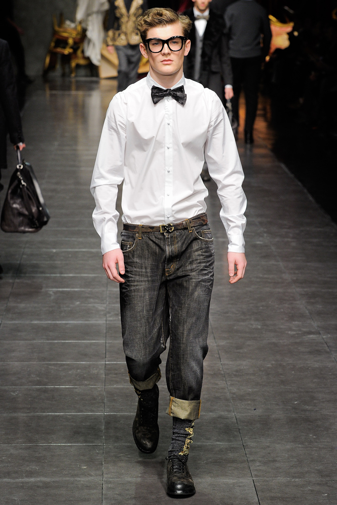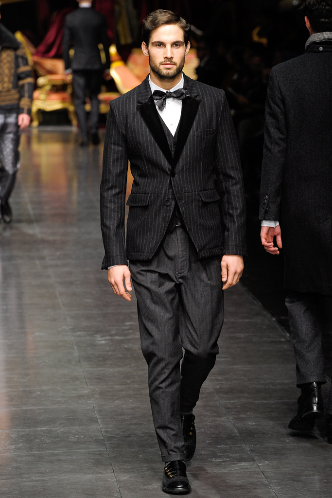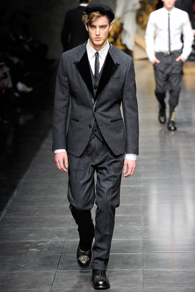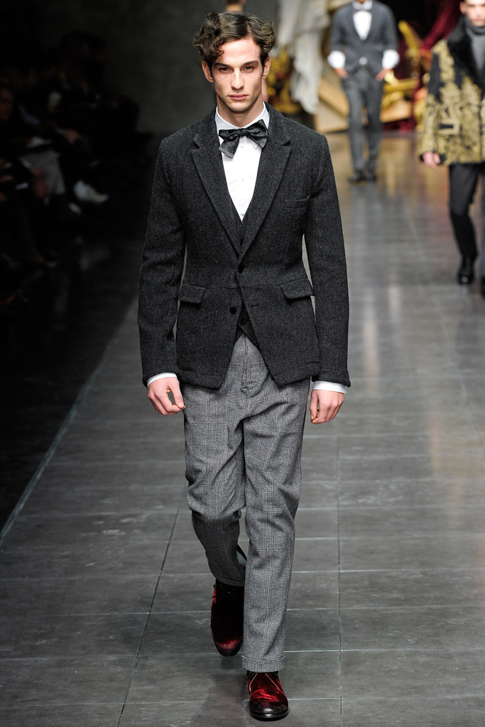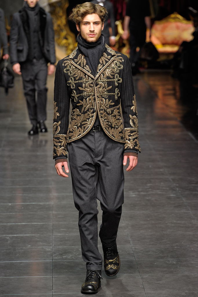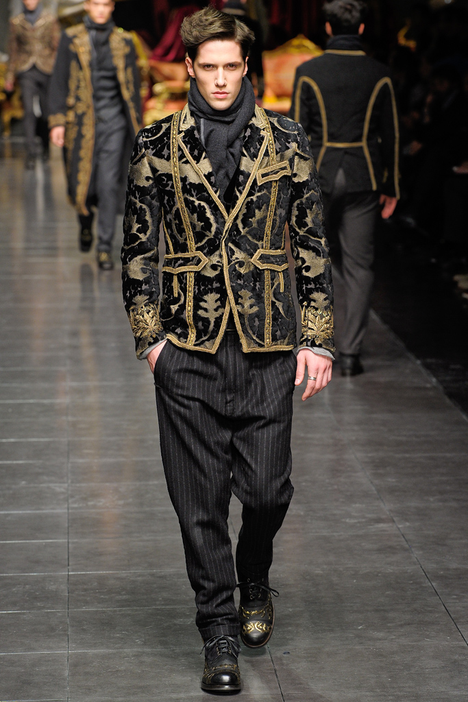 Regal Formation–Dolce & Gabbana follows a path lined with luxe fabrications and rich accents for the fall/winter 2012 season. A mix of country romance and early turn of the century dapper sentiments, the Italian house finds a place for their D&G youth amongst a mature collection of standout pieces. Dressing up suit jackets, lapels cut out of velvet mark the season, while the gradual incorporation of gold embroidery reinforces fall’s grand theme. Overlooking no facet in the life of their debonair man, the lineup transitions from sharp outerwear and companion pieces of warm wool to a more relaxed gesture that sees Dolce & Gabbana turn to their infamous silk. Whether worn as an exquisite set of pajamas or a bold move outdoors, the regal execution is the perfect touch to a collection that spares no expense.