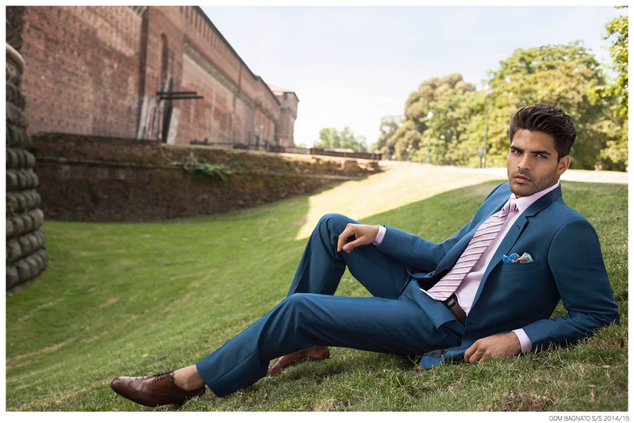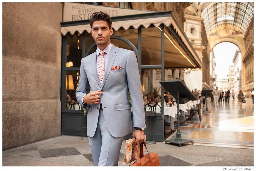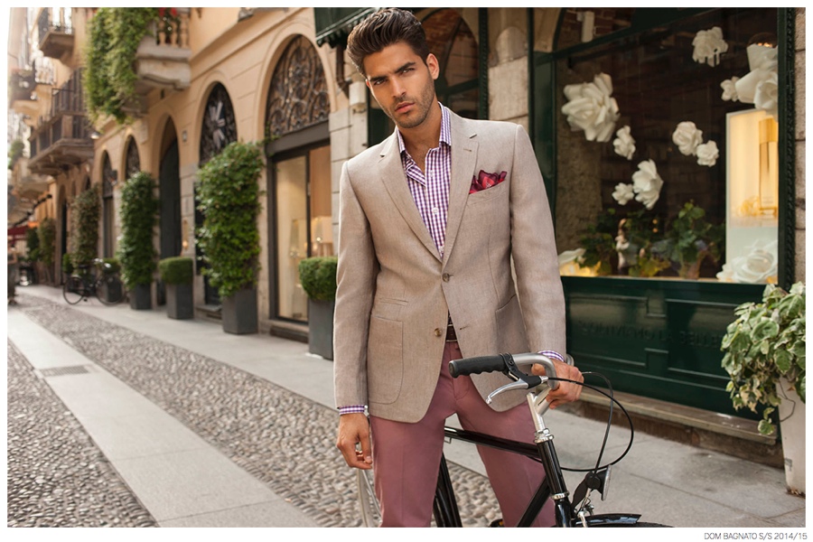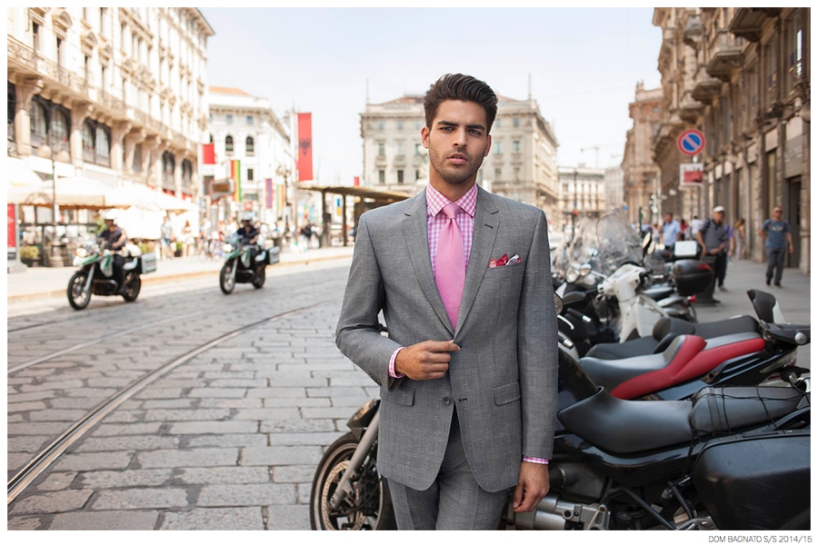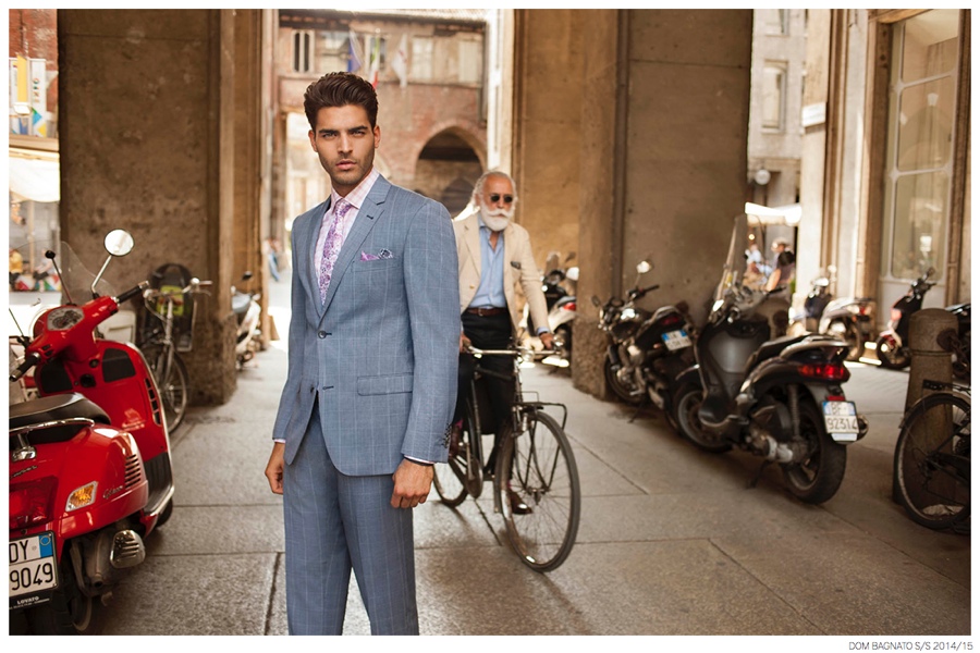 Dom Bagnato Spring/Summer 2015 Campaign-Inspired by the elegant tailored style of the modern Milanese man, Australian label Dom Bagnato visits Milano, Italy for its spring/summer 2014/15 campaign. Shot by fashion photographer James Pipino (Unsigned Management), model Mario Blanco is front and center, living up to the fashion capital’s renown style. Whether enjoying an outdoor restaurant or traveling by bicycle, Mario is kept in luxurious styles, sporting sharp, classic tailored suiting in an enticing array of tasteful, modern colors.