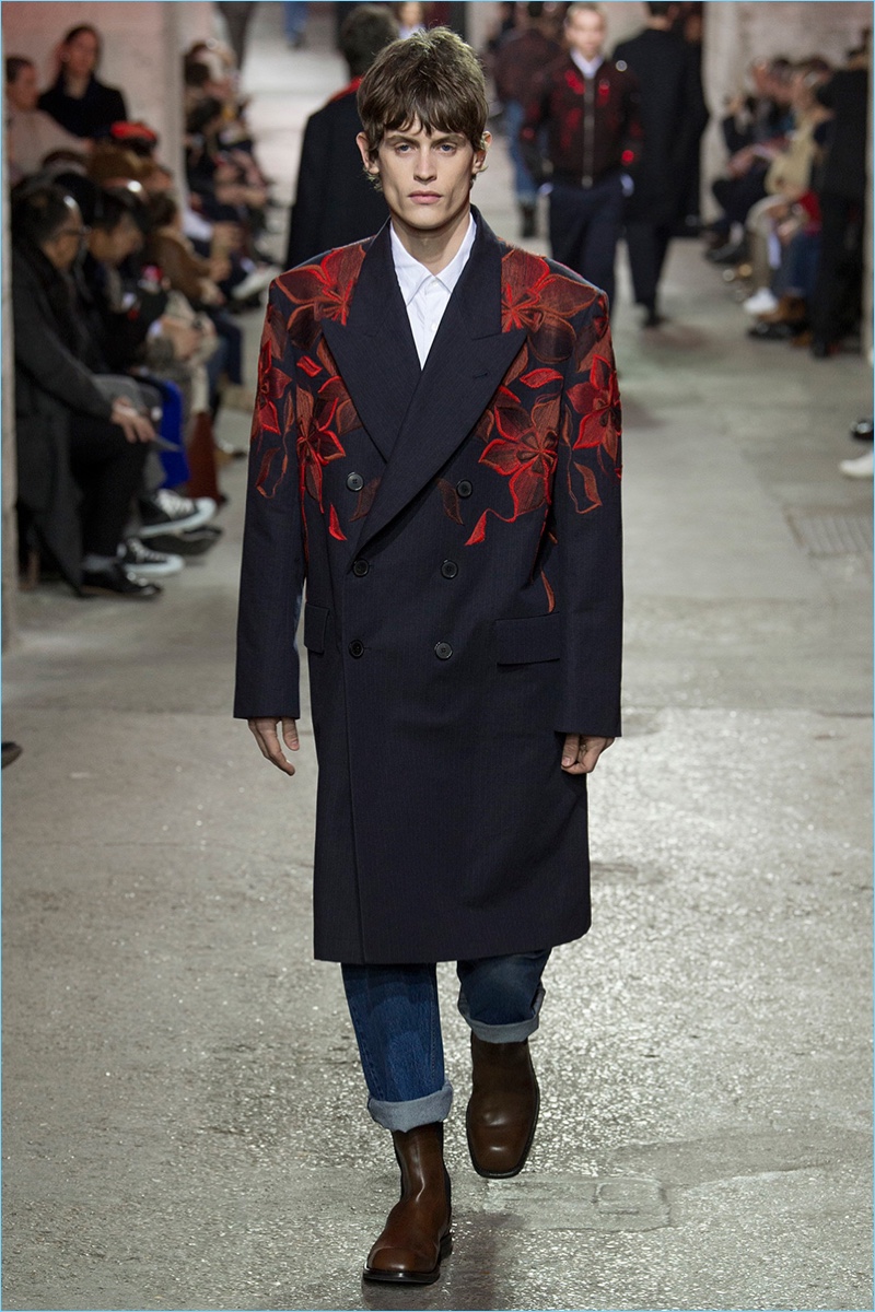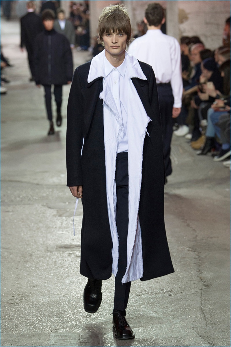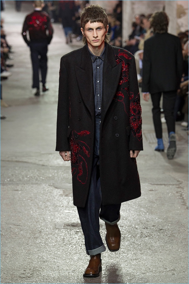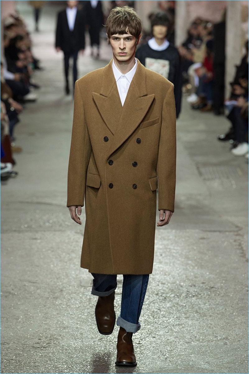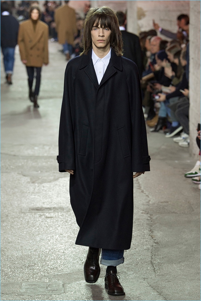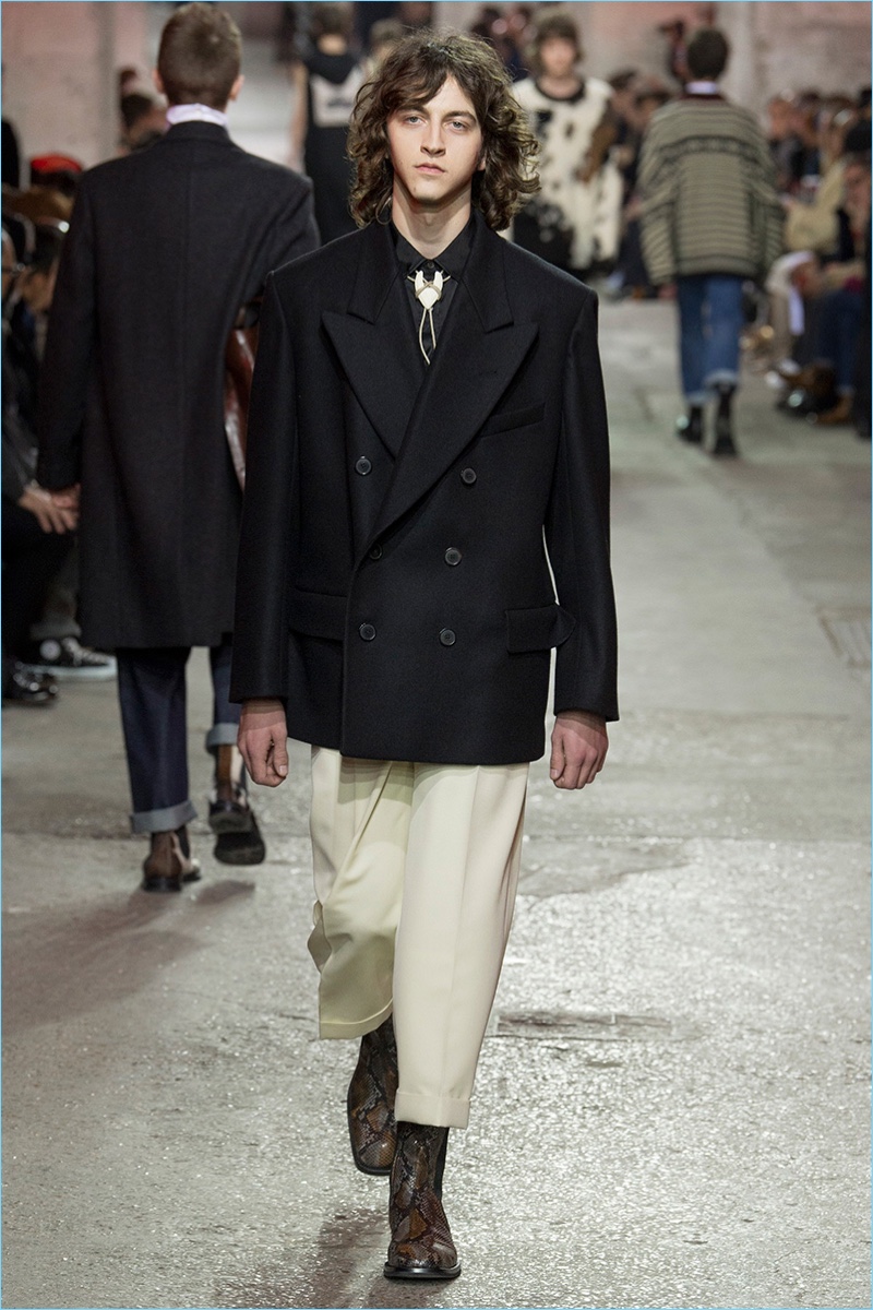On the heels of a heavily embellished season inspired by arts and crafts, Dries Van Noten circles back around to basics as the inspiration for his fall-winter 2017 men’s collection. The Belgian designer crafts an effortless lineup, which begins with an oversized but tapered take on the classic double-breasted coat.
