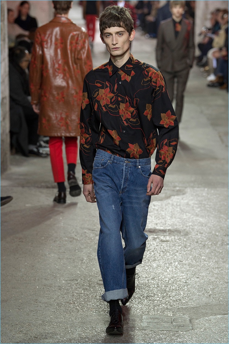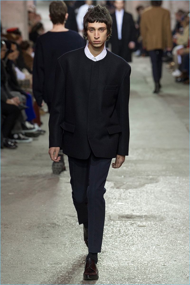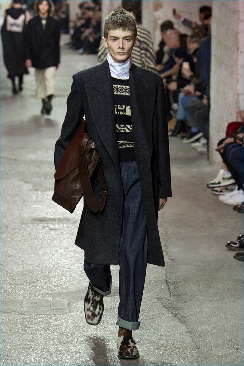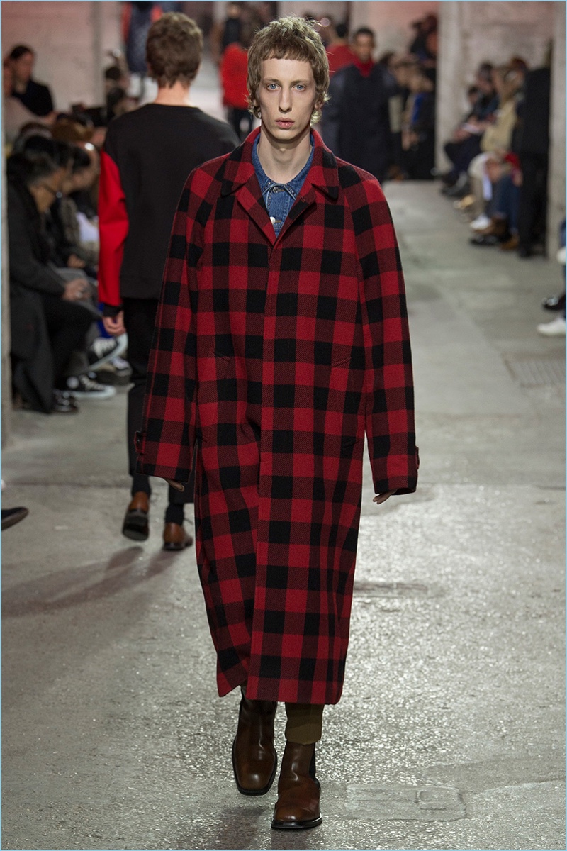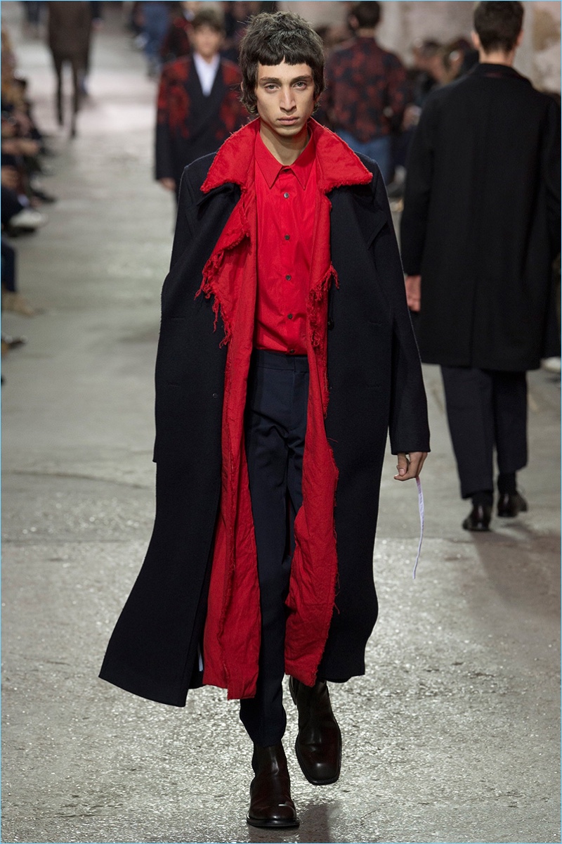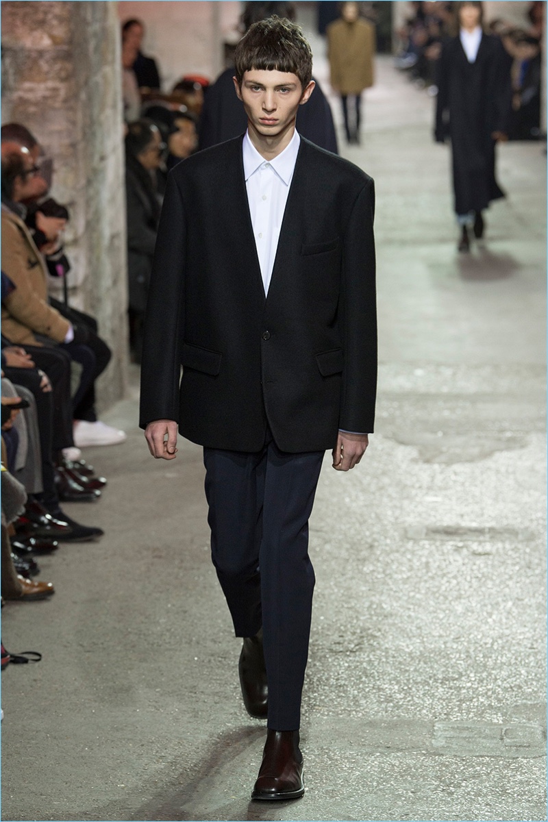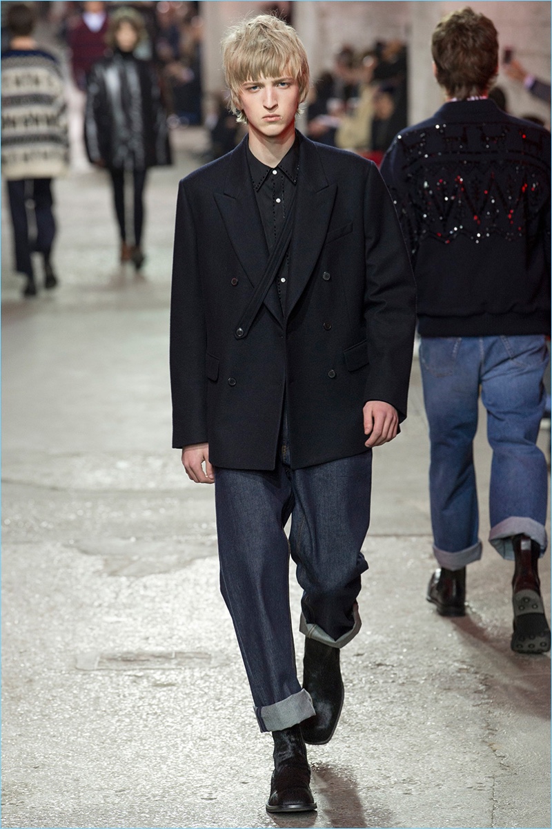 On the heels of a heavily embellished season inspired by arts and crafts, Dries Van Noten circles back around to basics as the inspiration for his fall-winter 2017 men’s collection. The Belgian designer crafts an effortless lineup, which begins with an oversized but tapered take on the classic double-breasted coat.