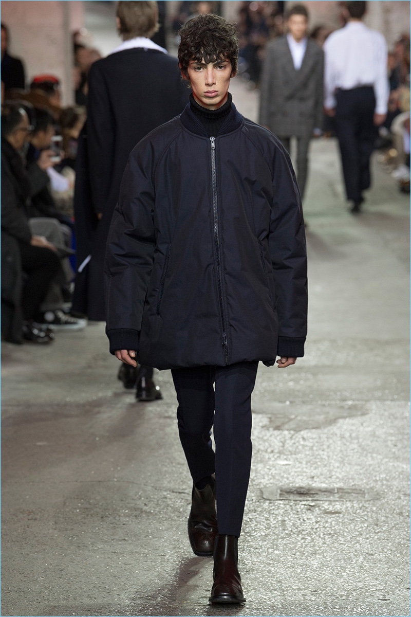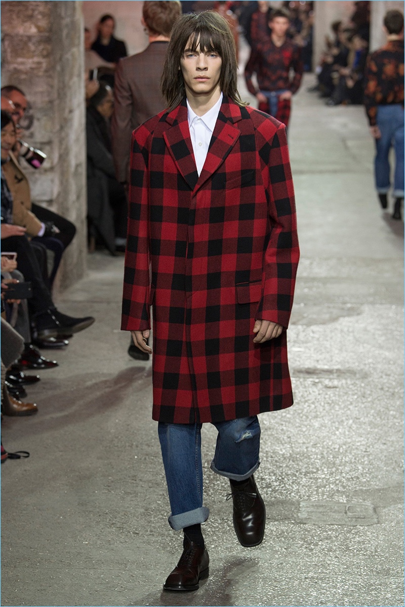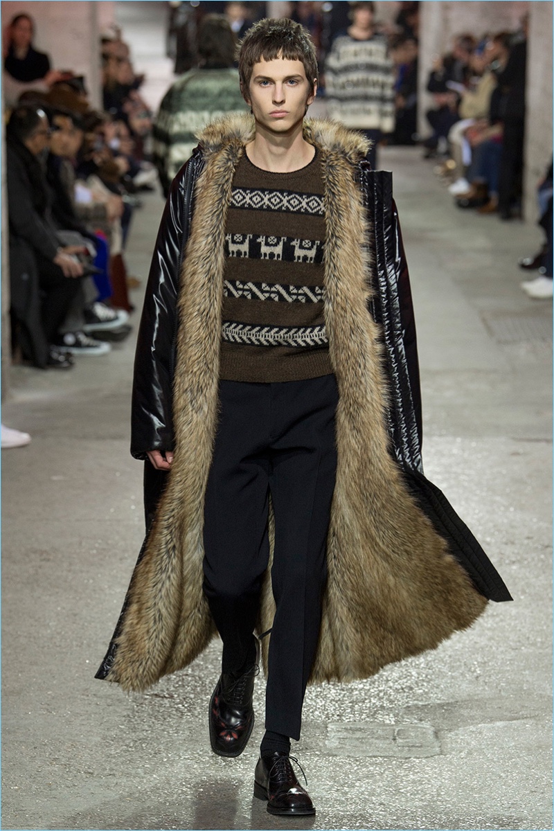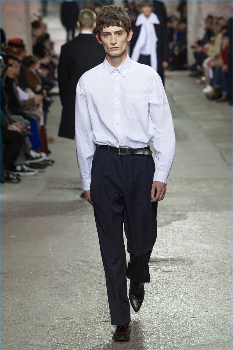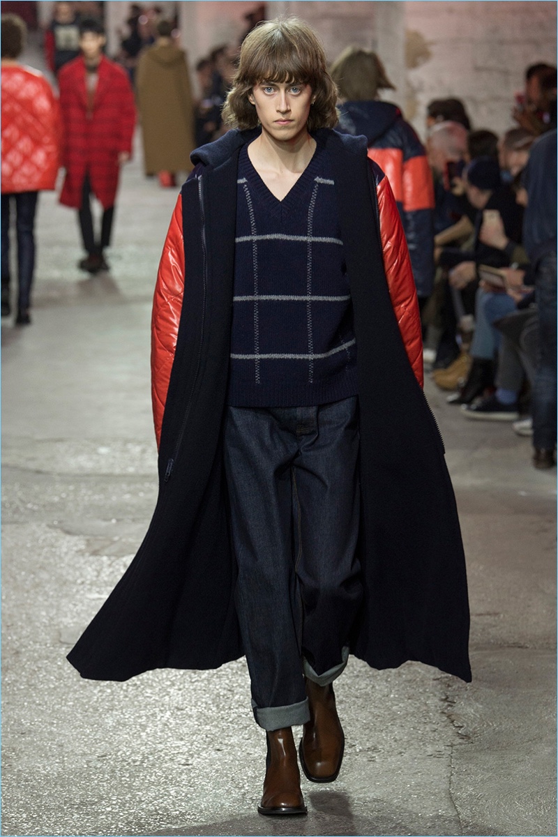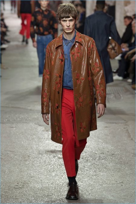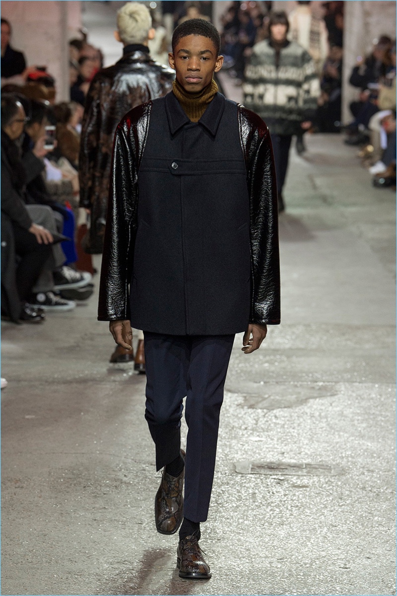 On the heels of a heavily embellished season inspired by arts and crafts, Dries Van Noten circles back around to basics as the inspiration for his fall-winter 2017 men’s collection. The Belgian designer crafts an effortless lineup, which begins with an oversized but tapered take on the classic double-breasted coat.