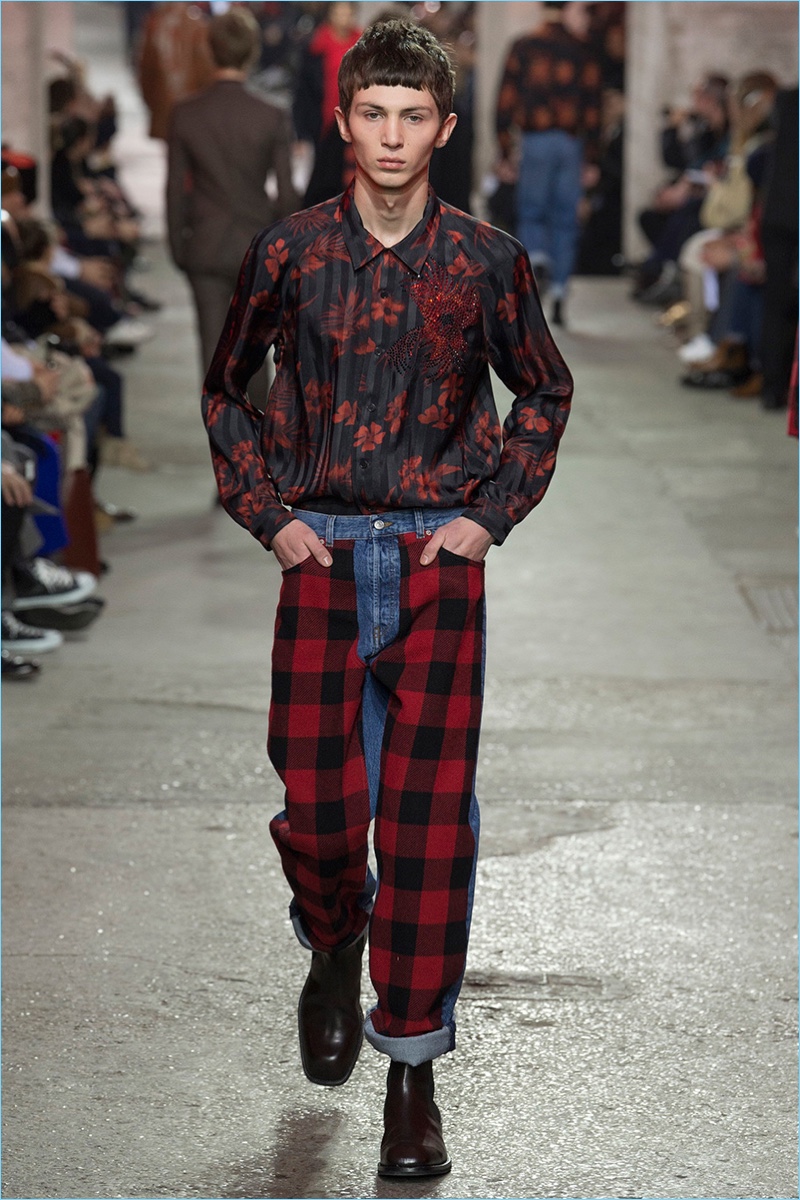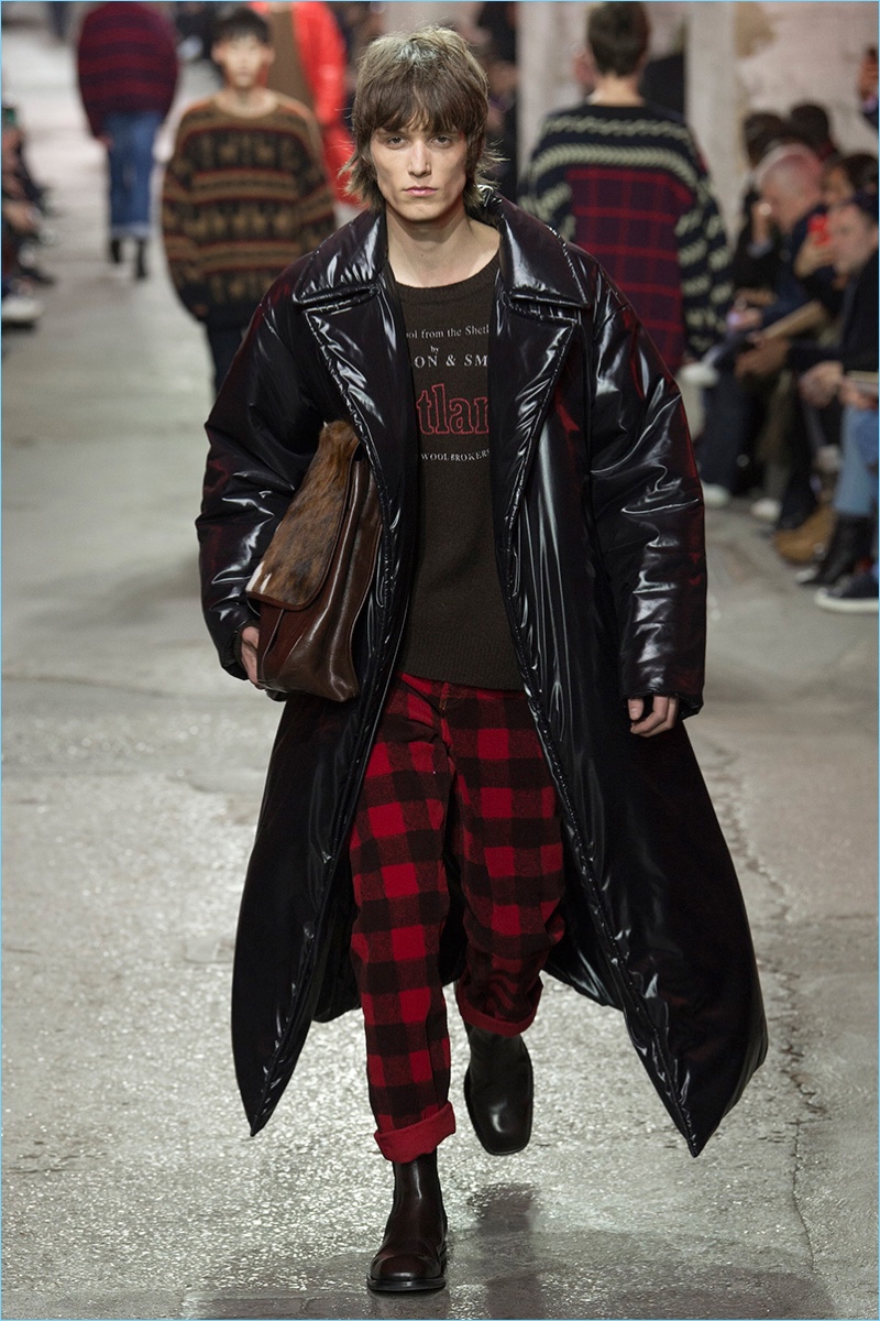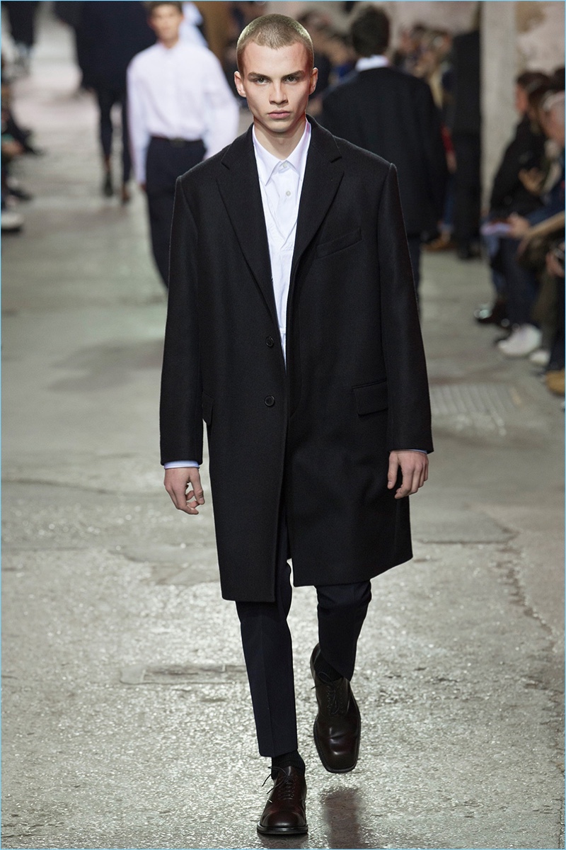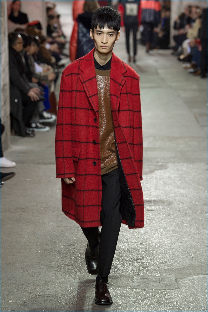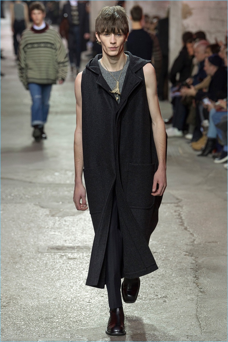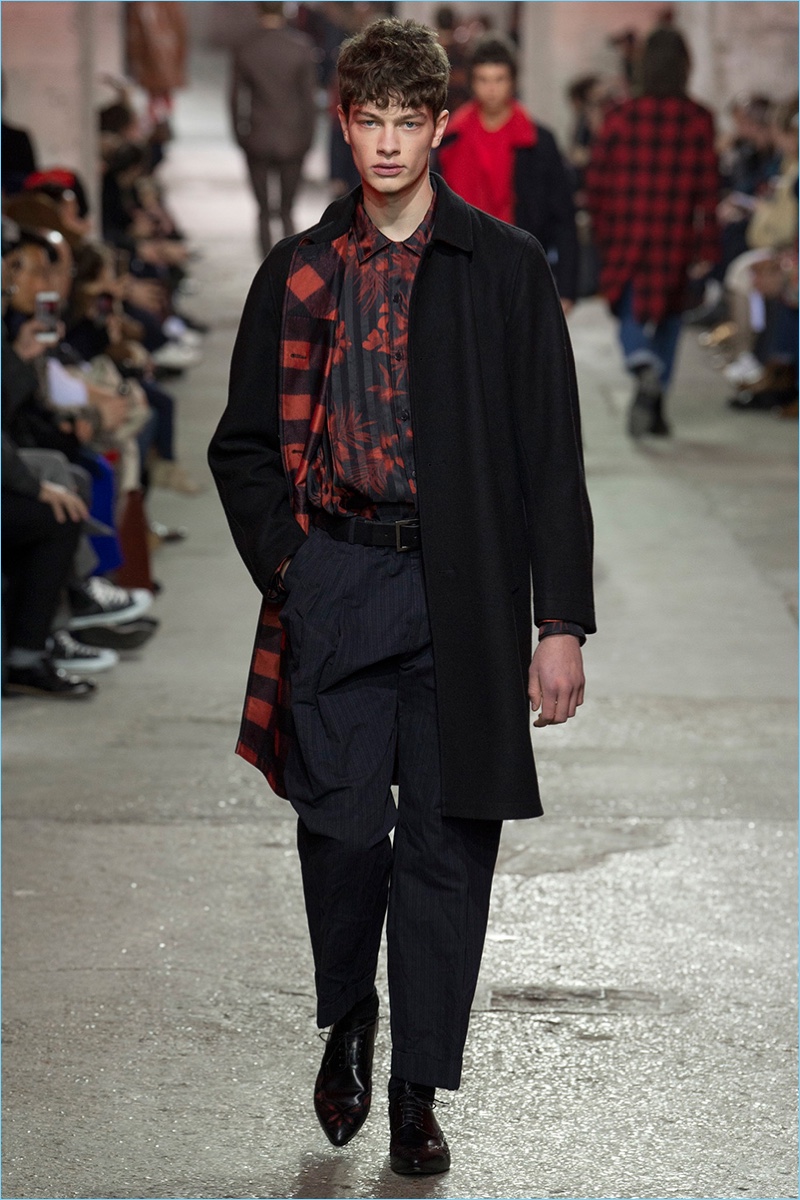 On the heels of a heavily embellished season inspired by arts and crafts, Dries Van Noten circles back around to basics as the inspiration for his fall-winter 2017 men’s collection. The Belgian designer crafts an effortless lineup, which begins with an oversized but tapered take on the classic double-breasted coat.