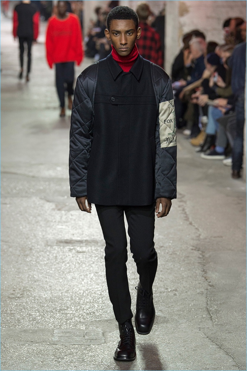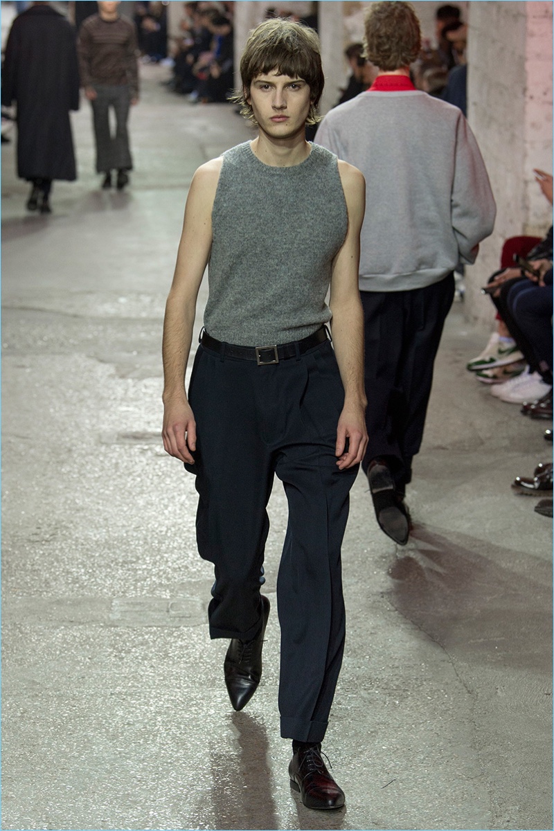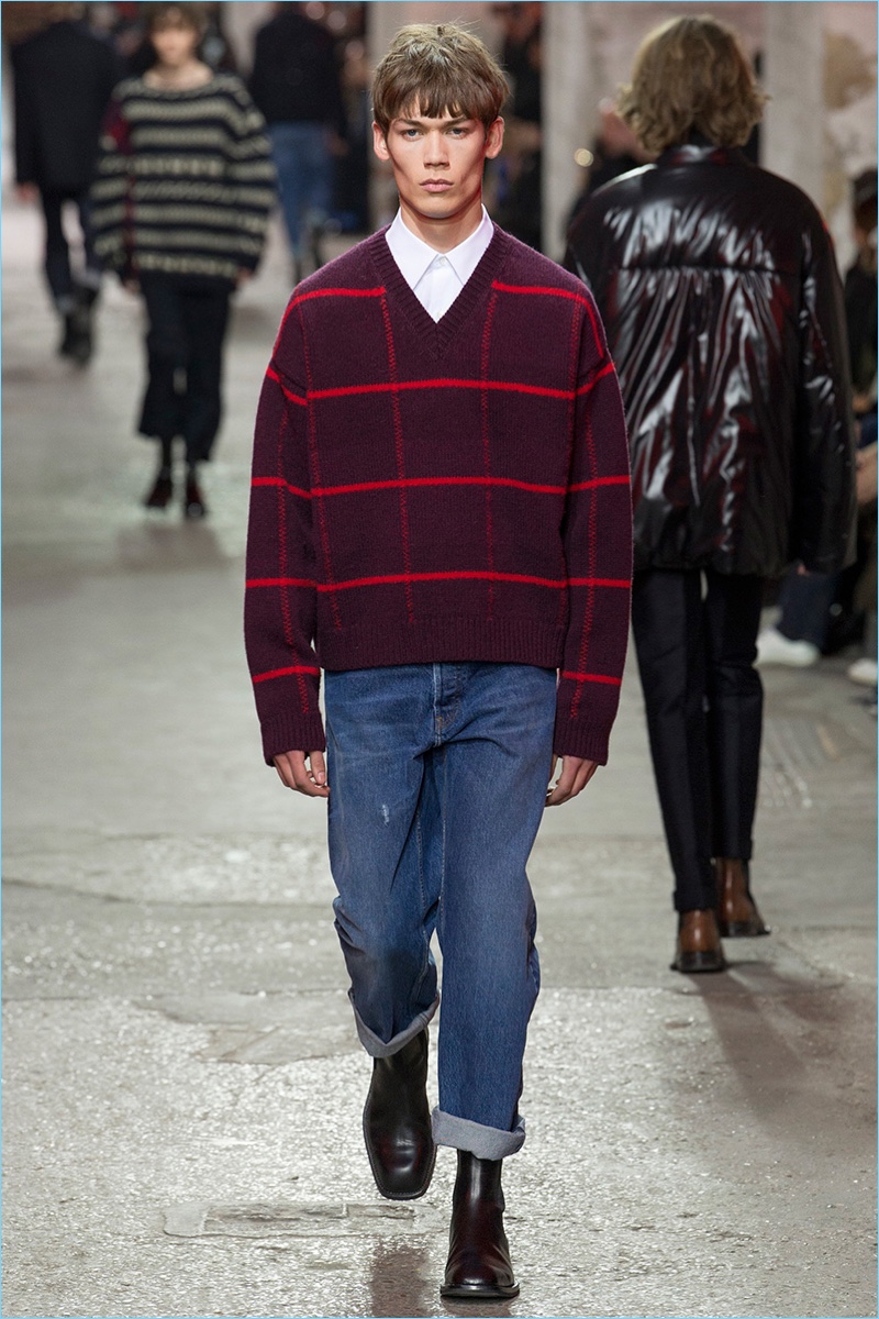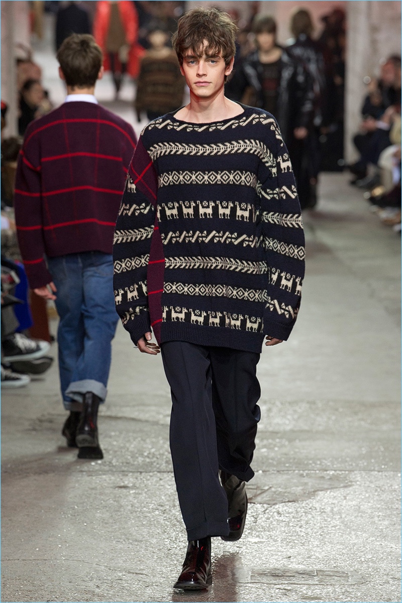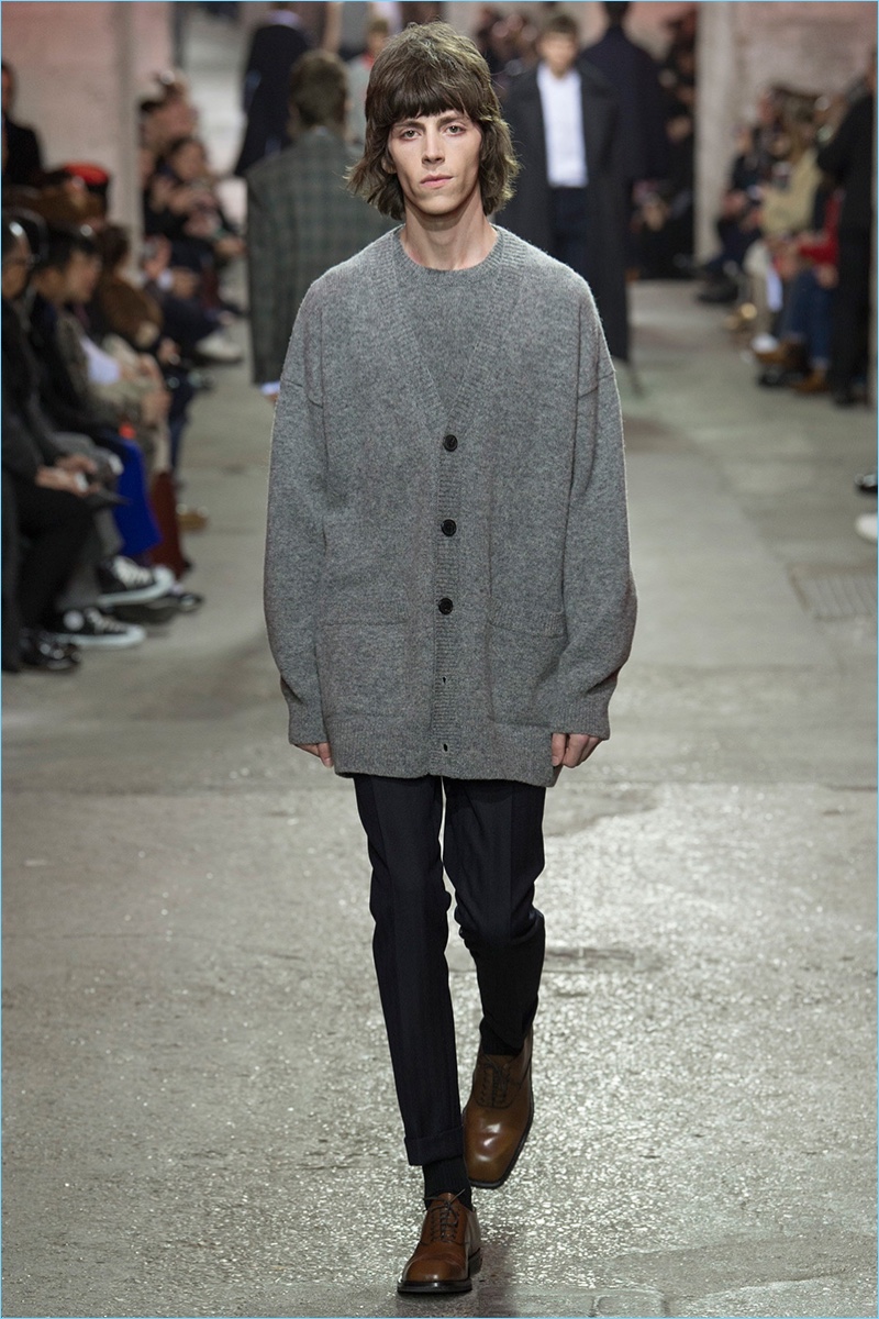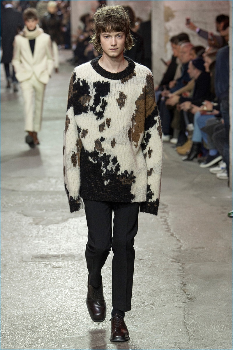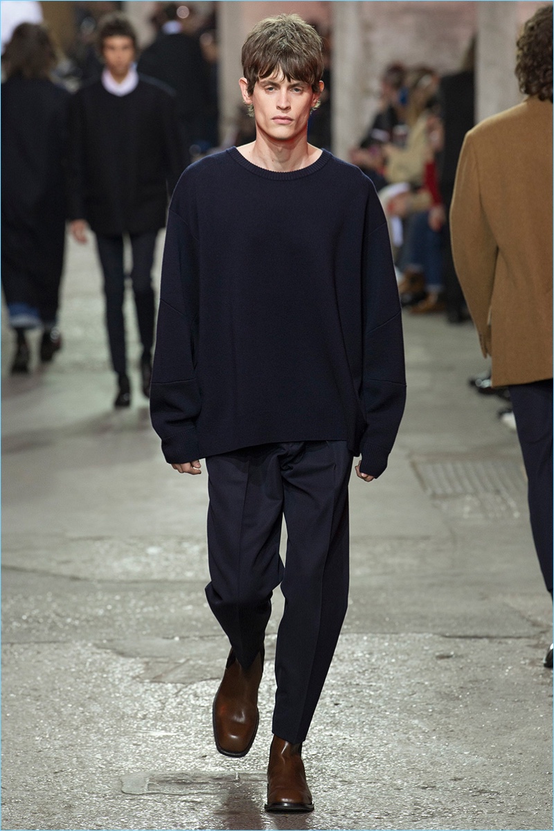 On the heels of a heavily embellished season inspired by arts and crafts, Dries Van Noten circles back around to basics as the inspiration for his fall-winter 2017 men’s collection. The Belgian designer crafts an effortless lineup, which begins with an oversized but tapered take on the classic double-breasted coat.