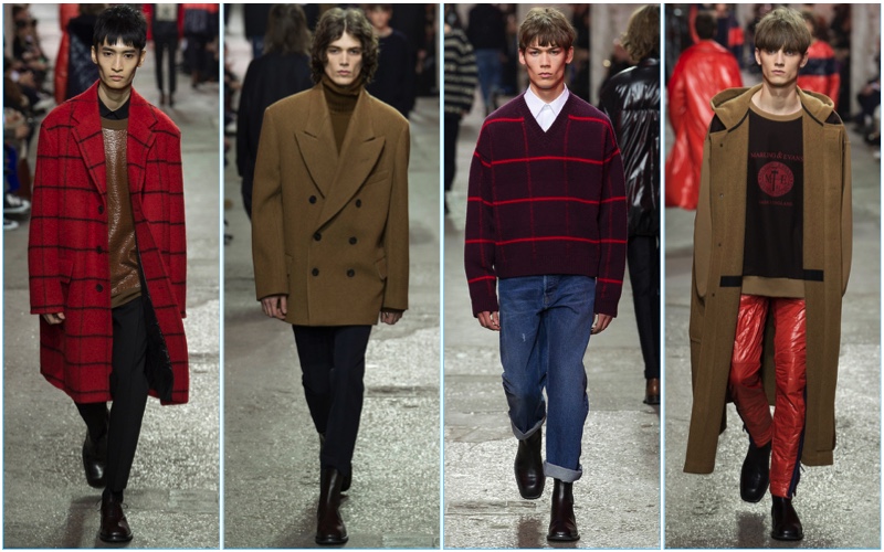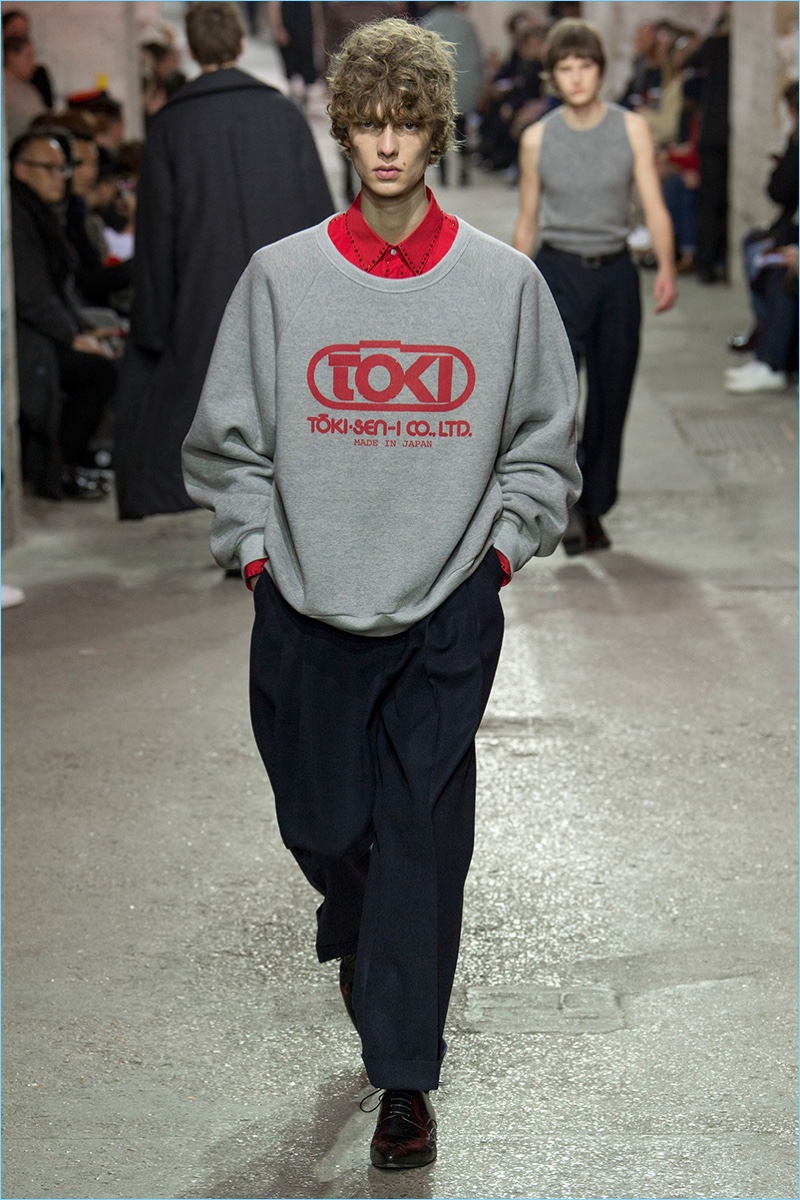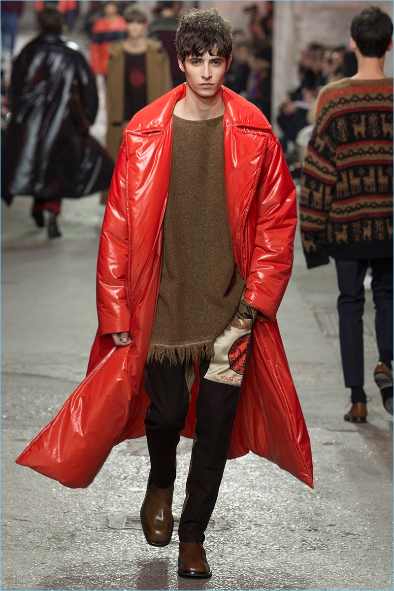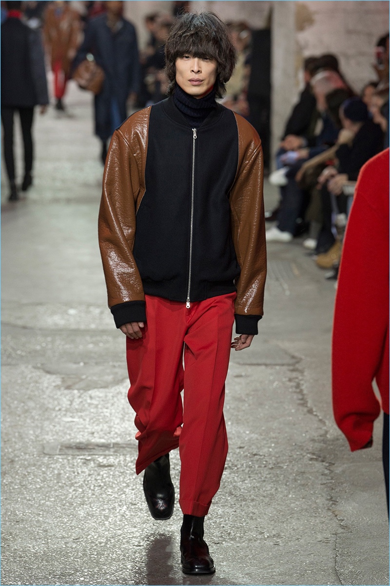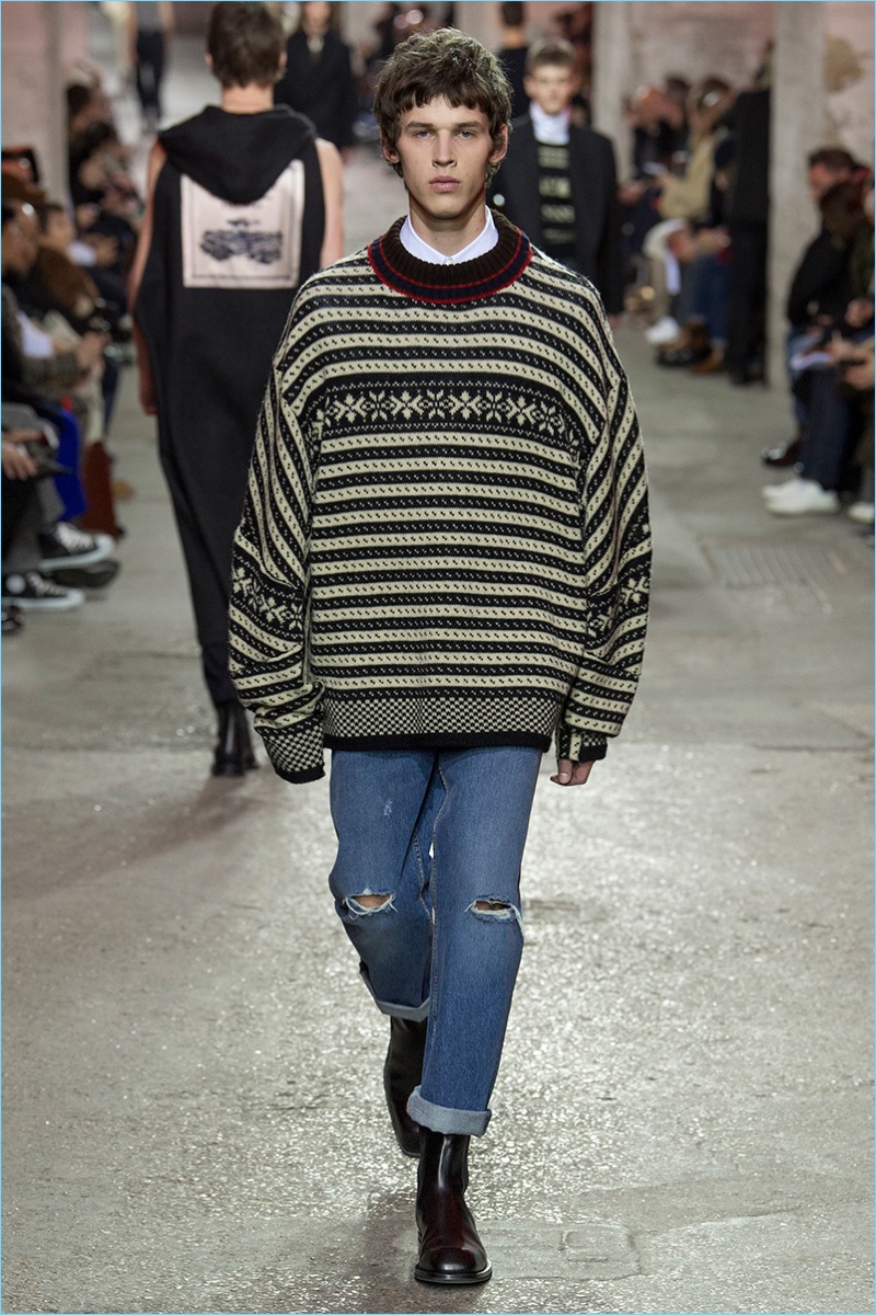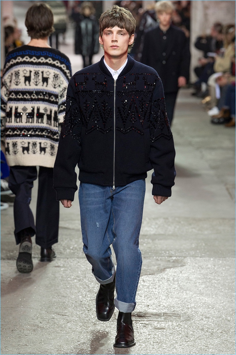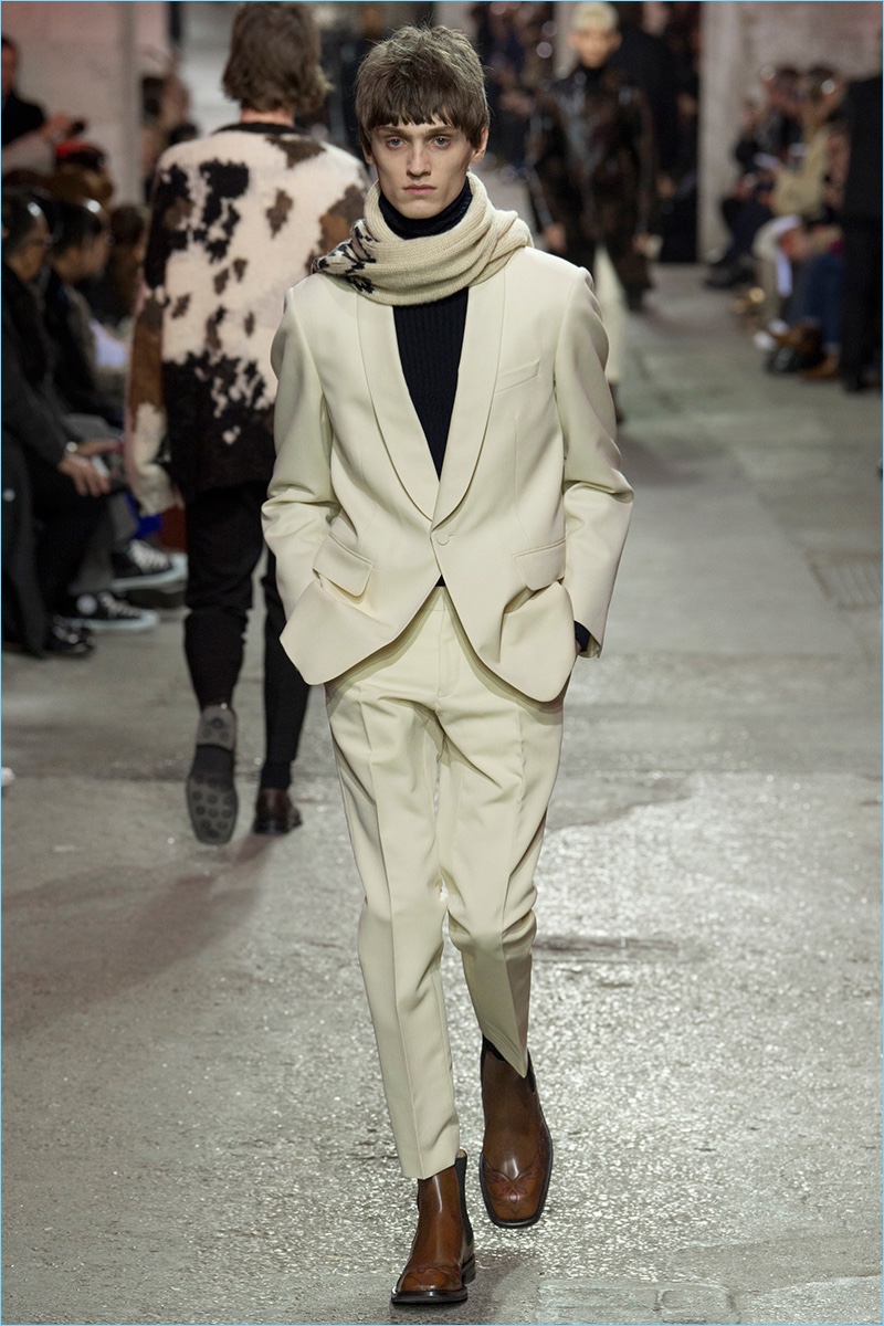 On the heels of a heavily embellished season inspired by arts and crafts, Dries Van Noten circles back around to basics as the inspiration for his fall-winter 2017 men’s collection. The Belgian designer crafts an effortless lineup, which begins with an oversized but tapered take on the classic double-breasted coat.