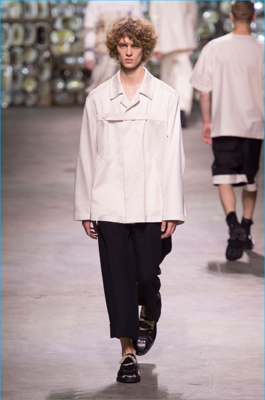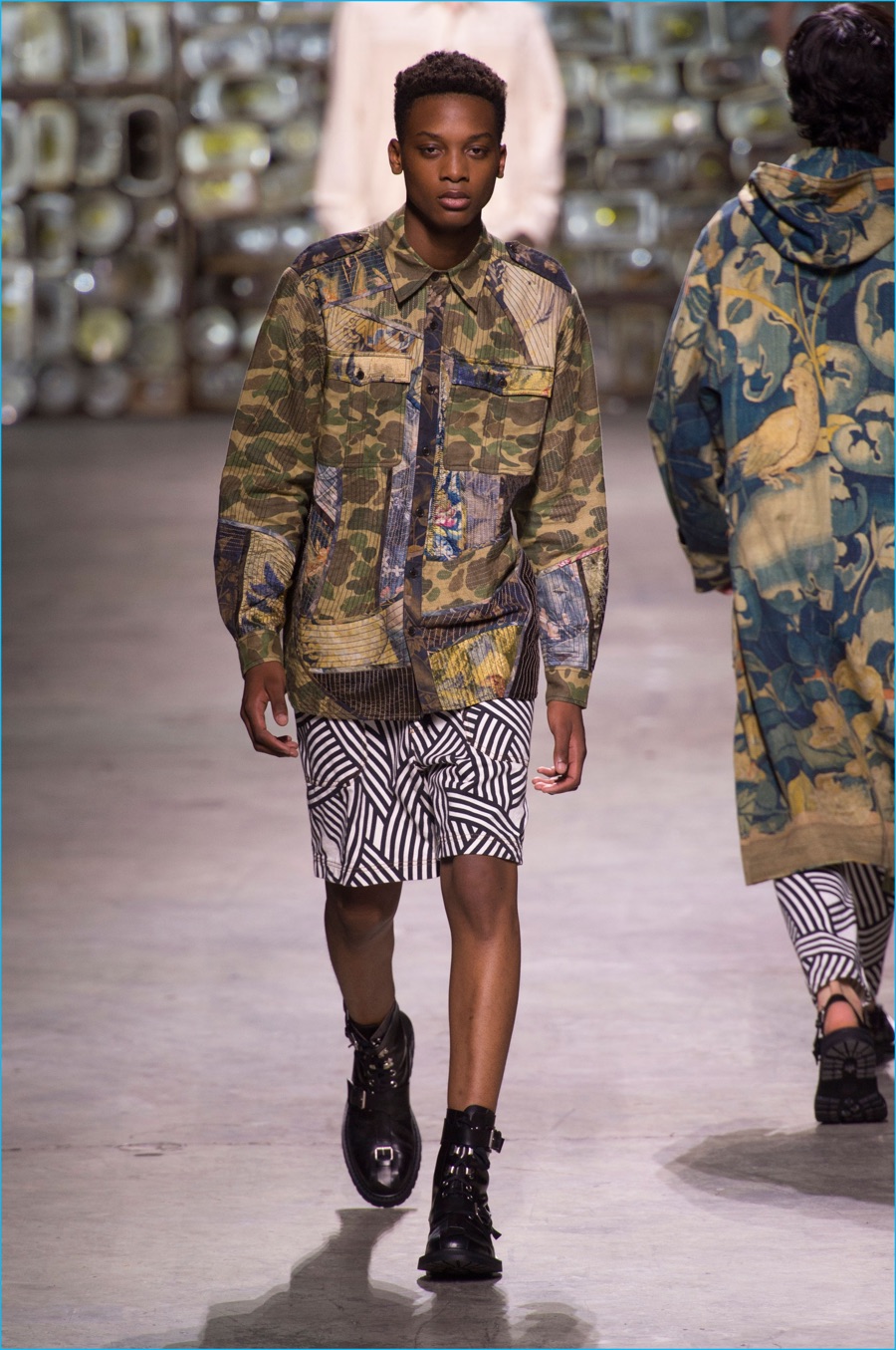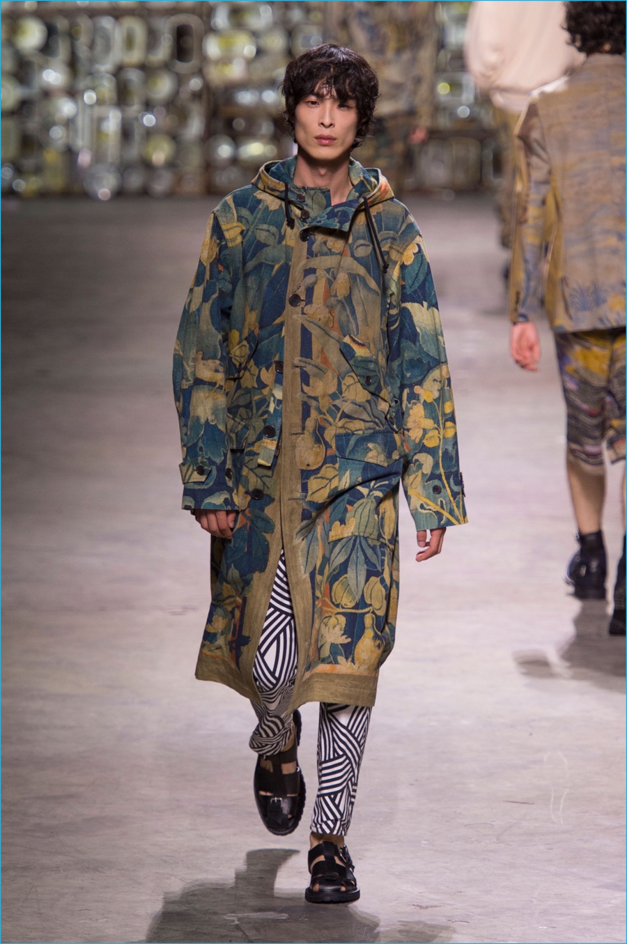 Bringing together graphic botanical prints with patchwork, Van Noten also revisited fabric art as well as textile artists of the 1960s and 70s. Traversing the centuries, the results unveiled an intricate tapestry. Bomber jackets, windbreakers and baggy shorts felt contemporary, while also playing to the collection’s romantic views of art. Here oversized trench coats and wide-cut trousers acted as a canvas, complementing boxy tees with patched together textile prints, frayed knit sweaters and camouflage fashions.