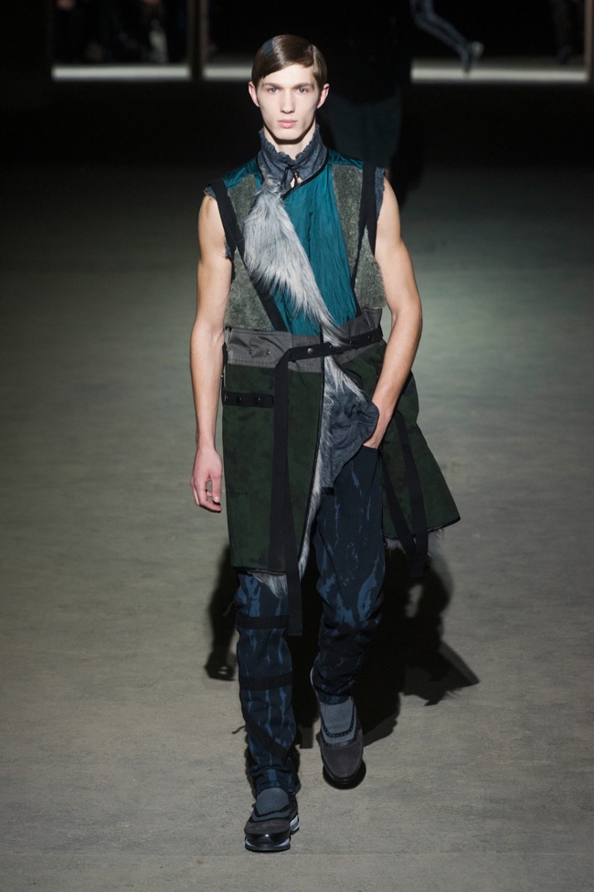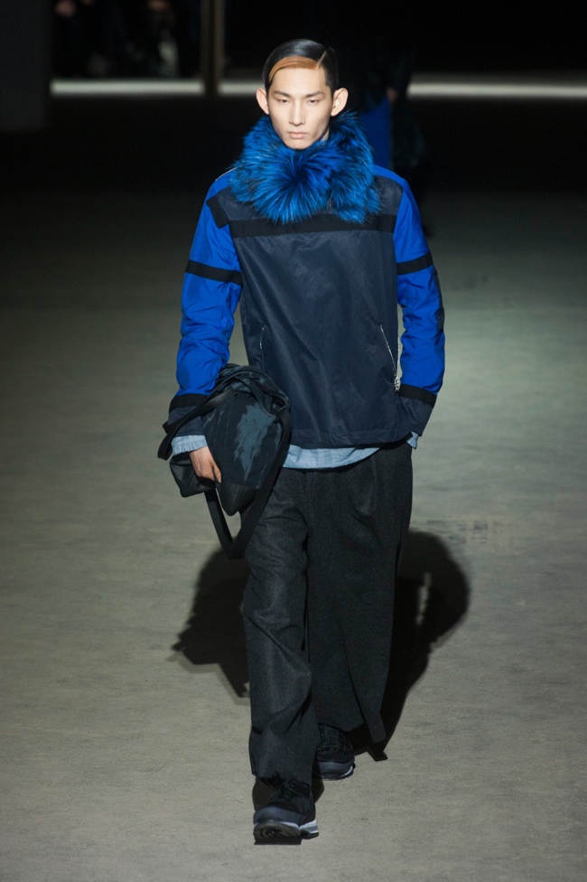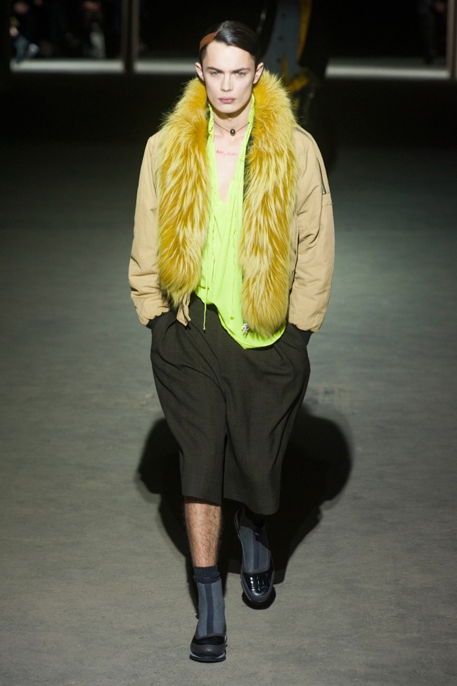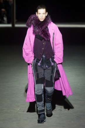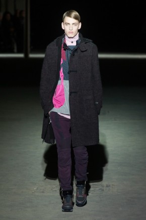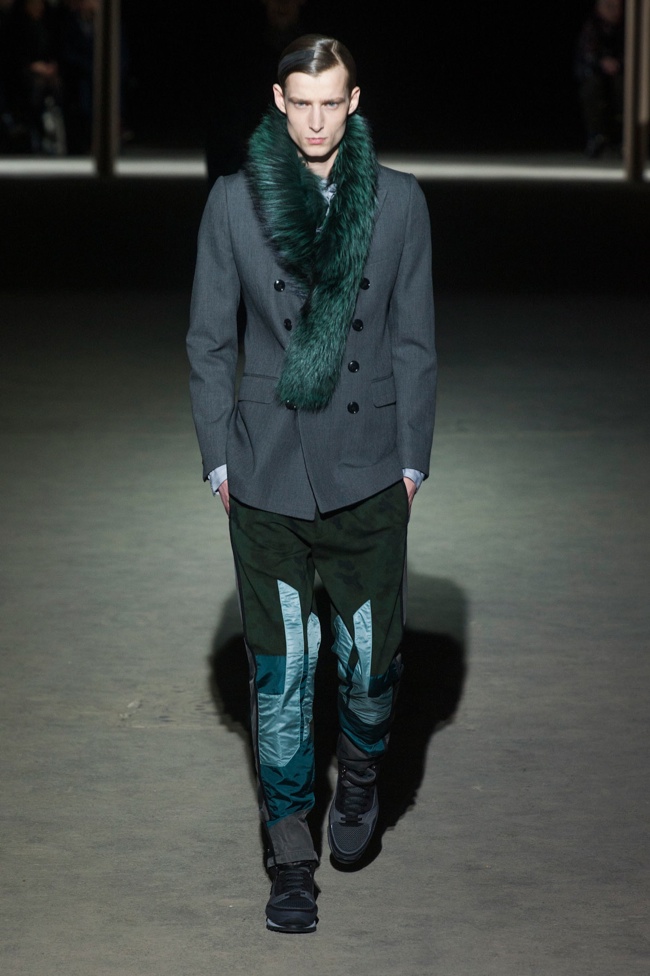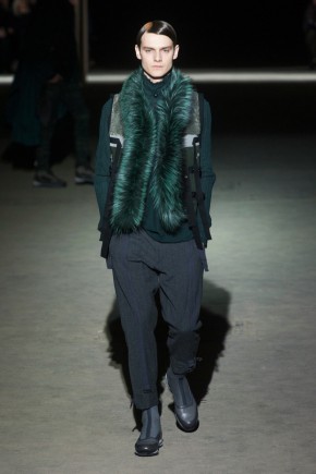 Dries Van Noten Fall/Winter 2014–Albeit a tad late, the streetwear trend arrived at Dries Van Noten with the Belgian designer lending his elegant character more approachable fashions. As models took the runway with their manes slicked back and patches of hair colored, Van Noten unveiled a color story, composed of modern solutions to the men’s wardrobe. Showcasing various degrees of luxury, bombers, parkas and other current essentials were paraded in varying colors and fabrications. Relaxed, the collection’s proportions really shined with trousers and coats decorated with tie-dye prints.