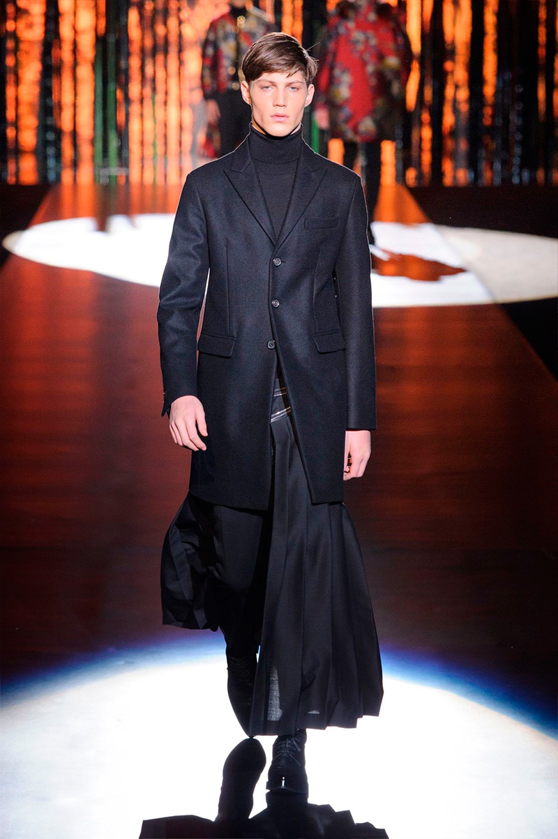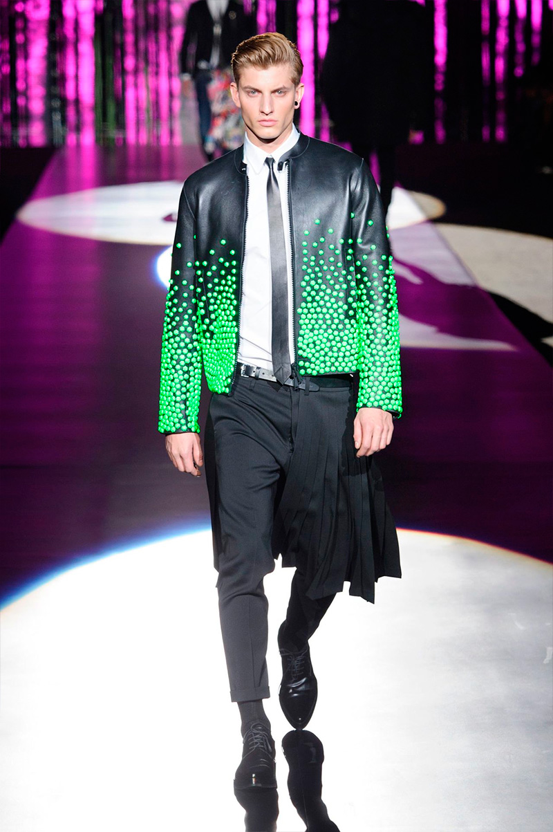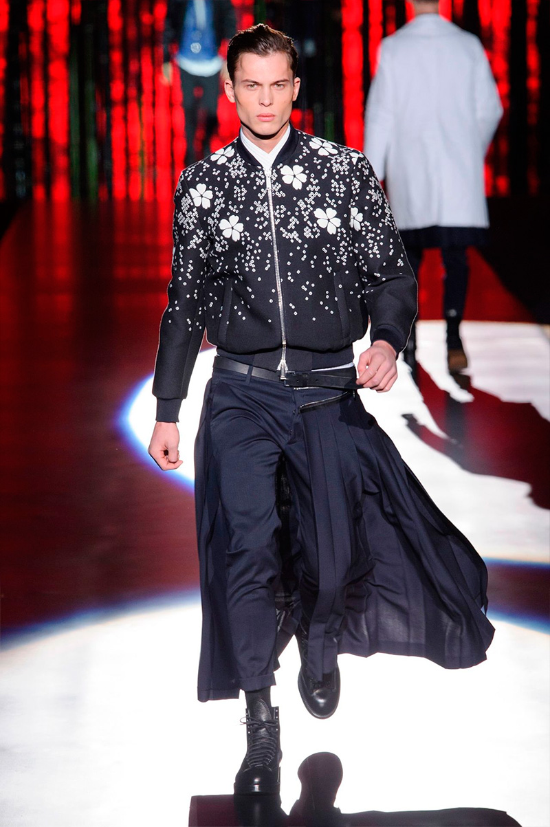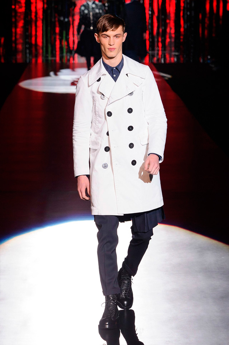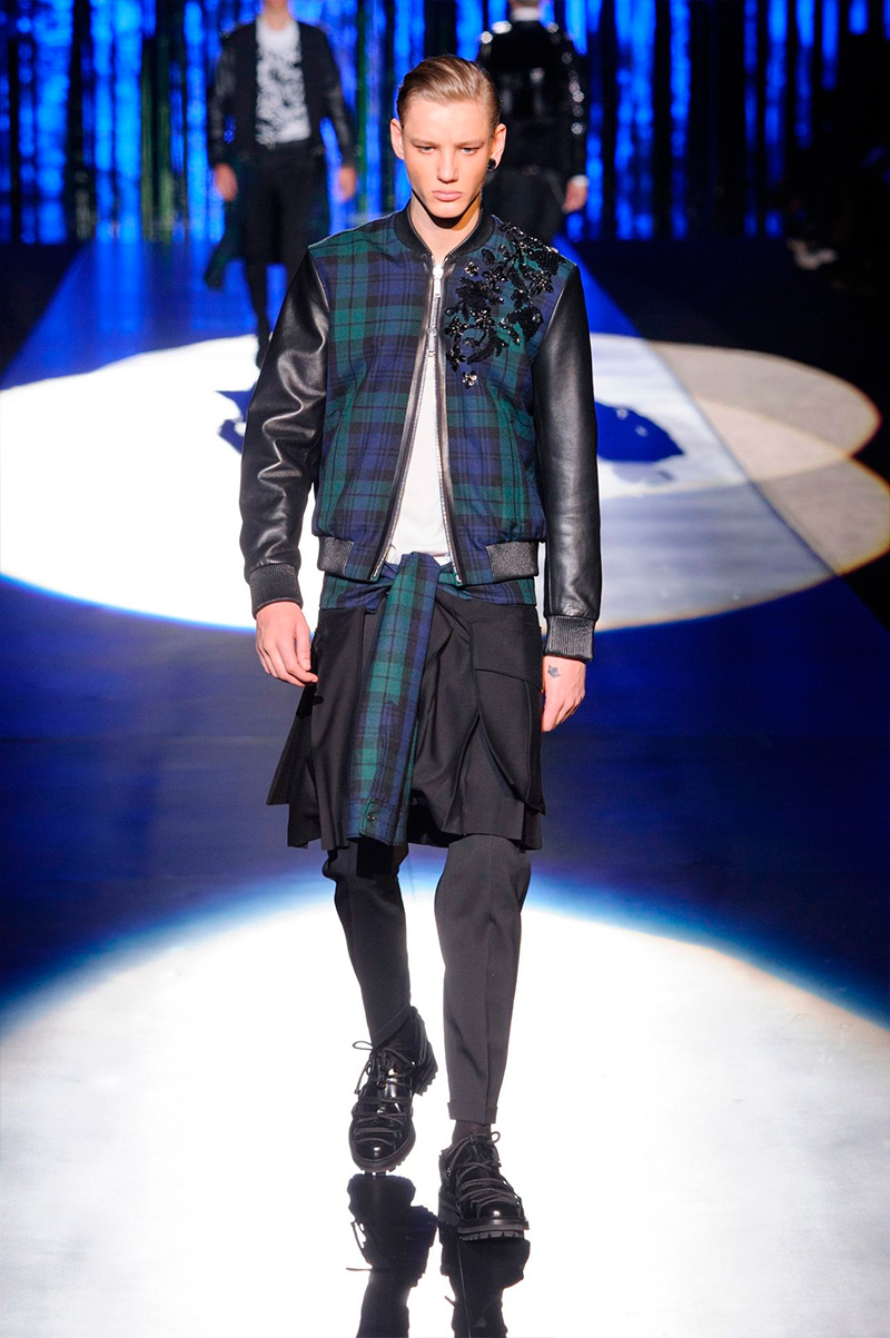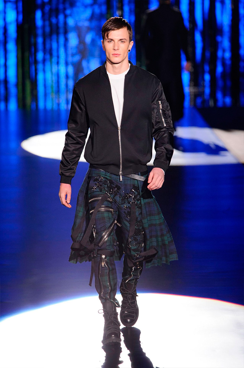 PinBomber jackets are elongated for Dsquared2’s fall-winter 2016 men’s collection and complement pleated kilts.