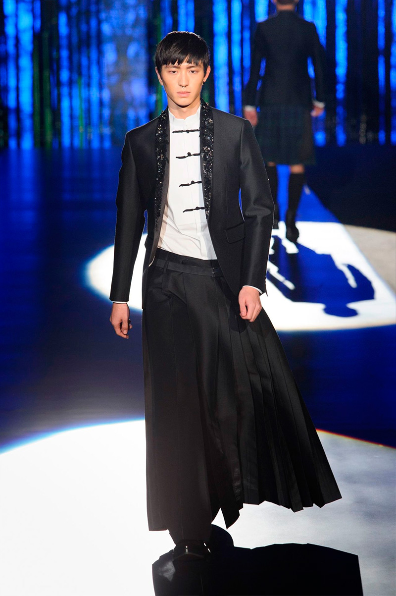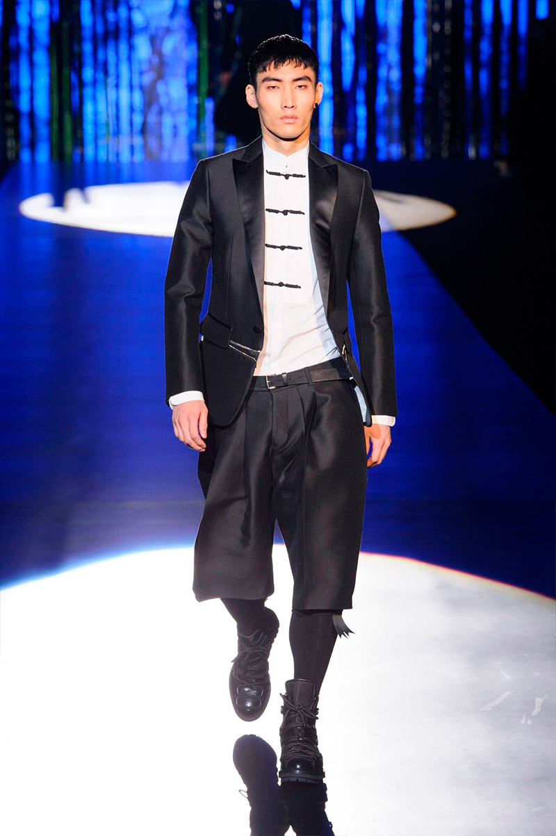 For the Dsquared2 man, this meant a relaxed approach to denim, ushering in a lineup of baggy jeans and mandarin collared denim shirts. Pleated kilts, asymmetrical jackets, elongated bomber jackets and relaxed silk pants contributed to the fusion of cultures. Standout pieces for the collection included parkas dressed in Geishas, oversized coats, lined in metallic silver and eveningwear that mixed plaid with the sequined macabre.