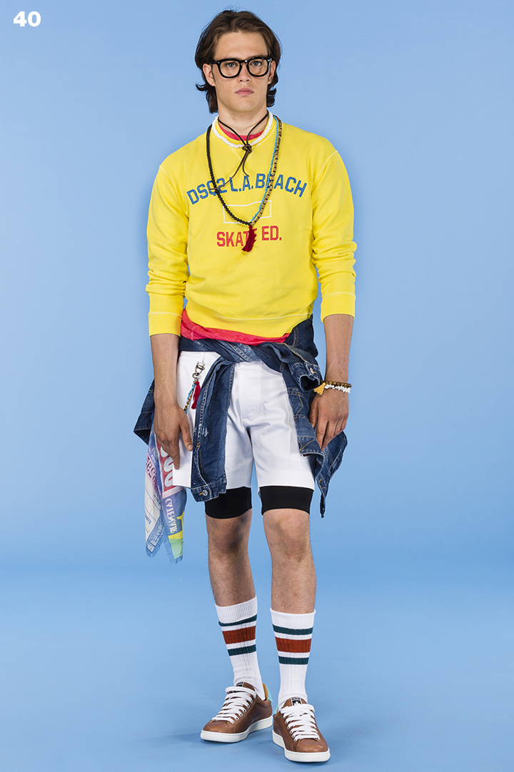 Dsquared2 revisits popular youth themes with its pre-spring 2016 men’s collection. Channeling a skater boy moment, Dsquared2 delivers colorful logo sweatshirts, graphic tees, cotton shorts, and casual sneakers. Extending the range by referencing the surfer, the label goes the way of the beach bum.