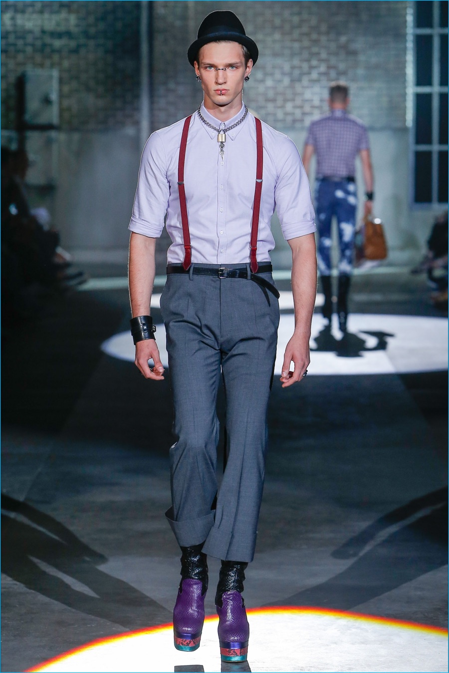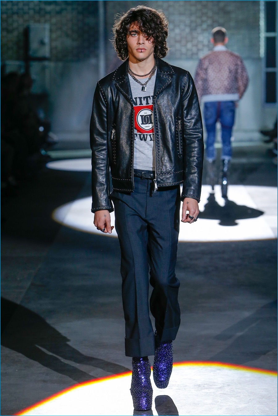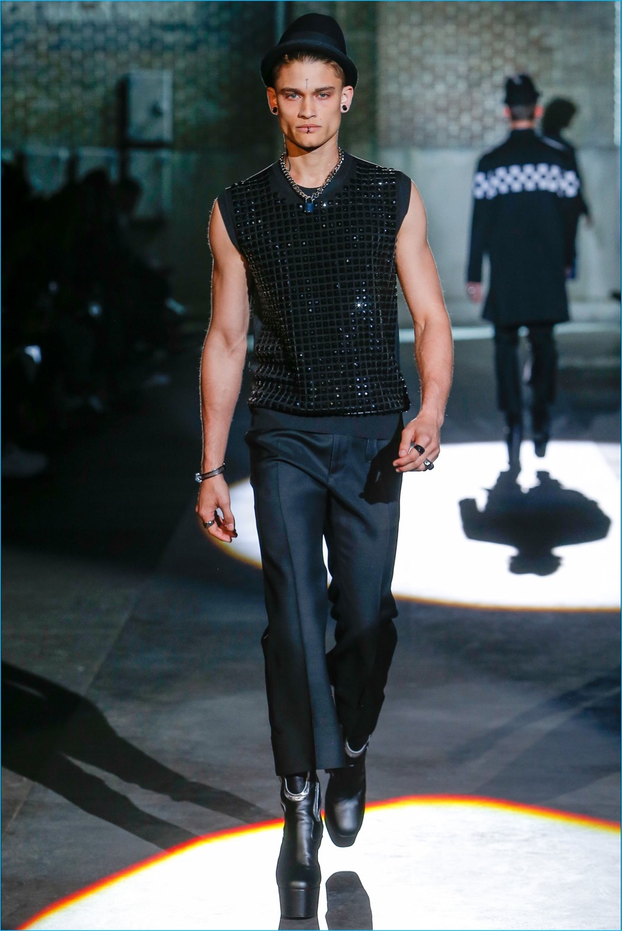 Dsquared2 creative directors Dan and Dean Caten dreamt up a British style narrative with their spring-summer 2017 men’s collection. Sending the models down the catwalk in platforms, the Caten brothers set the stage for a splashy season. Adding to a lineup of time tested staples that included patched denim jackets, mesh tanks, ripped jeans, graphic t-shirts and sequined bomber jackets, Dsquared2’s man took a walk on the wild side. Championing skinhead style, fitted polo shirts, suspender tops, bleached denim and metallic pants were juxtaposed with English inspired tailoring for yet another cheeky season from Dsquared2.