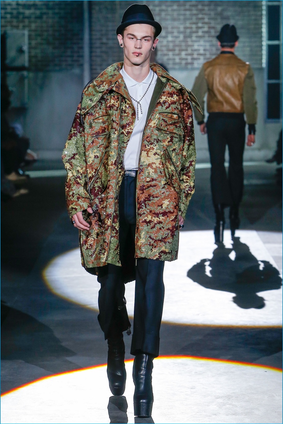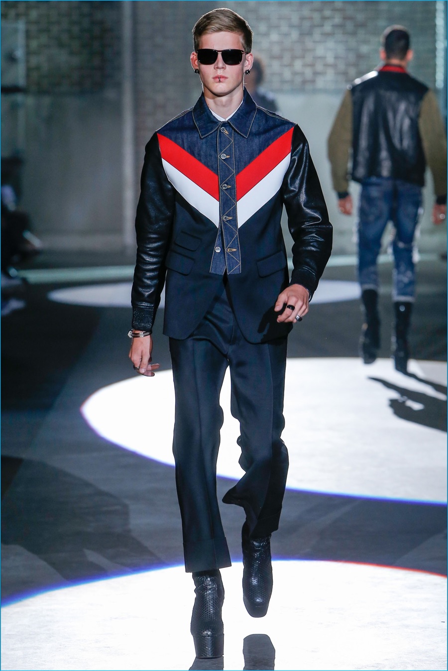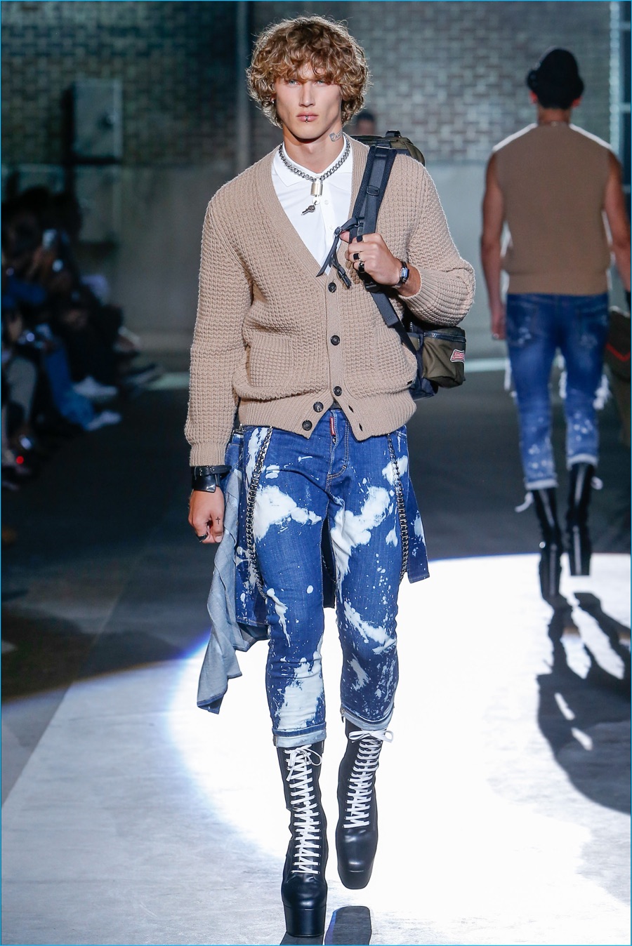 Dsquared2 creative directors Dan and Dean Caten dreamt up a British style narrative with their spring-summer 2017 men’s collection. Sending the models down the catwalk in platforms, the Caten brothers set the stage for a splashy season. Adding to a lineup of time tested staples that included patched denim jackets, mesh tanks, ripped jeans, graphic t-shirts and sequined bomber jackets, Dsquared2’s man took a walk on the wild side. Championing skinhead style, fitted polo shirts, suspender tops, bleached denim and metallic pants were juxtaposed with English inspired tailoring for yet another cheeky season from Dsquared2.