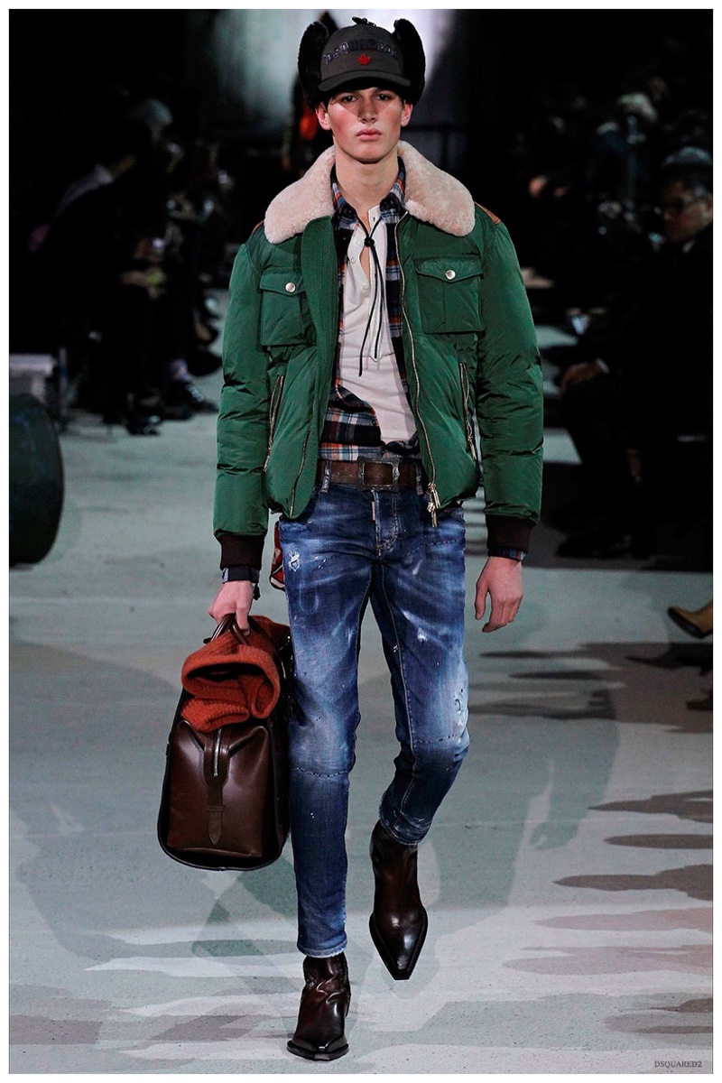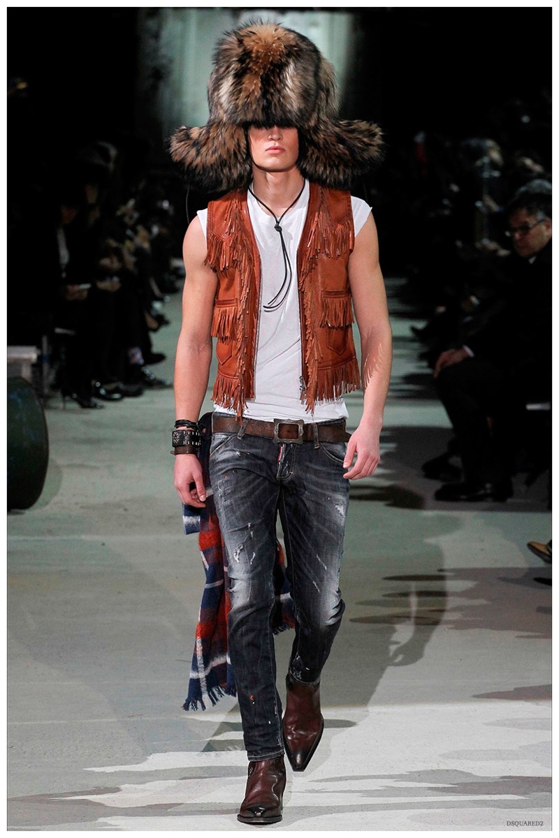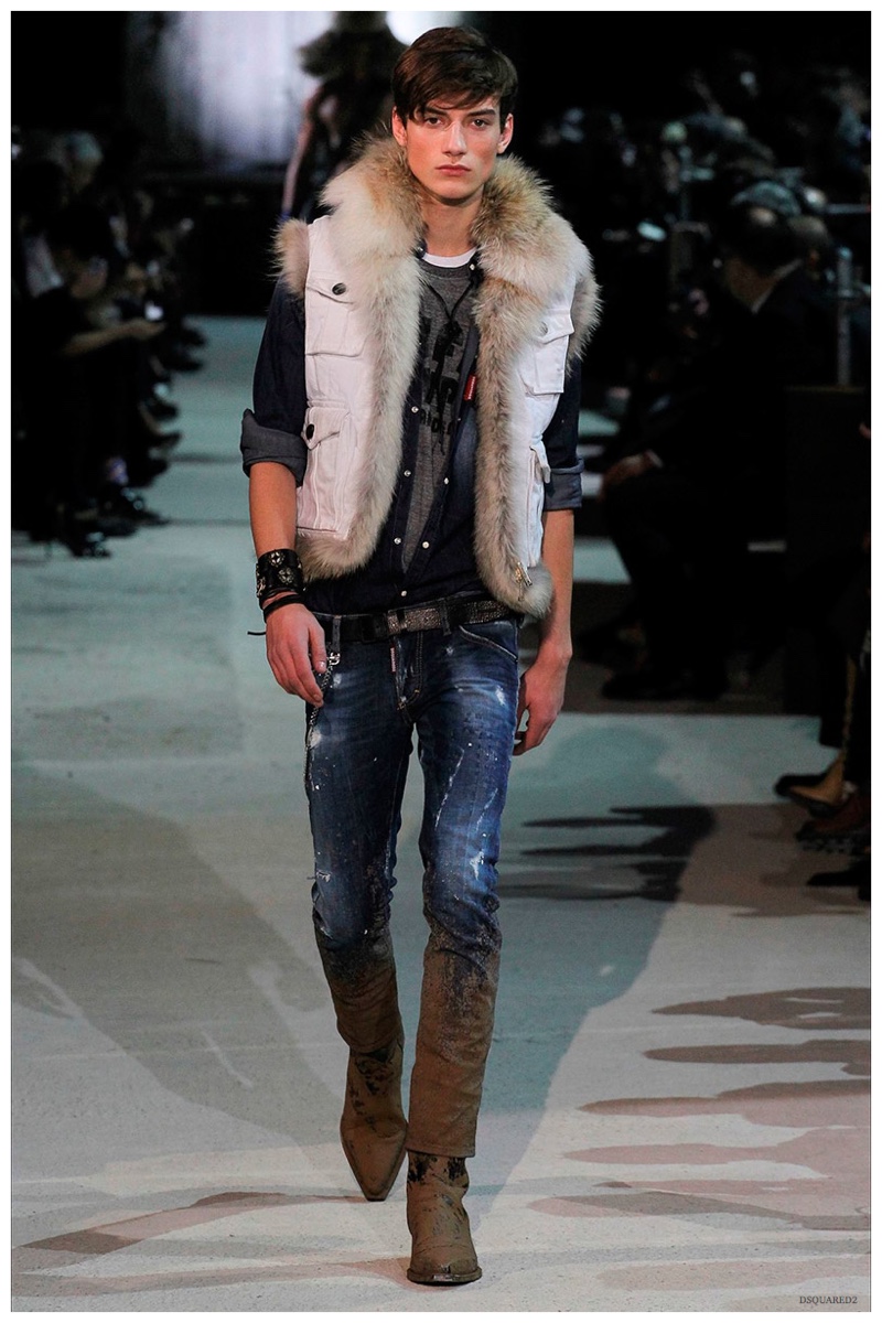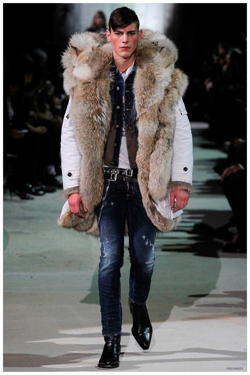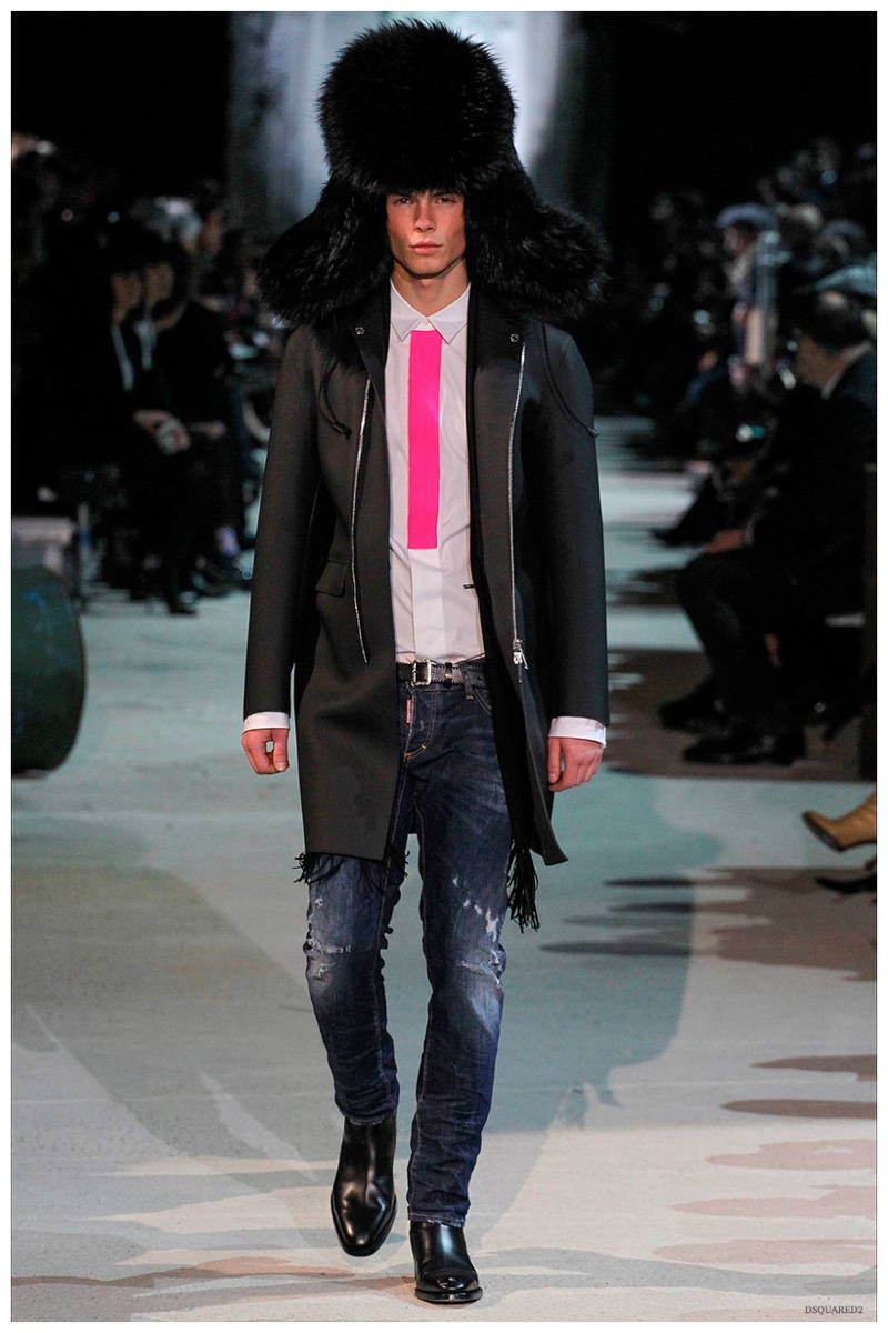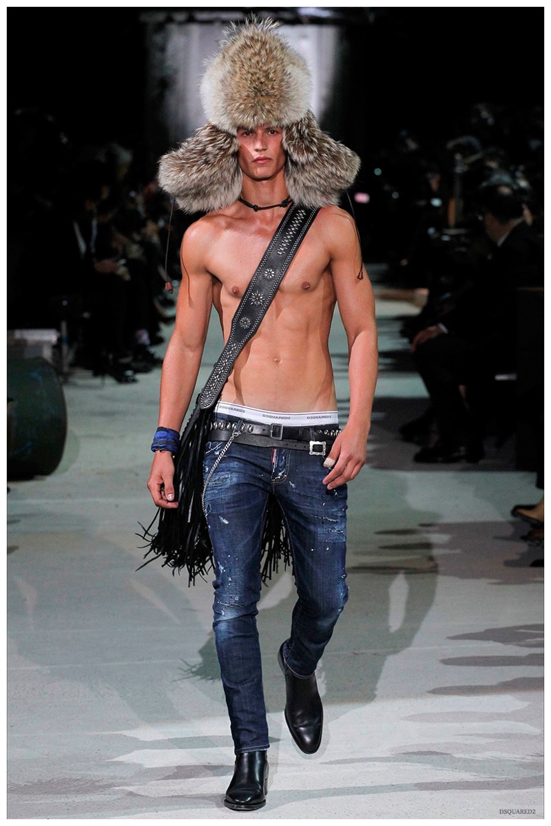 Dsquared2 typically shows its collections on the last day of Milan Fashion Week, but this year was different. Celebrating their 20 year anniversary, twin designing brothers Dan and Dean Caten, opened fashion week with a runway presentation that easily read like a greatest hits. The flamboyant Dsquared2 man, exuding glamour and a rock ‘n’ roll cool was in fine form. Skinny, distressed denim jeans were belted low on the hips and a parade of Dsquared2 essentials delighted. There were oversized parkas, printed, slim-fit button-downs, leather jackets, quilted vests and more. They may have been showing fall, but the Caten brothers also paid homage to the shirtless models in denim they have become known for–fur trapper cap anyone?