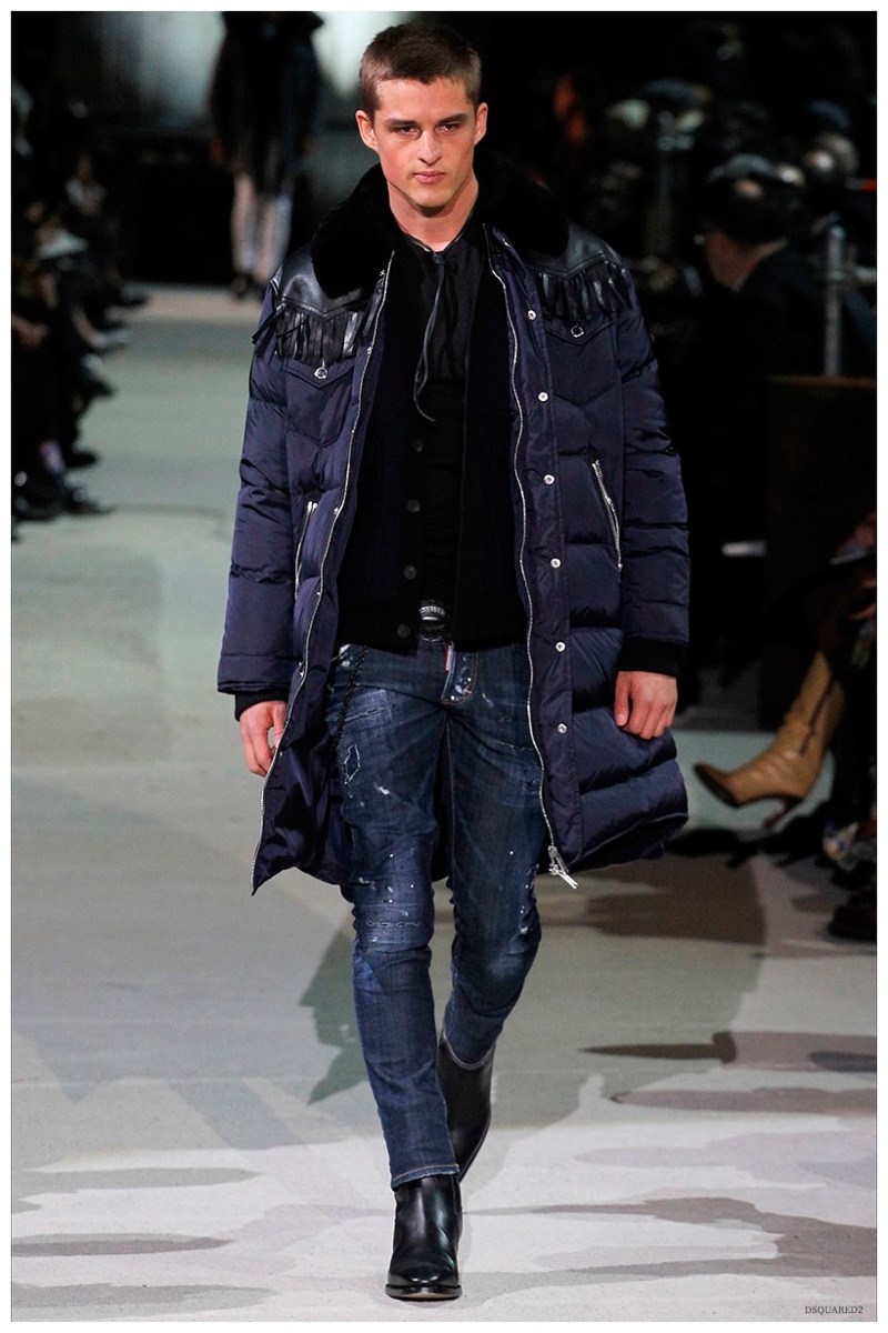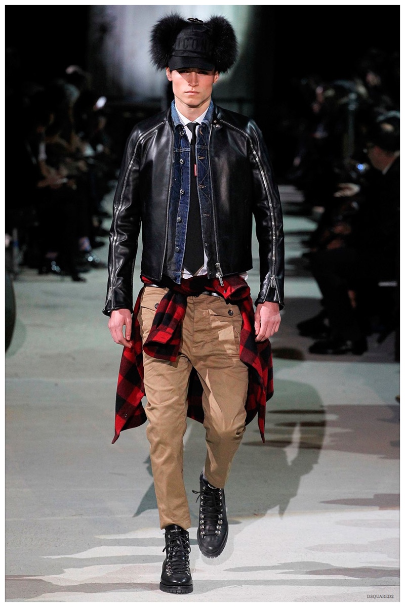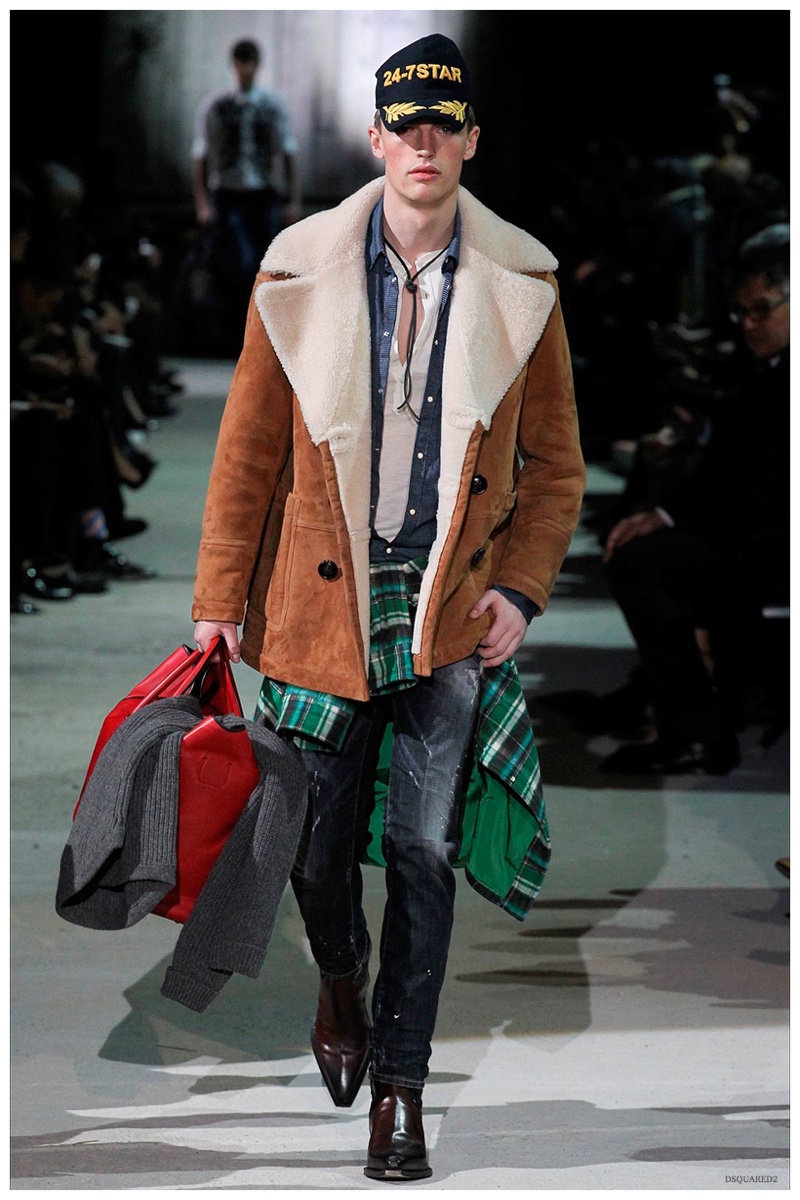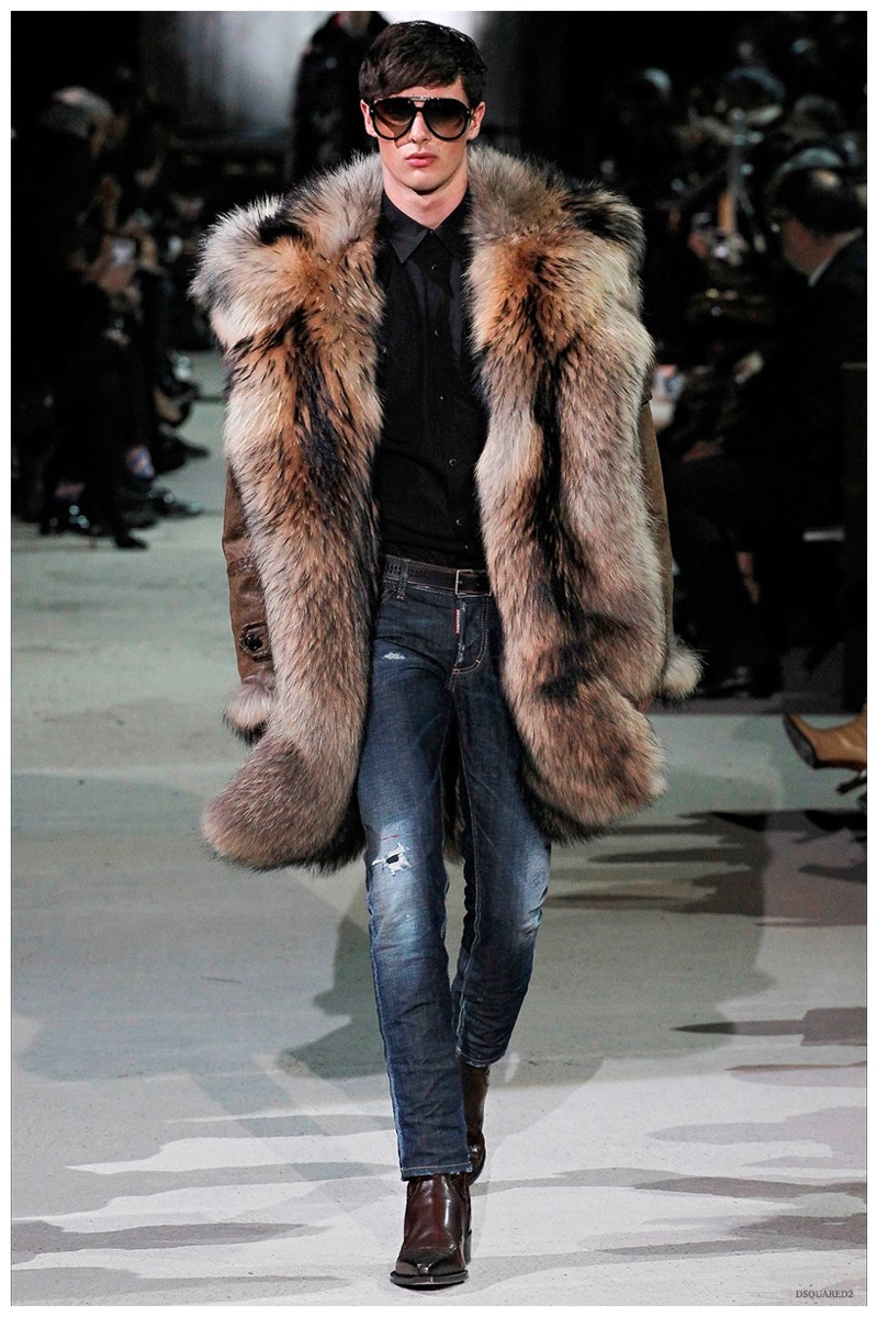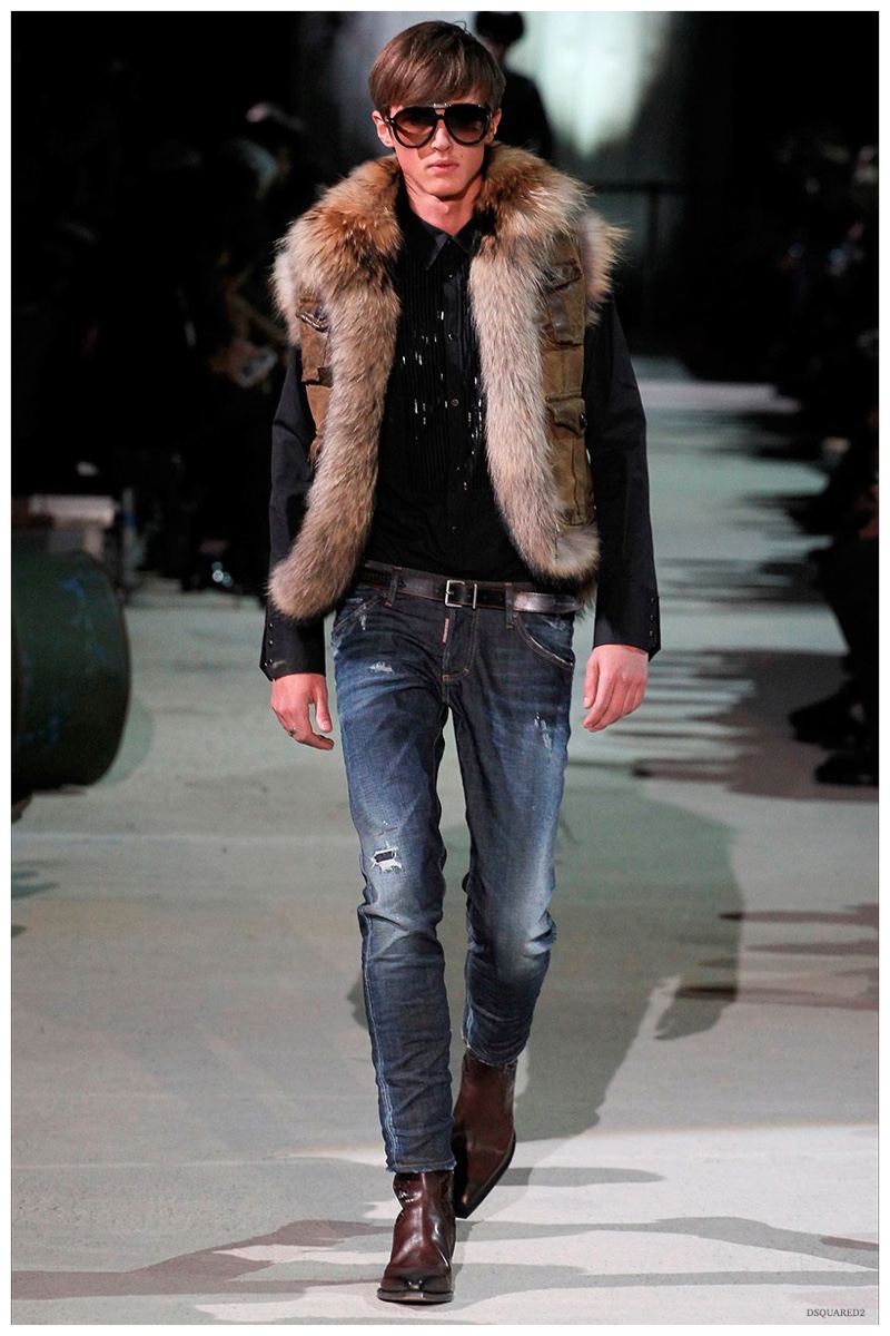 Dsquared2 typically shows its collections on the last day of Milan Fashion Week, but this year was different. Celebrating their 20 year anniversary, twin designing brothers Dan and Dean Caten, opened fashion week with a runway presentation that easily read like a greatest hits. The flamboyant Dsquared2 man, exuding glamour and a rock ‘n’ roll cool was in fine form. Skinny, distressed denim jeans were belted low on the hips and a parade of Dsquared2 essentials delighted. There were oversized parkas, printed, slim-fit button-downs, leather jackets, quilted vests and more. They may have been showing fall, but the Caten brothers also paid homage to the shirtless models in denim they have become known for–fur trapper cap anyone?