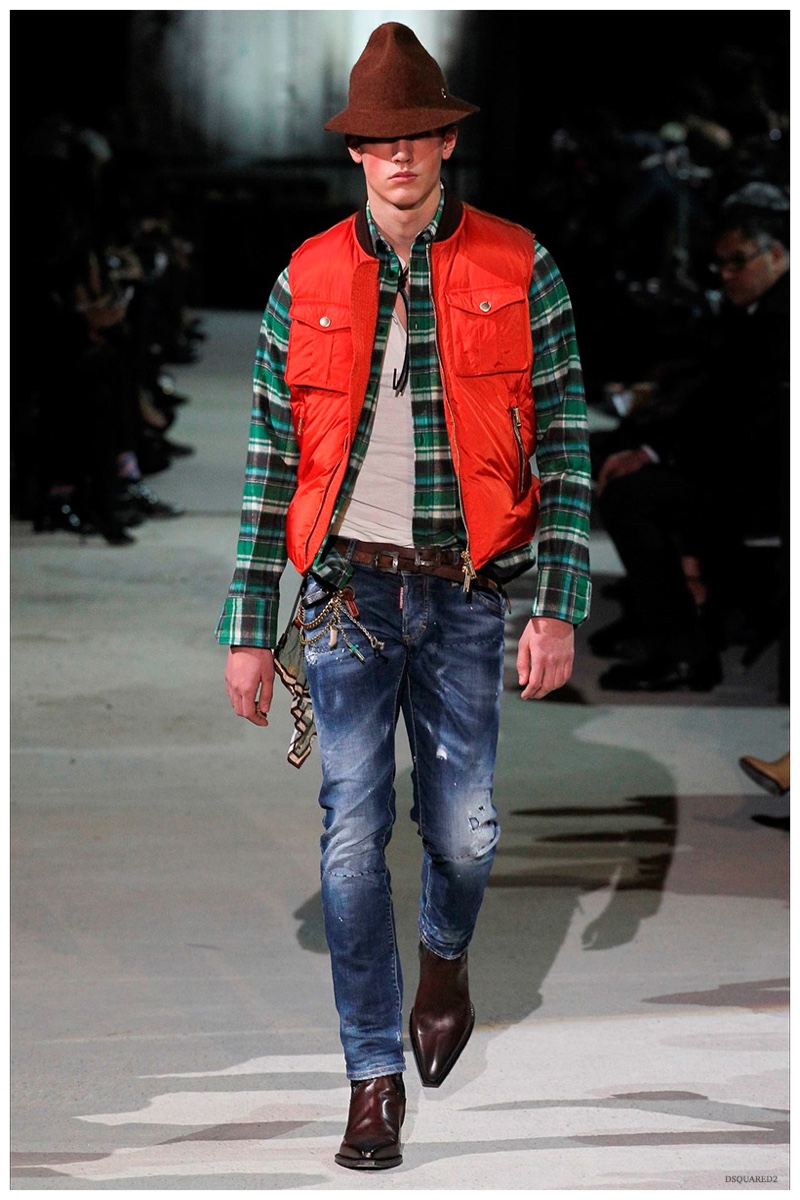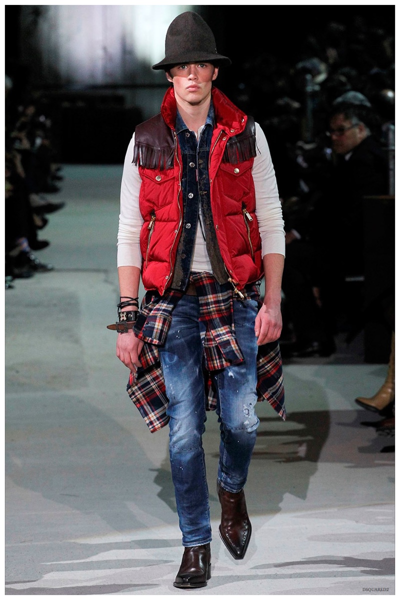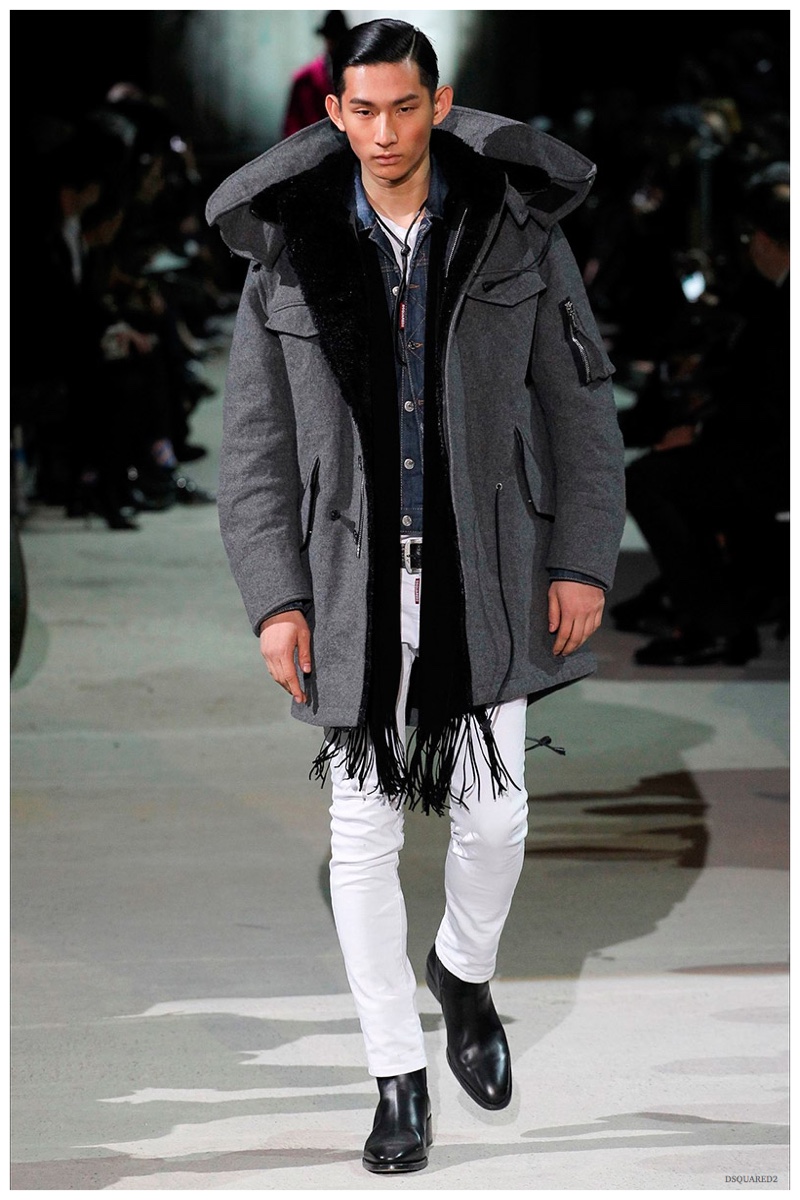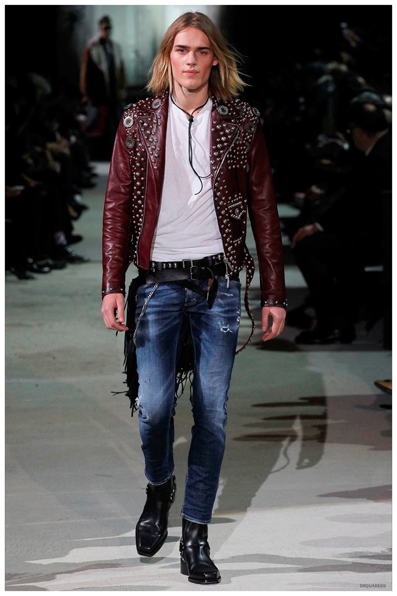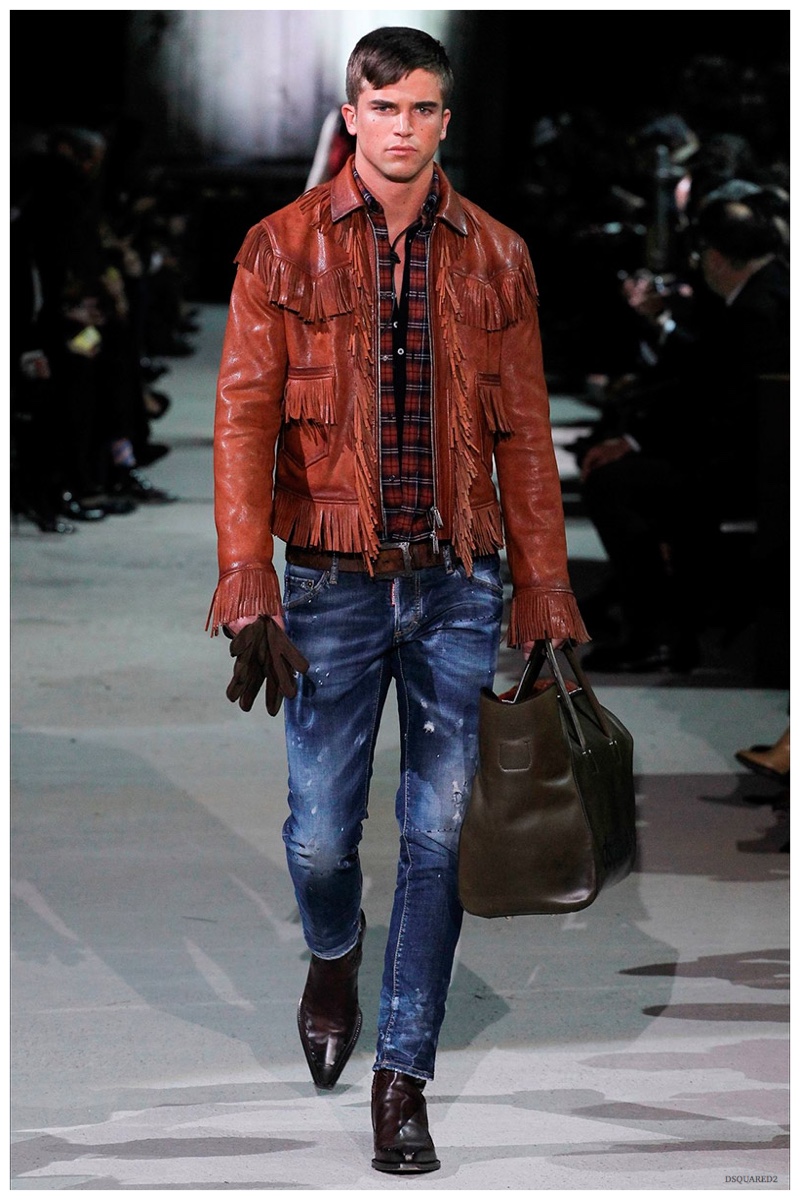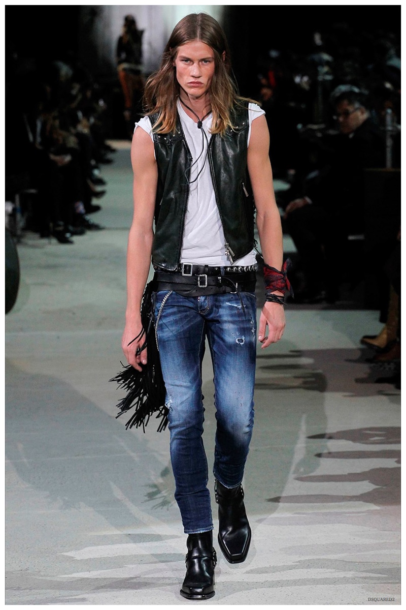 Dsquared2 typically shows its collections on the last day of Milan Fashion Week, but this year was different. Celebrating their 20 year anniversary, twin designing brothers Dan and Dean Caten, opened fashion week with a runway presentation that easily read like a greatest hits. The flamboyant Dsquared2 man, exuding glamour and a rock ‘n’ roll cool was in fine form. Skinny, distressed denim jeans were belted low on the hips and a parade of Dsquared2 essentials delighted. There were oversized parkas, printed, slim-fit button-downs, leather jackets, quilted vests and more. They may have been showing fall, but the Caten brothers also paid homage to the shirtless models in denim they have become known for–fur trapper cap anyone?