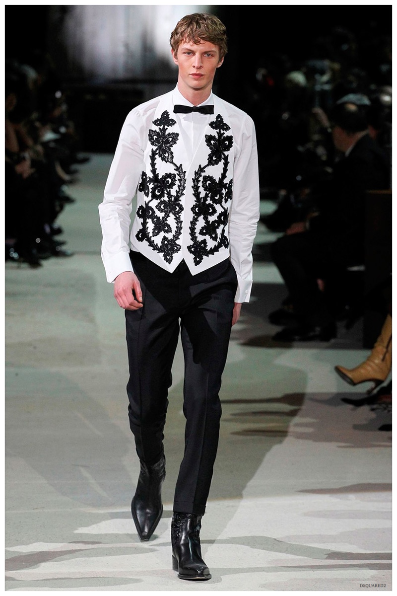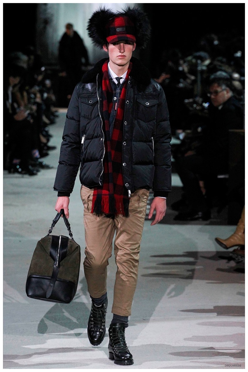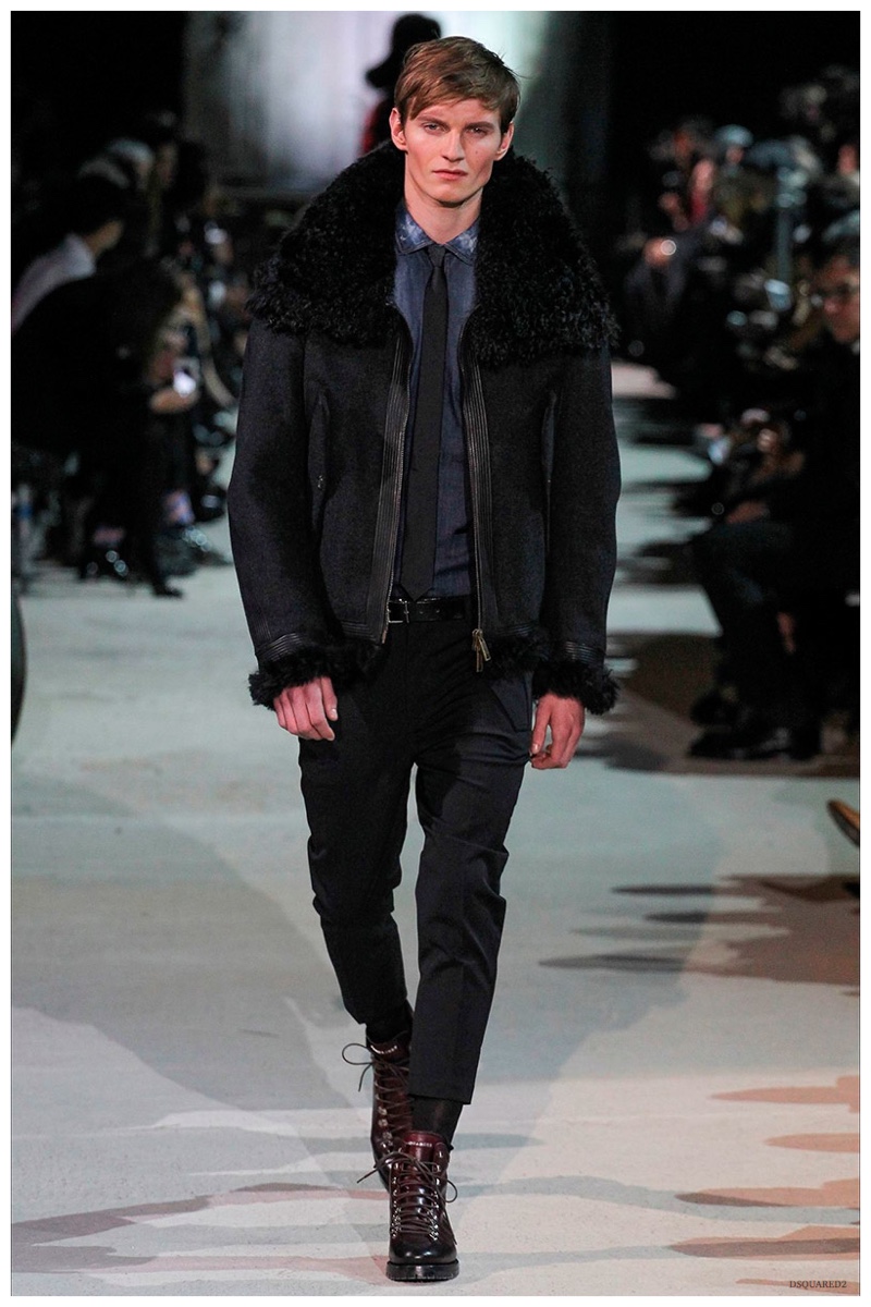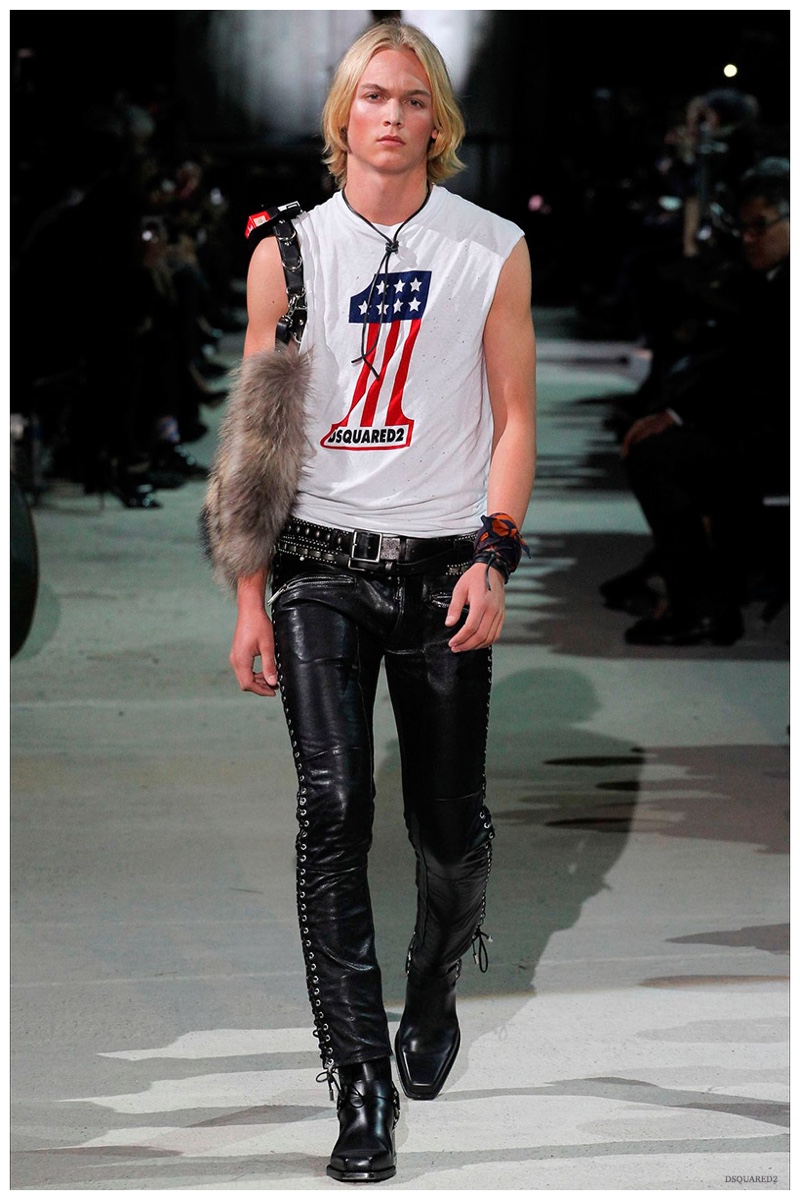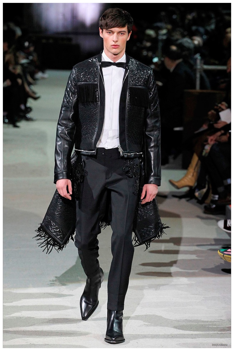 Dsquared2 typically shows its collections on the last day of Milan Fashion Week, but this year was different. Celebrating their 20 year anniversary, twin designing brothers Dan and Dean Caten, opened fashion week with a runway presentation that easily read like a greatest hits. The flamboyant Dsquared2 man, exuding glamour and a rock ‘n’ roll cool was in fine form. Skinny, distressed denim jeans were belted low on the hips and a parade of Dsquared2 essentials delighted. There were oversized parkas, printed, slim-fit button-downs, leather jackets, quilted vests and more. They may have been showing fall, but the Caten brothers also paid homage to the shirtless models in denim they have become known for–fur trapper cap anyone?