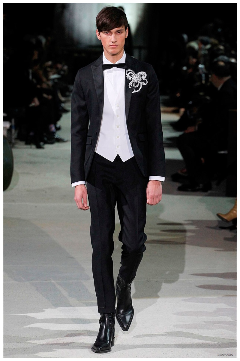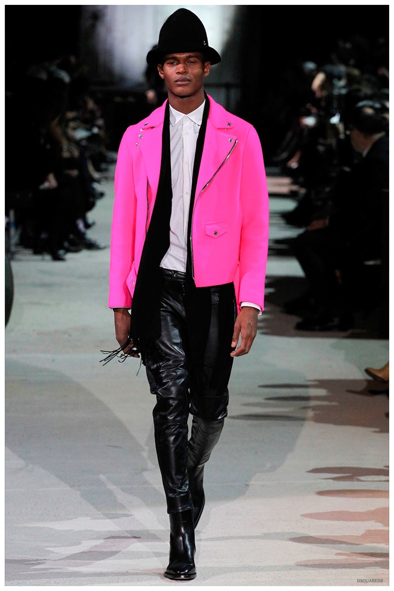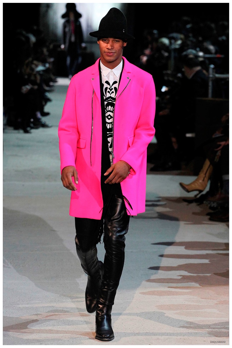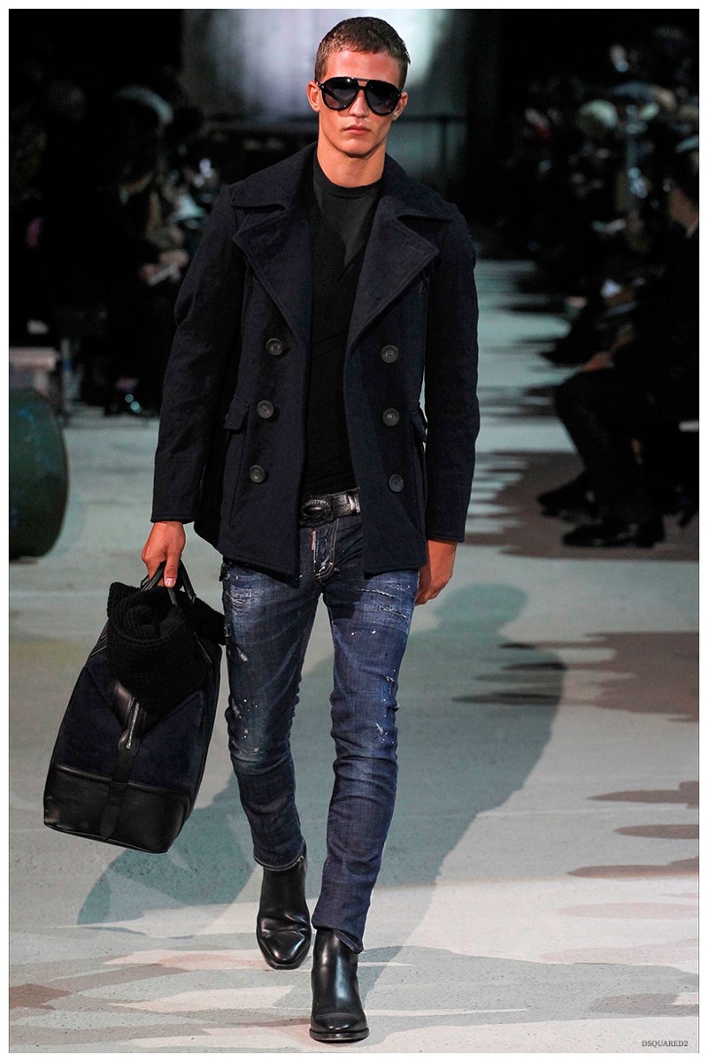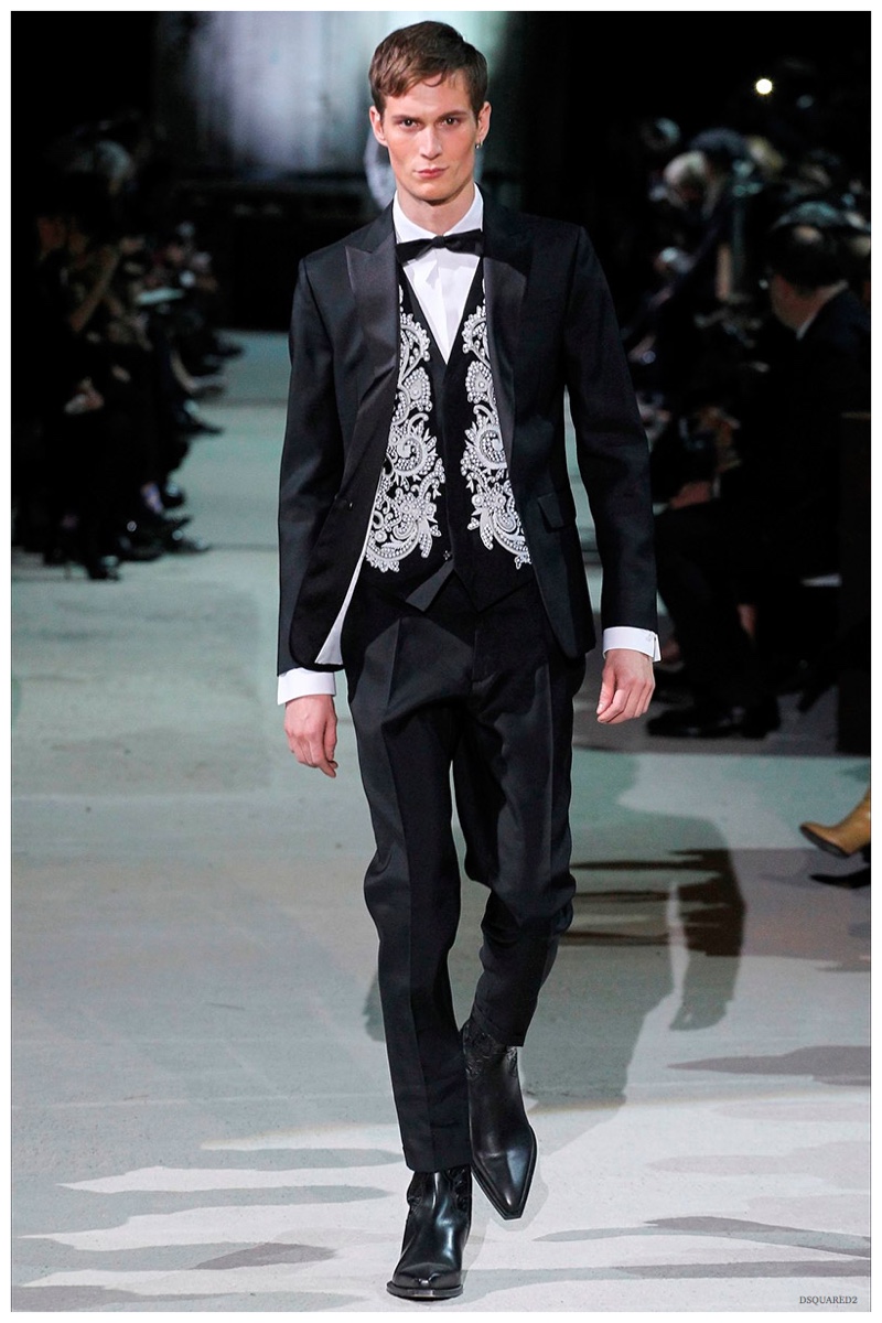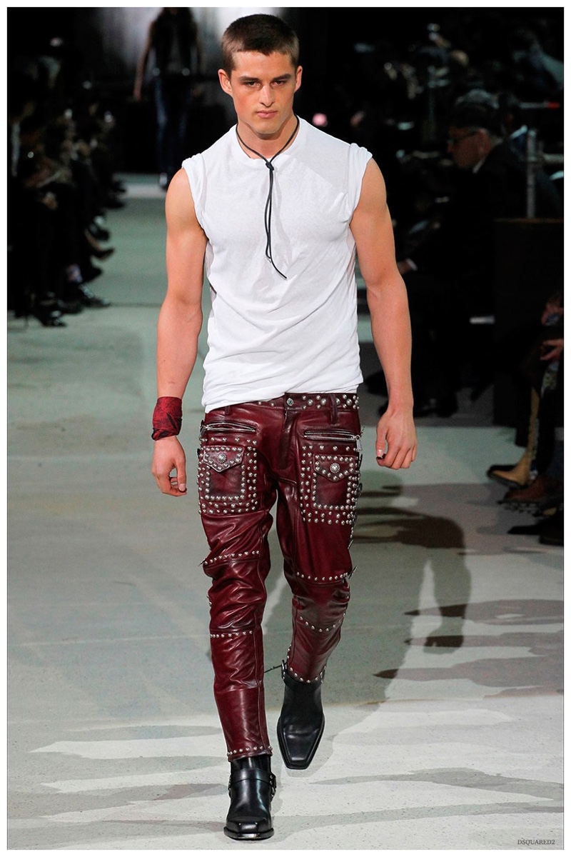 Dsquared2 typically shows its collections on the last day of Milan Fashion Week, but this year was different. Celebrating their 20 year anniversary, twin designing brothers Dan and Dean Caten, opened fashion week with a runway presentation that easily read like a greatest hits. The flamboyant Dsquared2 man, exuding glamour and a rock ‘n’ roll cool was in fine form. Skinny, distressed denim jeans were belted low on the hips and a parade of Dsquared2 essentials delighted. There were oversized parkas, printed, slim-fit button-downs, leather jackets, quilted vests and more. They may have been showing fall, but the Caten brothers also paid homage to the shirtless models in denim they have become known for–fur trapper cap anyone?