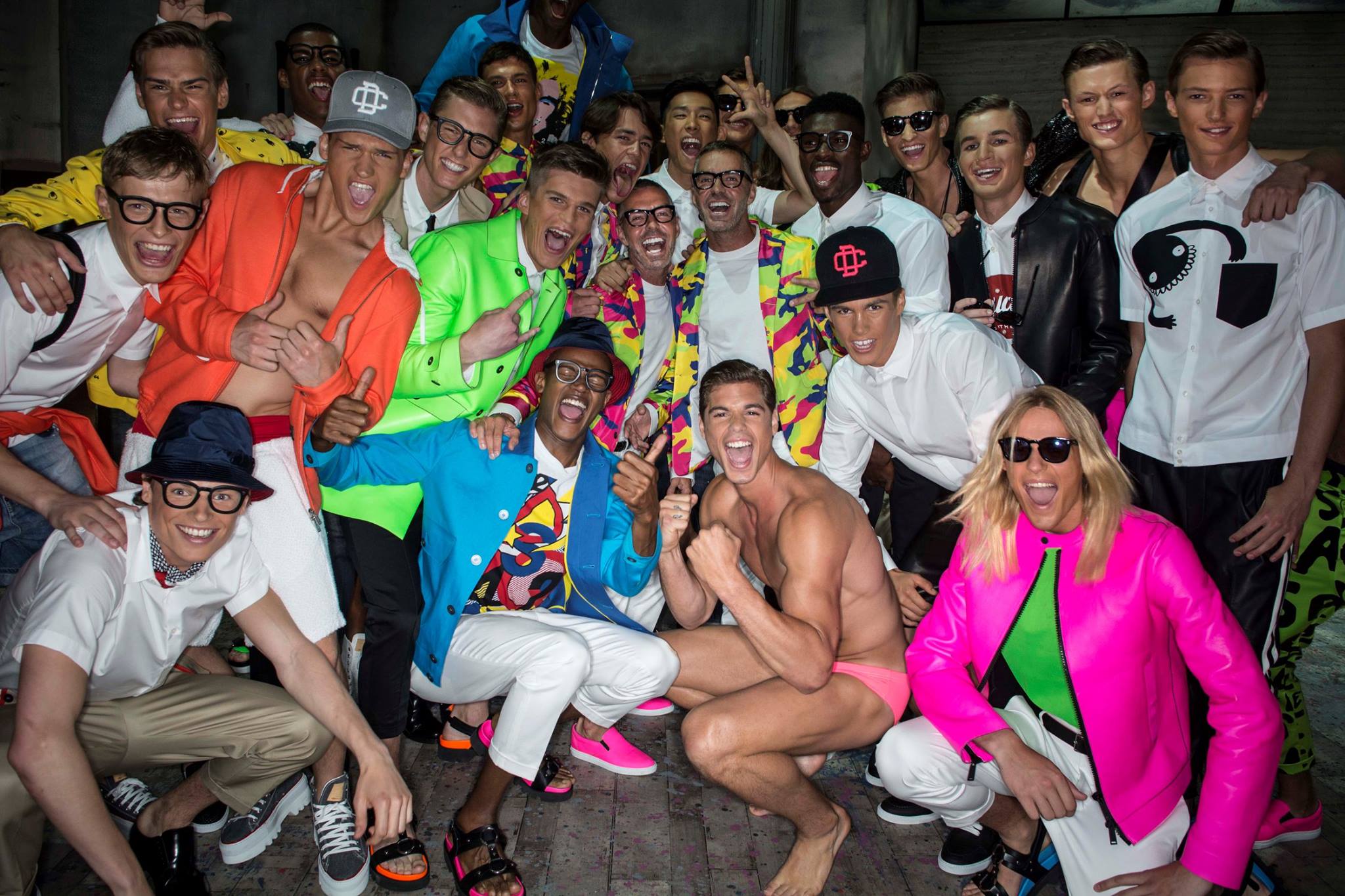 Dsquared2 Goes Pop-Celebrating a successful spring/summer 2015 menswear show during Milan Fashion Week, Dsquared2 designers Dan and Dean Caten posed for a group photo with all the models who walked for the fashion brand. Also offering up a behind the scenes look, a fun video was made showing the fittings for Dsquared2’s upbeat pop art-inspired spring collection.