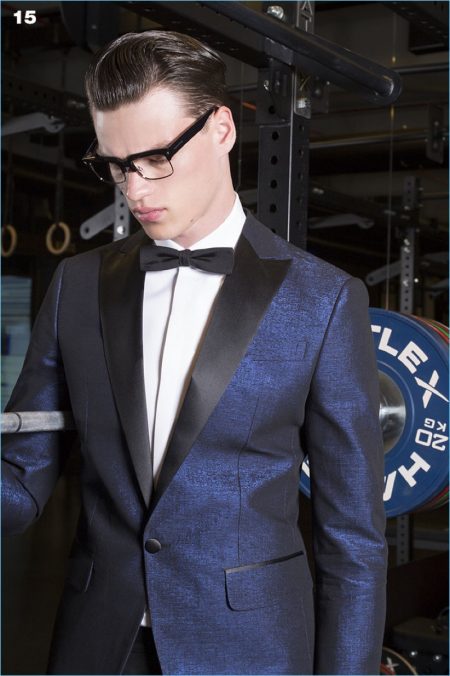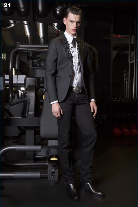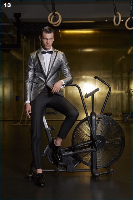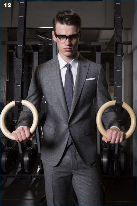 Model Filip Hrivnak takes to the gym in an elegant suit from Dsquared2.