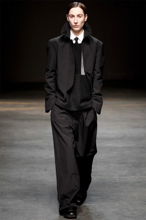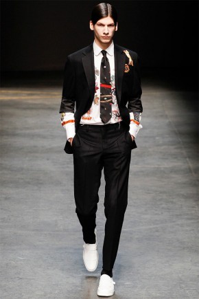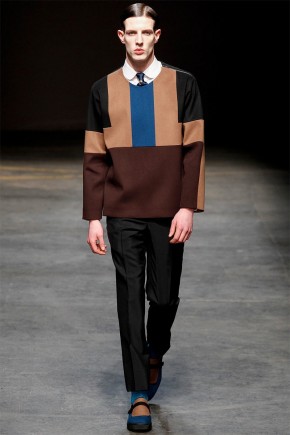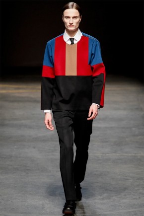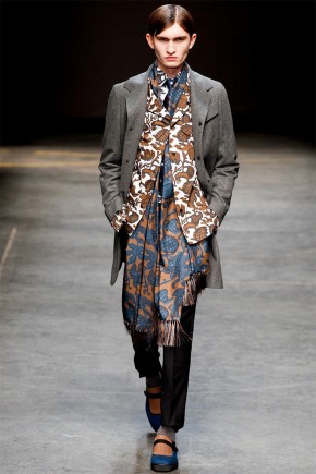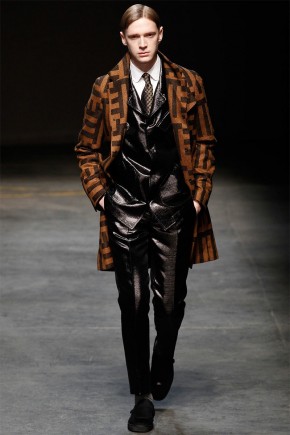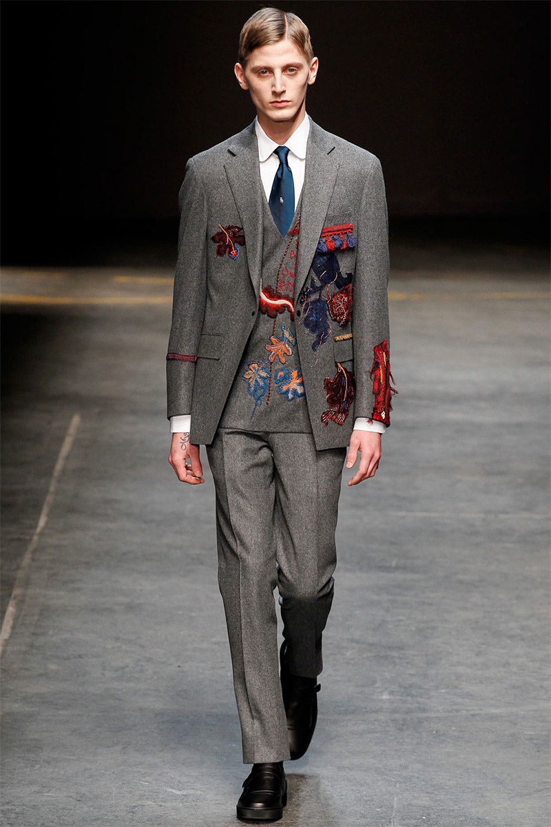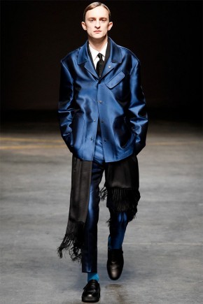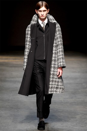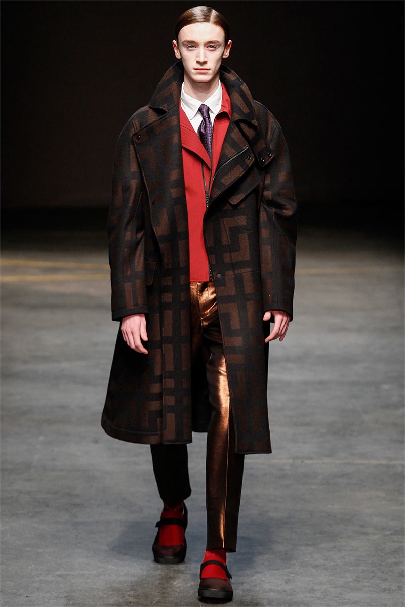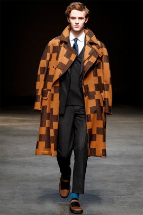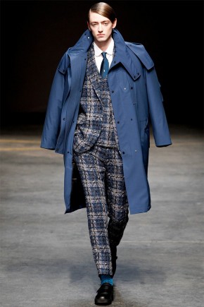 E. Tautz Fall/Winter 2014–E. Tautz creative director Patrick Grant lends the fall/winter 2013 season an elegant departure, looking to A Rake’s Progress by William Hogarth for inspiration. The results include a dapper extension of the label’s sartorial roots with a succession of grand overcoats in fantastic colors and ornate prints. Looking underneath the dandy offering of outerwear gives way to impeccably tailored suits. Finished in silk and wool, luxe subtleties are observed as the collection comes full circle with a flamboyant celebration of traditional menswear.