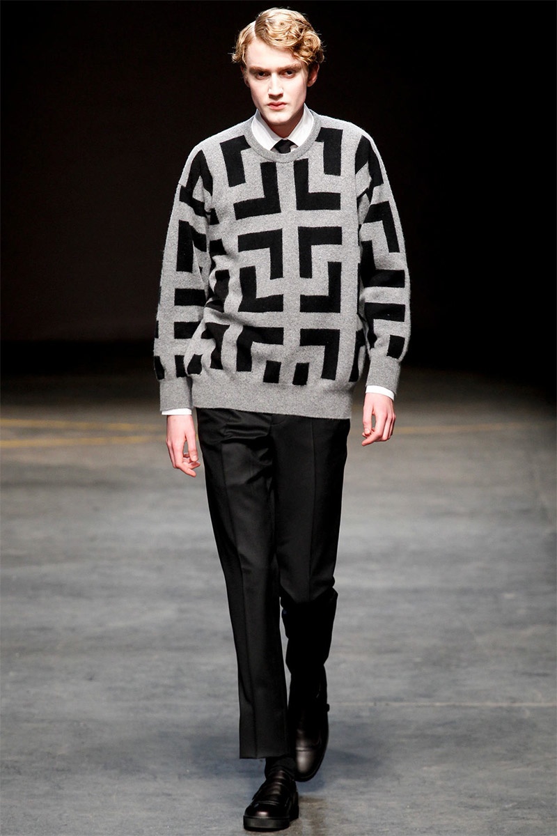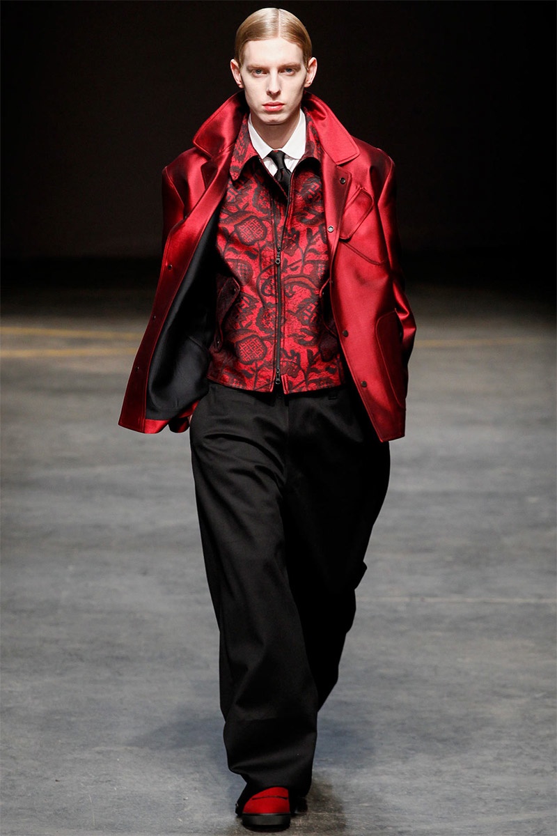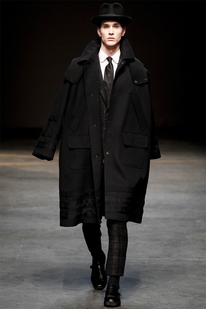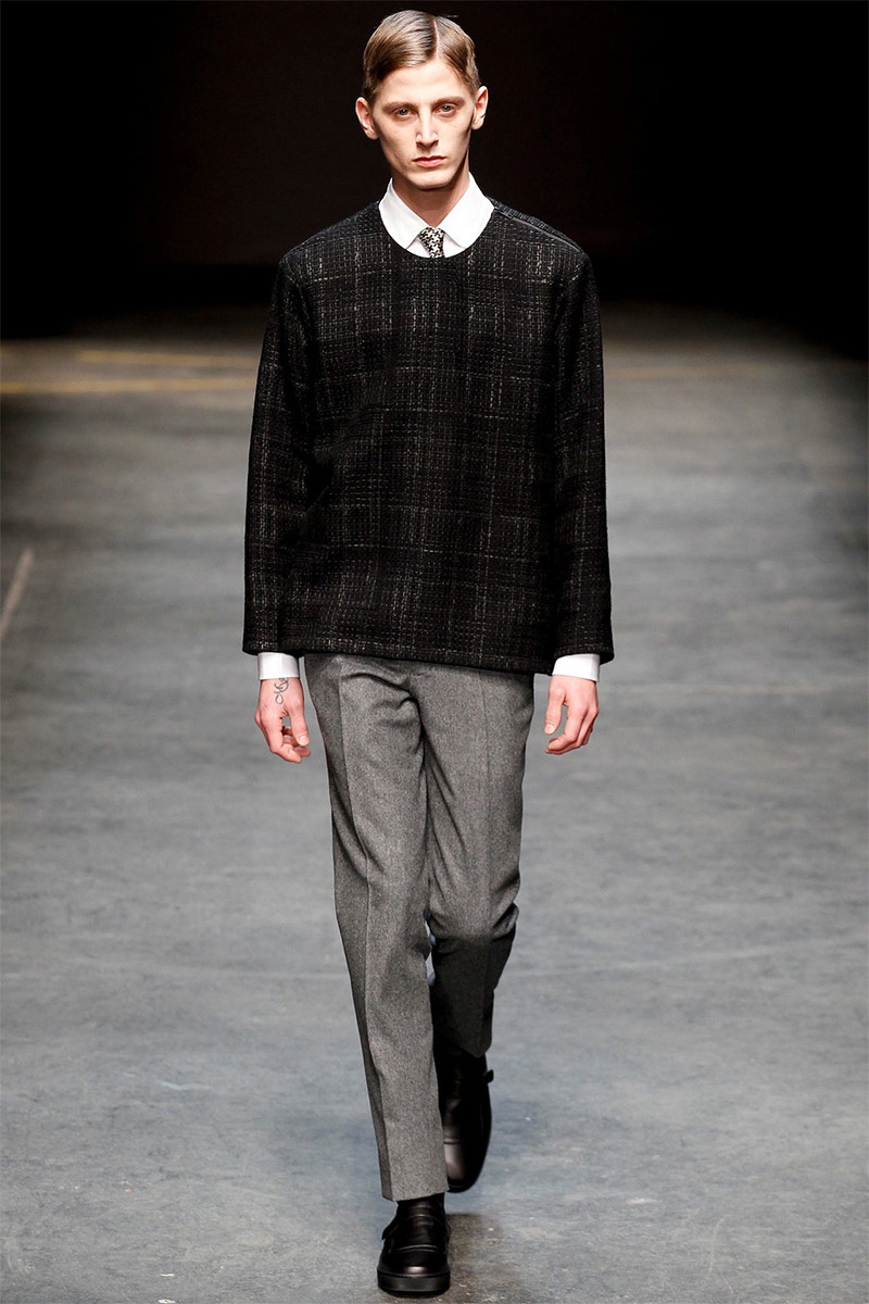 E. Tautz Fall/Winter 2014–E. Tautz creative director Patrick Grant lends the fall/winter 2013 season an elegant departure, looking to A Rake’s Progress by William Hogarth for inspiration. The results include a dapper extension of the label’s sartorial roots with a succession of grand overcoats in fantastic colors and ornate prints. Looking underneath the dandy offering of outerwear gives way to impeccably tailored suits. Finished in silk and wool, luxe subtleties are observed as the collection comes full circle with a flamboyant celebration of traditional menswear.