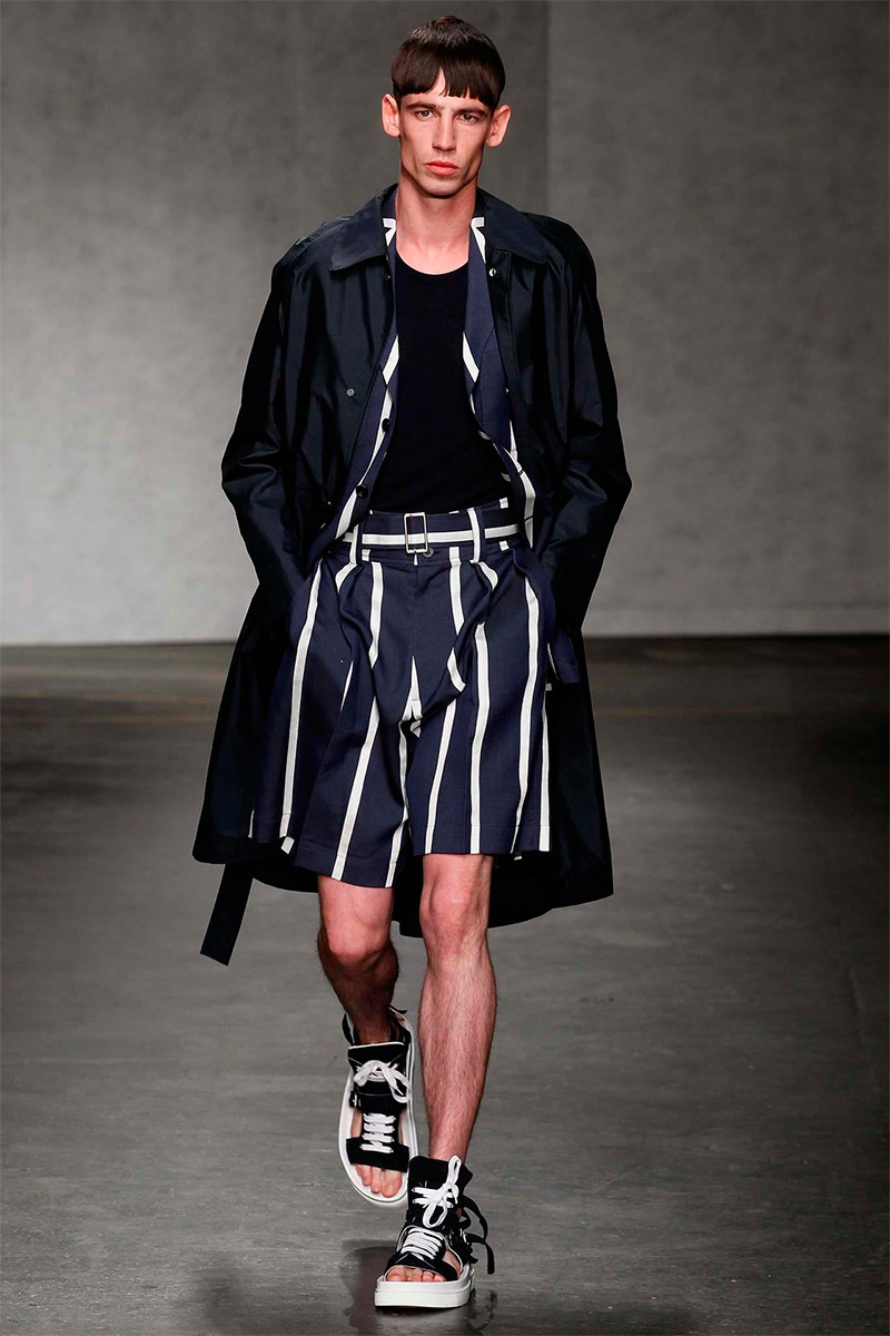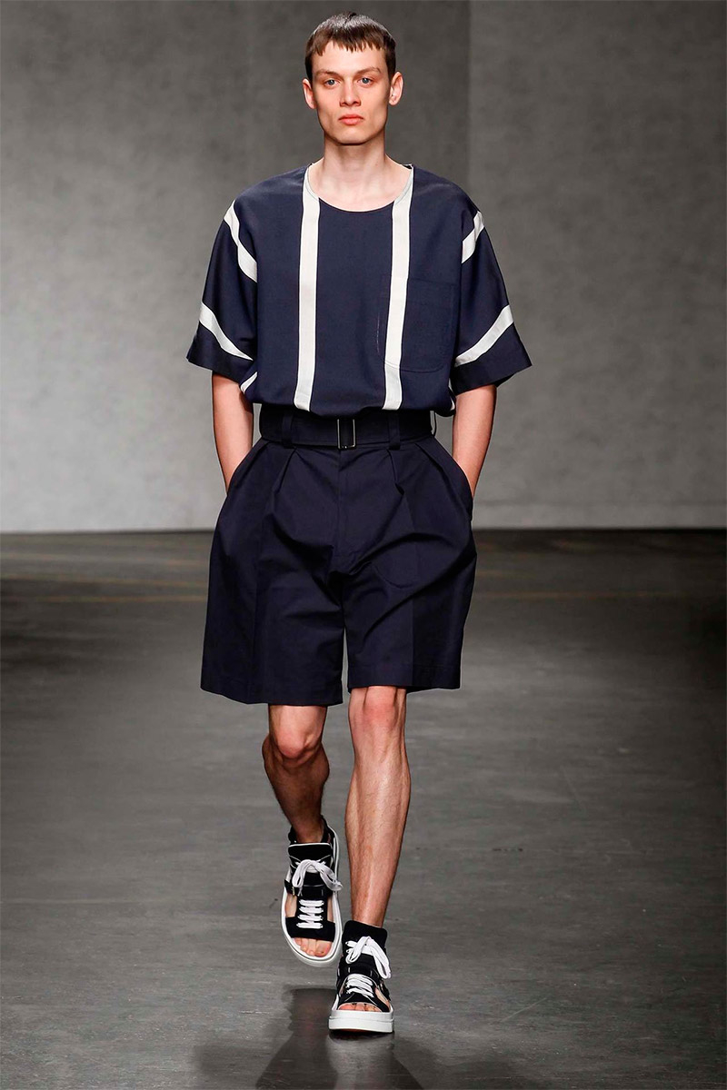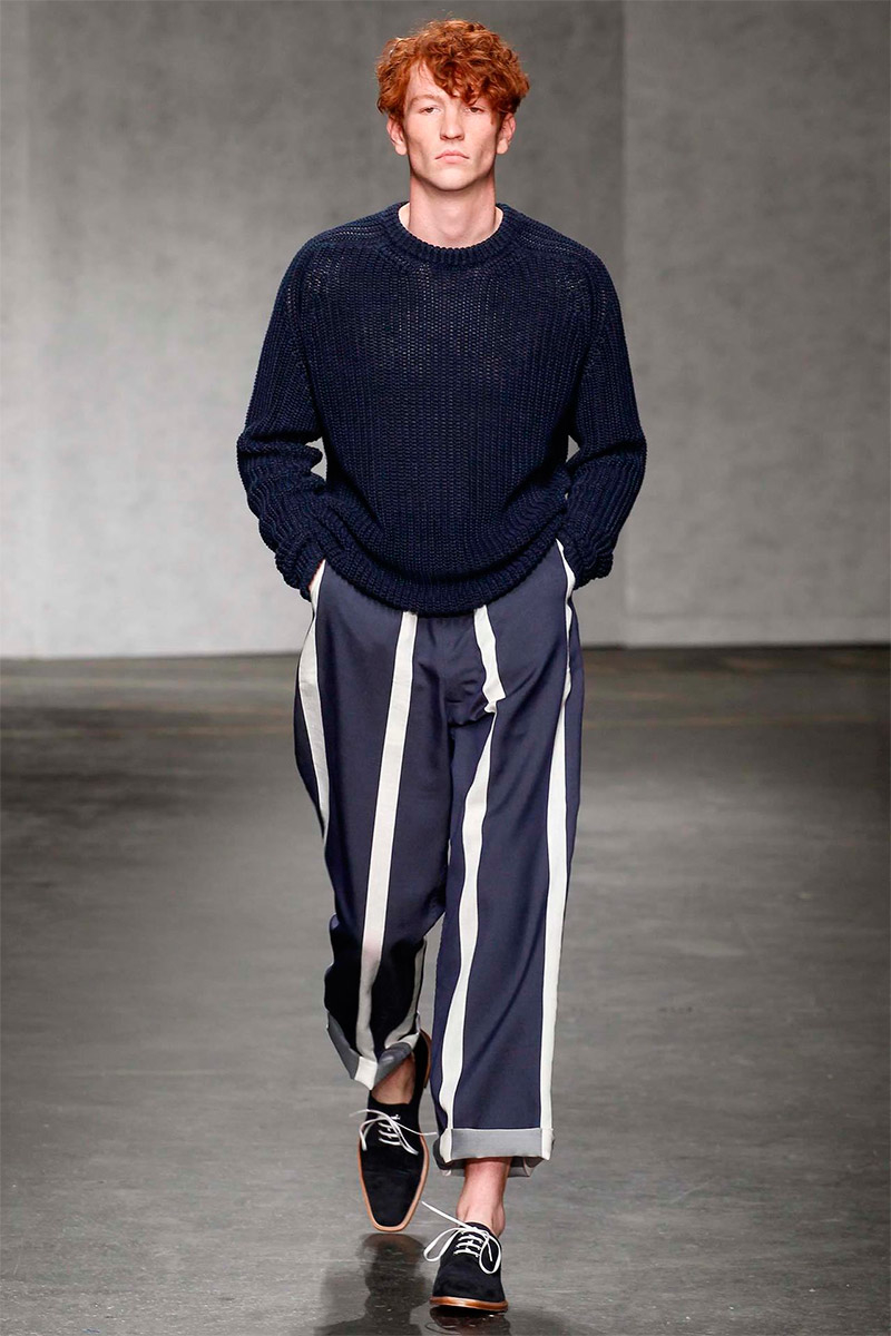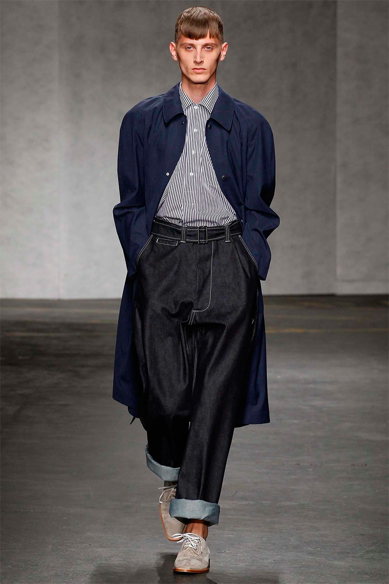 ETautz-Spring-Summer-2015-London-Collections-Men-002PinE.Tautz Spring/Summer 2015–Seeking a relaxed change of pace for spring/summer 2015, E.Tautz creative director Patrick Grant looked to leisure by the sea as captured in the photography of Tony Ray-Jones. For Grant, this meant a laid-back outing that was ultimately chic. Youthful and fresh, oversized silhouettes embraced nautical subtleties with fluid silhouettes. Baggy boxy shorts were paired with oversized tops and large coats, perfect for a tight cinched waist. Among navy and khaki hues, vertical stripes added a smart graphic touch, bring the collection full circle with an effortless charm.