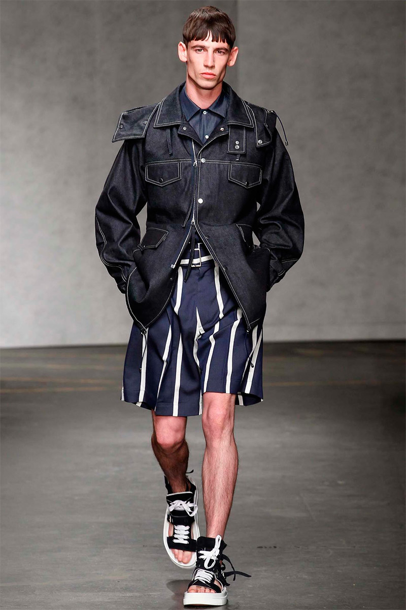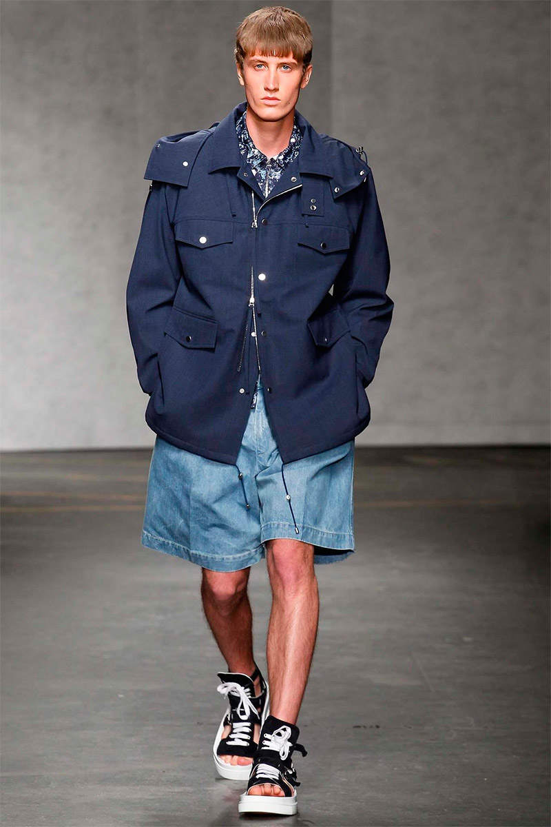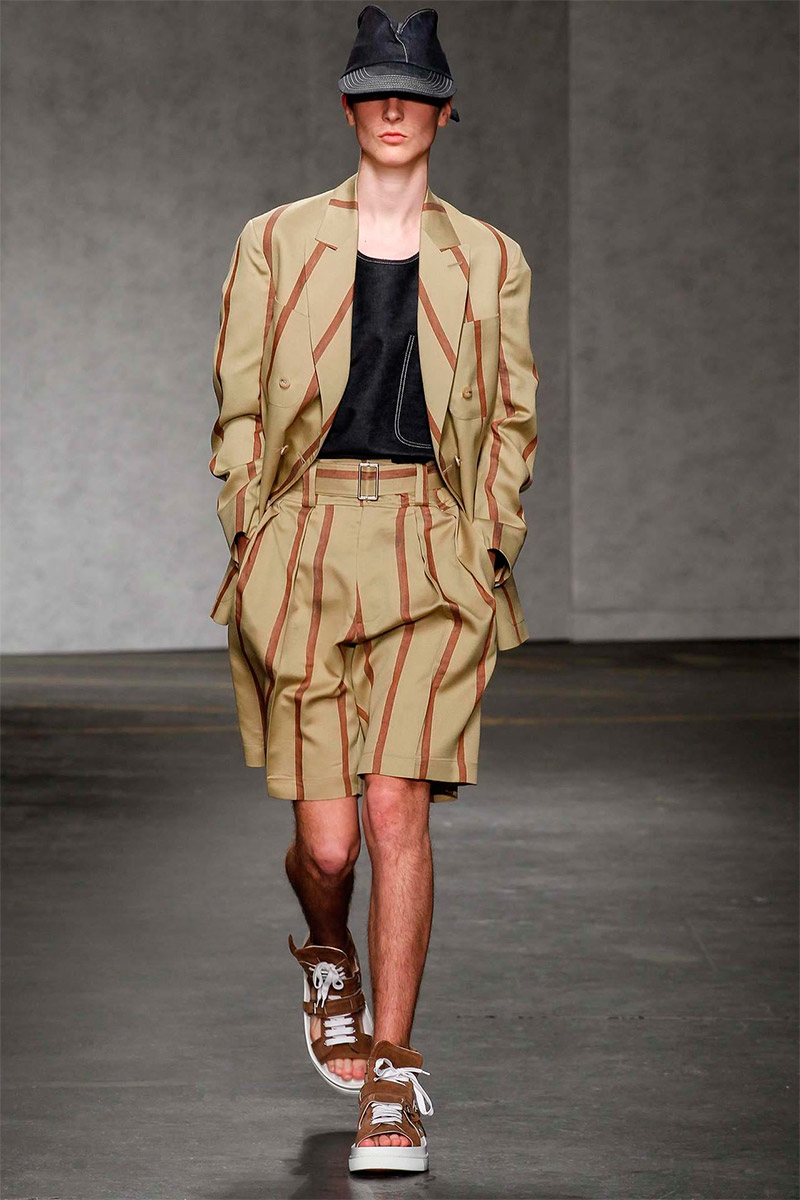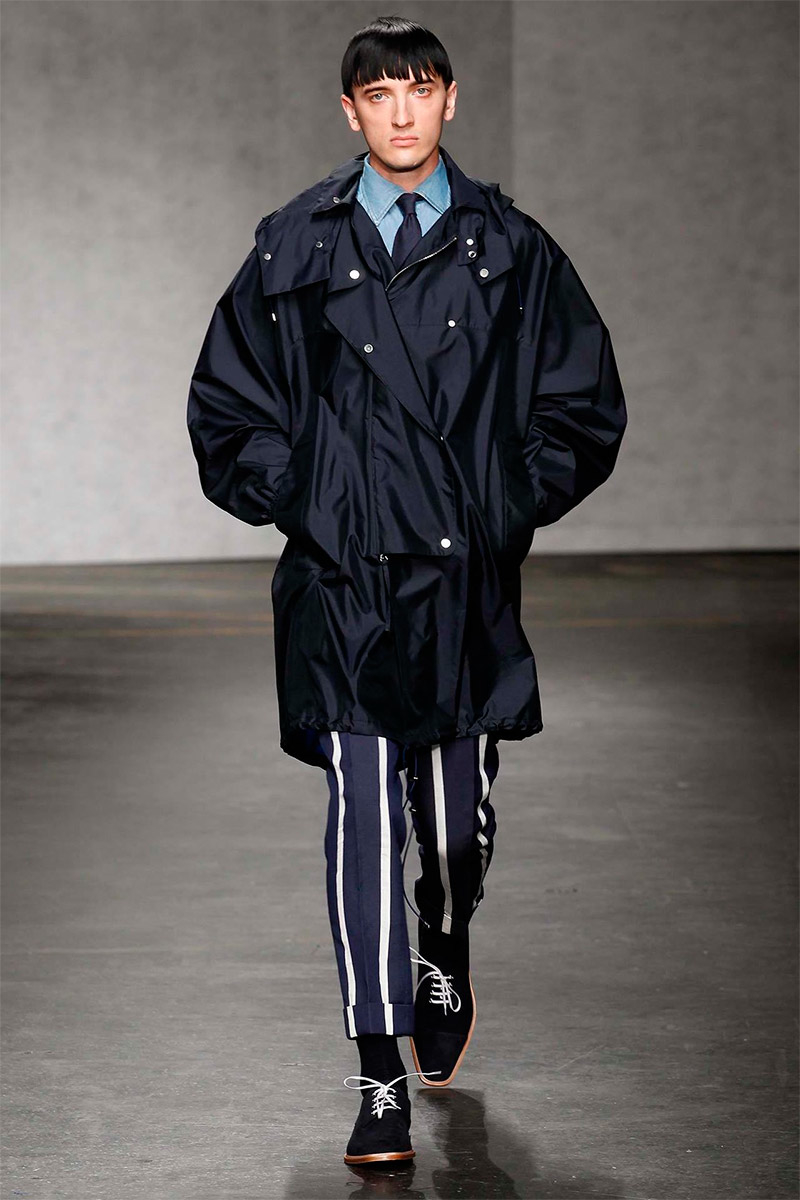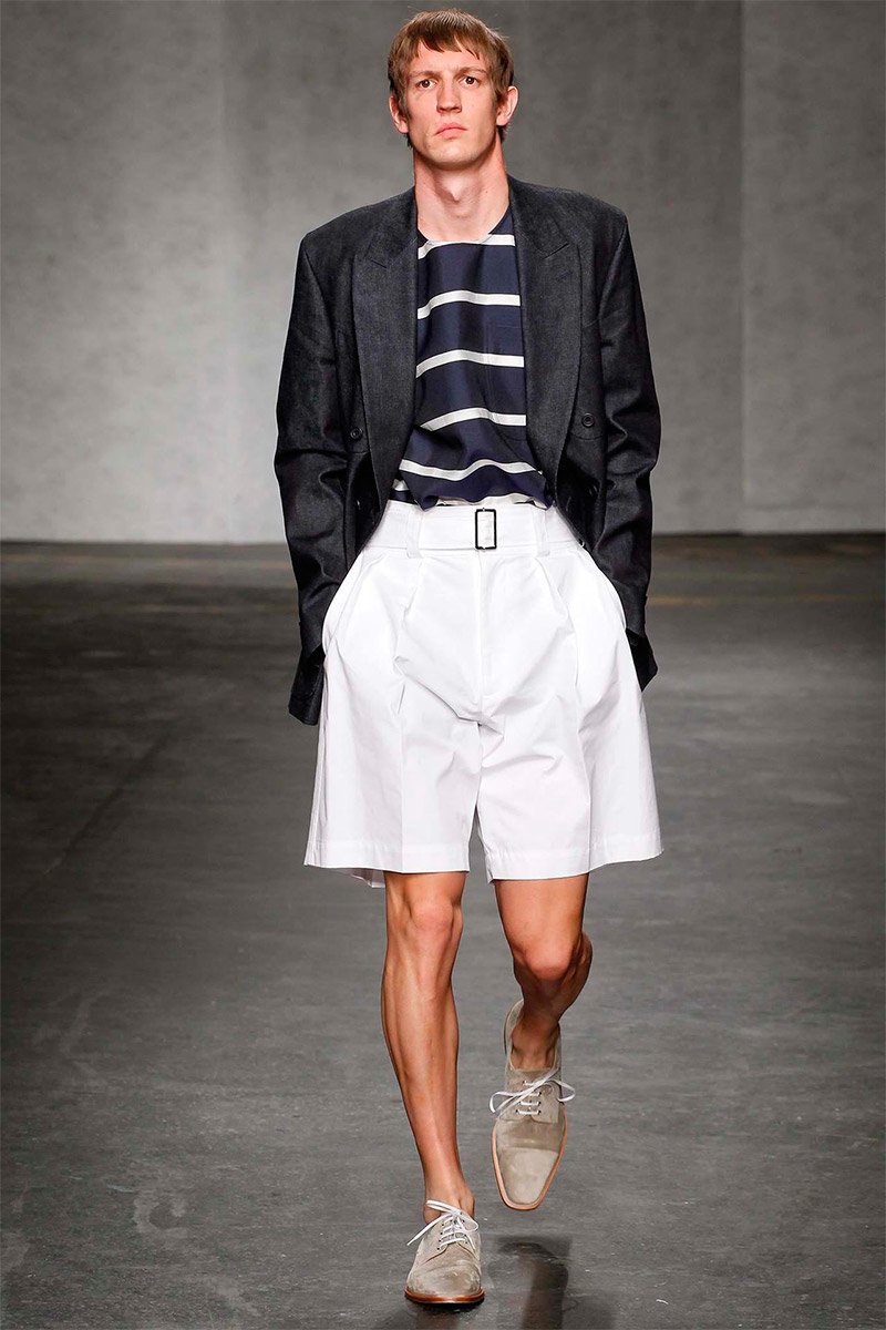 ETautz-Spring-Summer-2015-London-Collections-Men-002PinE.Tautz Spring/Summer 2015–Seeking a relaxed change of pace for spring/summer 2015, E.Tautz creative director Patrick Grant looked to leisure by the sea as captured in the photography of Tony Ray-Jones. For Grant, this meant a laid-back outing that was ultimately chic. Youthful and fresh, oversized silhouettes embraced nautical subtleties with fluid silhouettes. Baggy boxy shorts were paired with oversized tops and large coats, perfect for a tight cinched waist. Among navy and khaki hues, vertical stripes added a smart graphic touch, bring the collection full circle with an effortless charm.