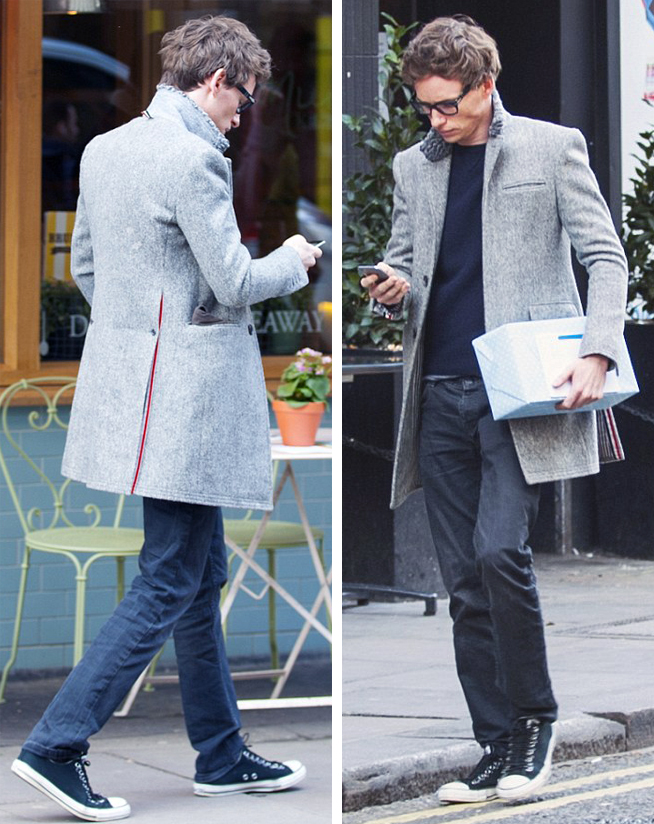 British actor Eddie Redmayne is quickly proving to be a man of style on and off the red carpet. Running errands in London earlier this week, the actor was spotted in a gray coat from American designer Thom Browne. Redmayne paired the sharp coat with blue jeans, a navy sweatshirt and Converse sneakers.