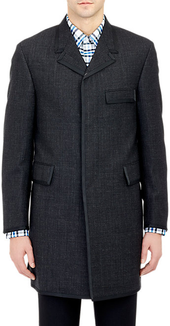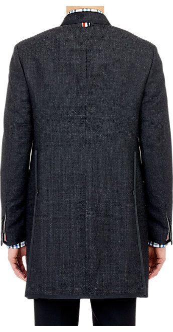 Impeccably constructed, Thom Browne’s coat features “convertible notched lapels with boutonnière, three flap pockets at front, four functional buttons at cuffs, double vents with button closure, house-signature tri-color stripe grosgrain facing at cuffs and vents and grosgrain trimmed edges.”