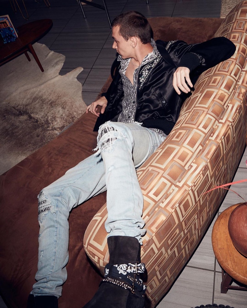 Model Yuri Pleskun wears an AMIRI military patch knit $950 with black MX2 jeans $1,150.Pin