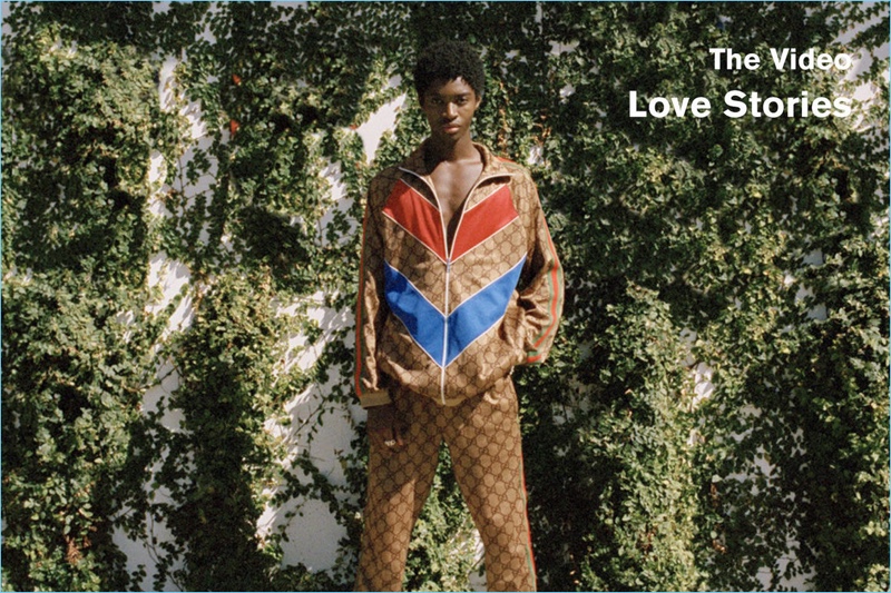 Model Alton Mason wears a Versace shirt with Champion joggers.Pin