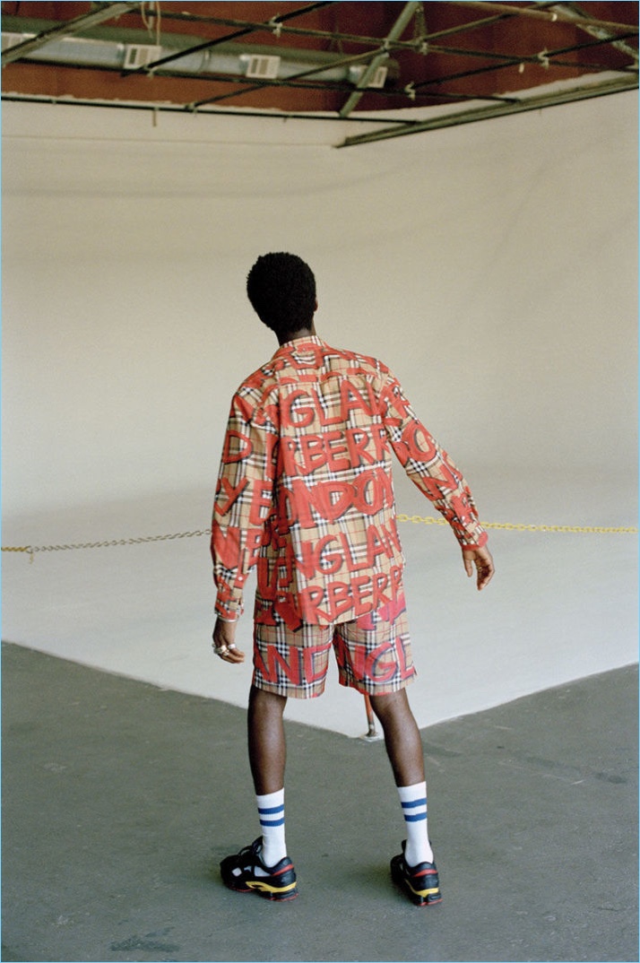 Making a case for prints, Alton Mason wears a Burberry shirt and shorts with Adidas by Raf Simons sneakers.