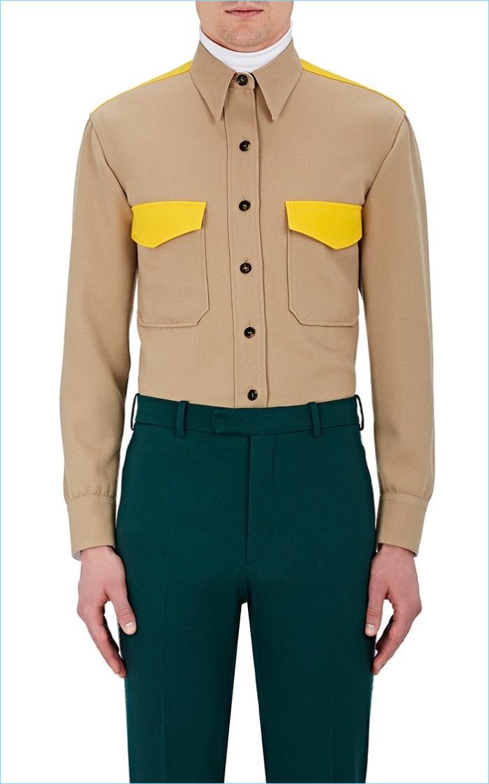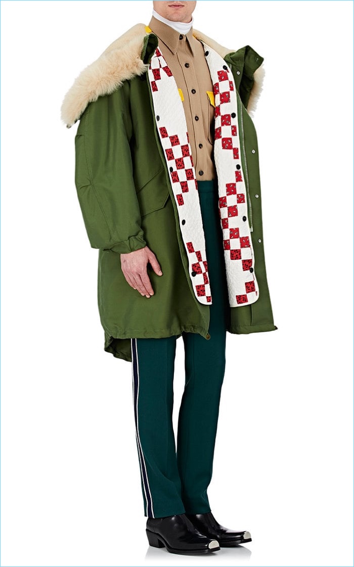 PinColor block with Calvin Klein 205W39NYC’s shearling-trimmed cotton-silk hooded parka $4,495 and contrast-detailed wool shirt $695. Embrace the full look with a cotton turtleneck shirt $295 and stripe-appliquéd wool trousers $850.