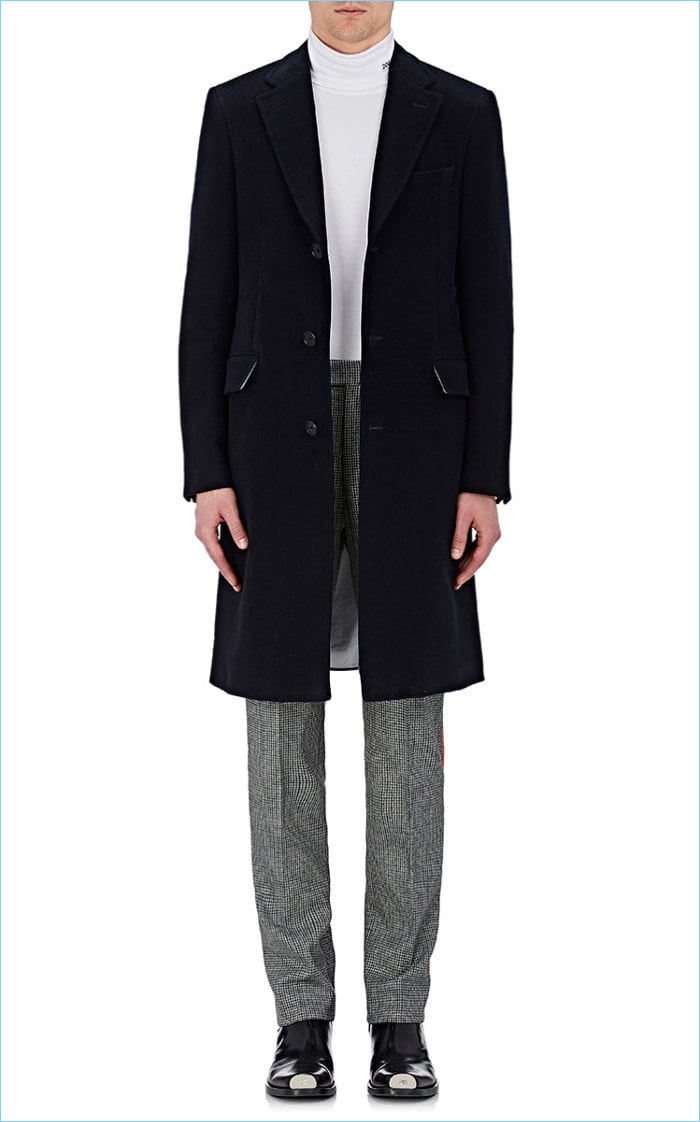PinRaf Simons makes a fashion-forward statement with a Calvin Klein 205W39NYC wool coat and removable cover $3,995. The statement piece complements the brand’s stripe-appliquéd wool trousers $895 and Spazzolato leather boots $1,195.