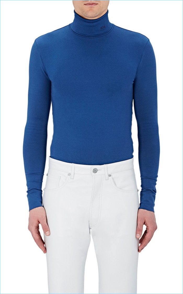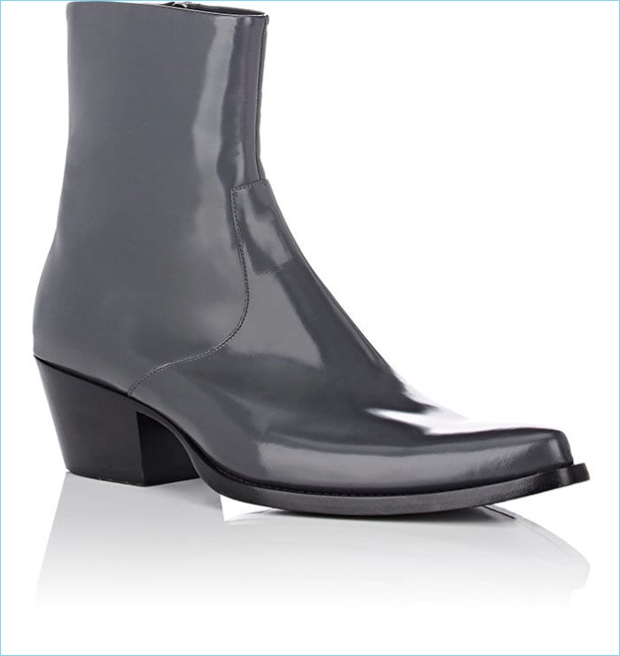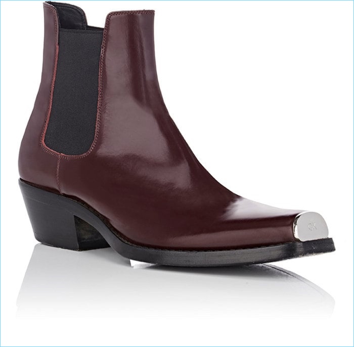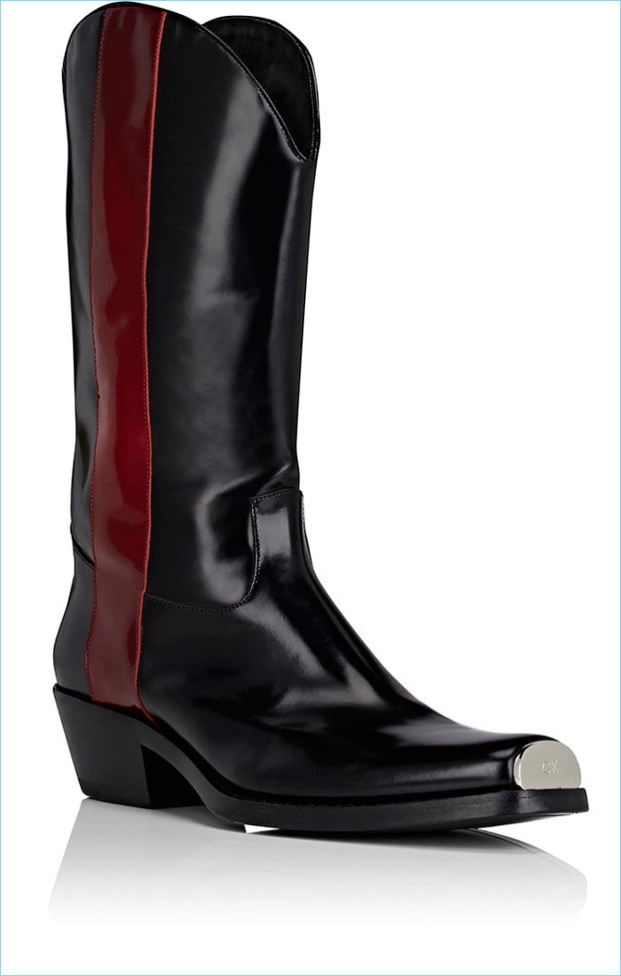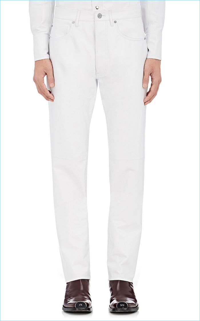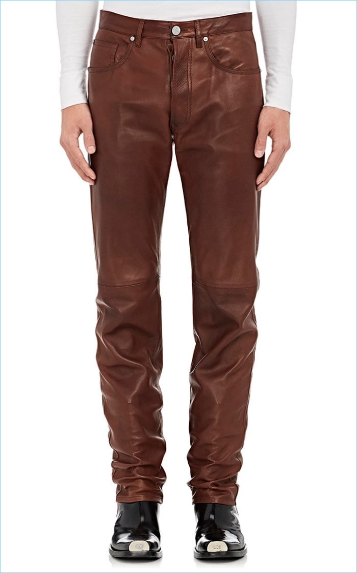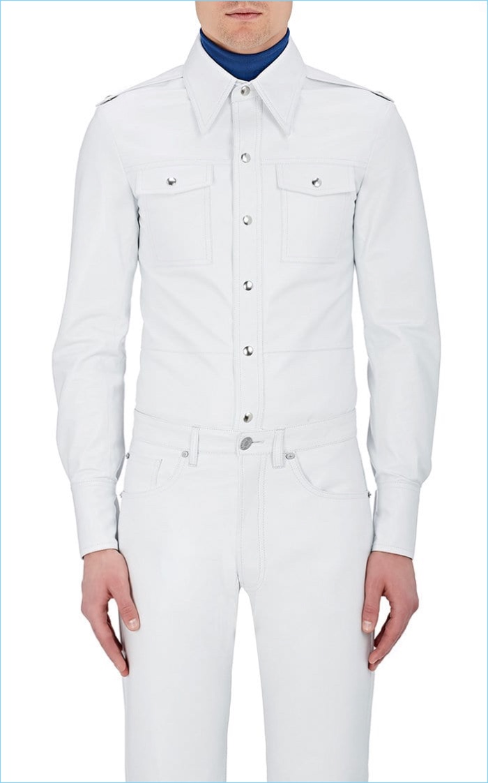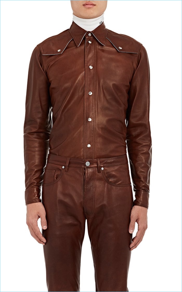PinTrade out your denim for Calvin Klein 205W39NYC’s leather western shirt $1,850 and straight jeans $2,495. Here, the leather pieces go with a cotton turtleneck shirt $295 and Spazzolato leather Chelsea boots $1,095.