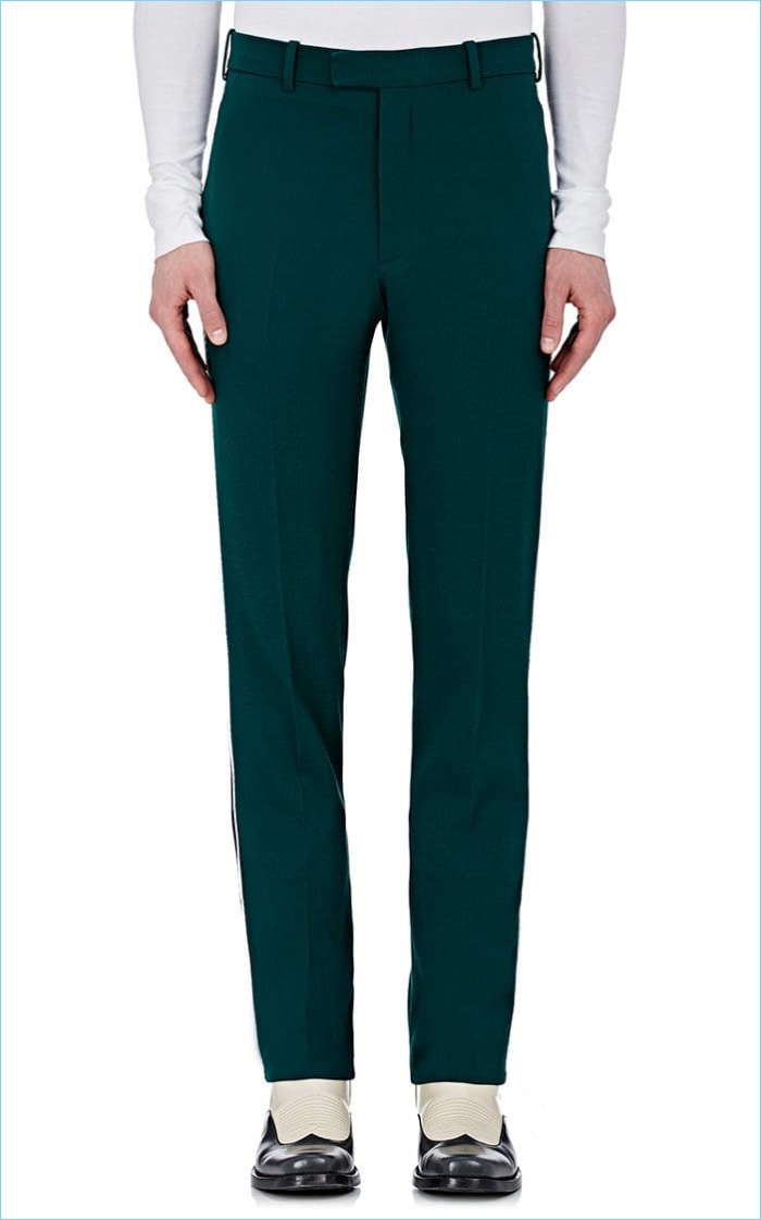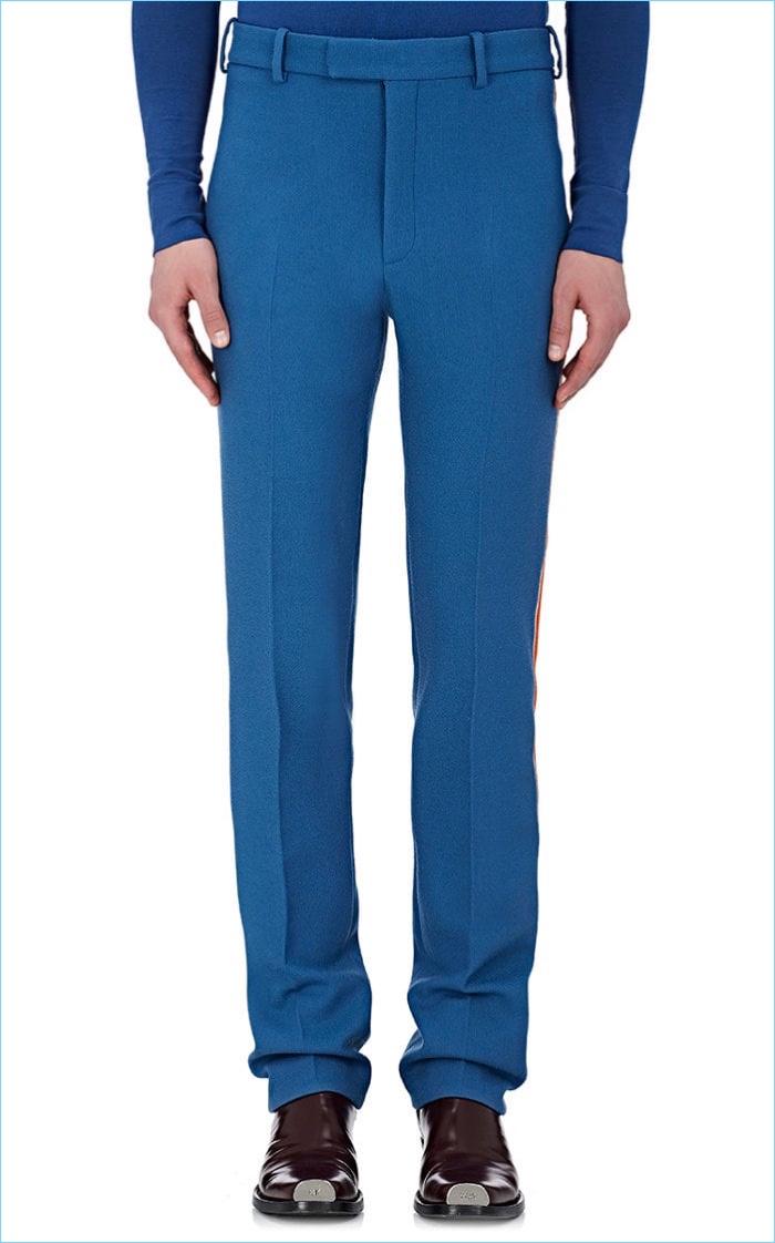 PinBlue provides a bold color for Calvin Klein 205W39NYC’s wool double-breasted sport coat $1,895 and stripe-appliquéd virgin wool trousers $850. Take your look to the next level with Calvin Klein 205W39NYC’s Spazzolato leather Chelsea boots $1,095.