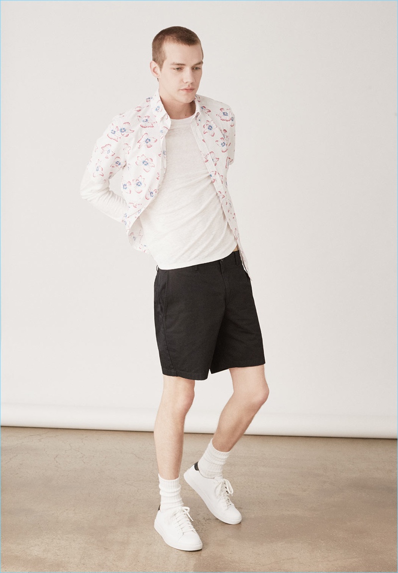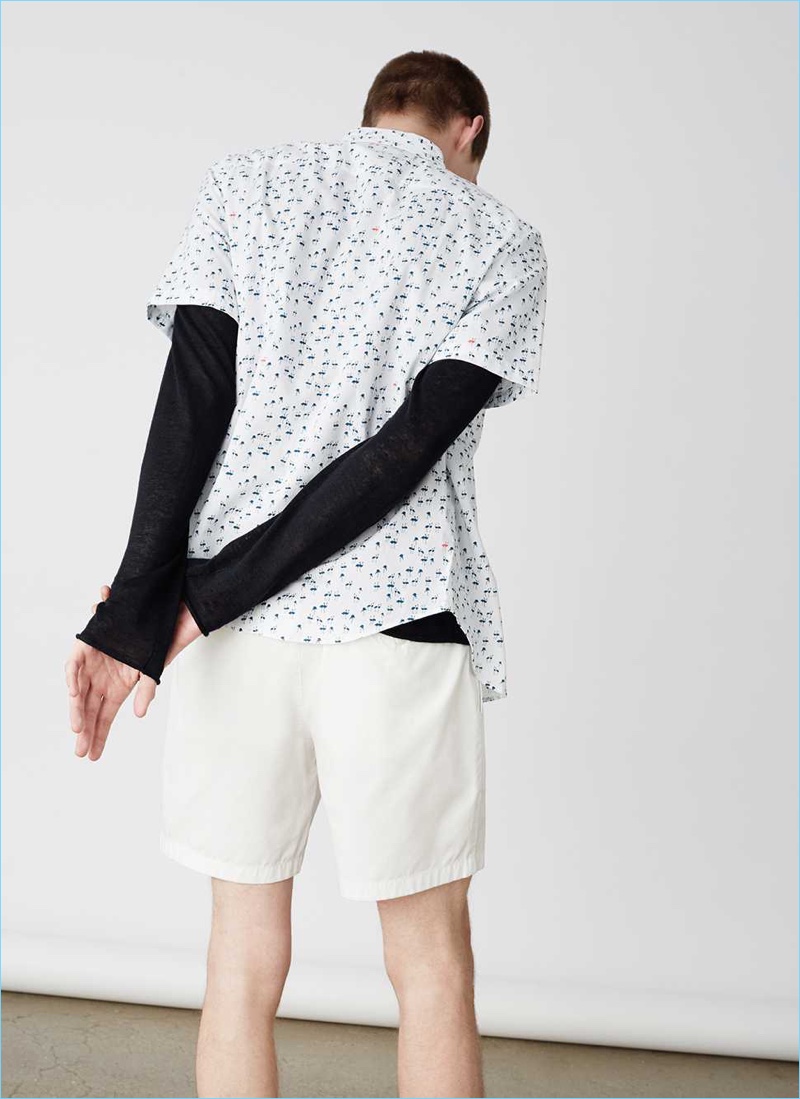 Prints are an easy way to liven up any wardrobe and Club Monaco has you covered for spring. The fashion brand delivers a new style edit that highlights its printed shirts. Peter Ash Lee photographs model Benji Staker for the feature. Taking to the studio, Benji embraces laid-back style. The American model wears a wardrobe of shirts that incorporate micro prints, tonal stripes, and even a Hawaiian print. The shirts go great with everything from chinos to Bermuda shorts.