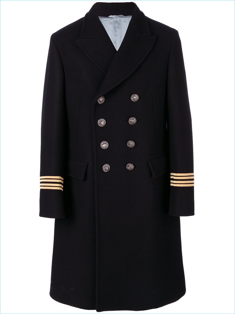 PinModel Josue Comoe connects with Farfetch for a fashion editorial. He wears a sharp officer coat by Gucci with an Alexander McQueen sweater. The model also sports John Lawrence Sullivan jeans with an Avant Toi scarf worn as a belt.