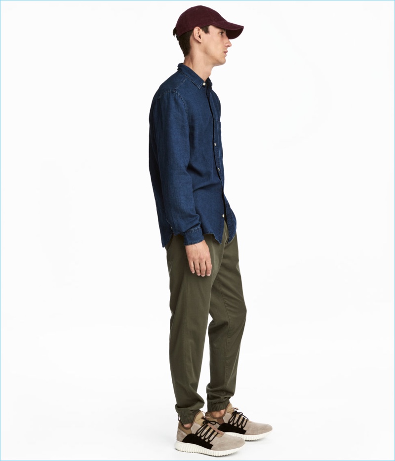 PinGoing sporty, Elias de Poot wears a H&M windproof jacket $49.99, cotton joggers $29.99, corduroy cap $12.99, shirt $24.99, and suede sneakers $69.99.