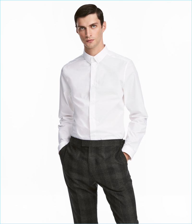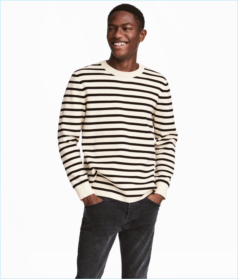 PinLeft: Elias de Poot models a H&M full-zip cardigan $49.99, premium cotton shirt $24.99, fabric web belt $5.99, and slim-fit suit pants $59.99. Right: Elias wears a striped H&M sweater $39.99.