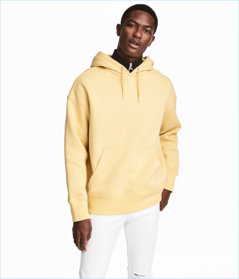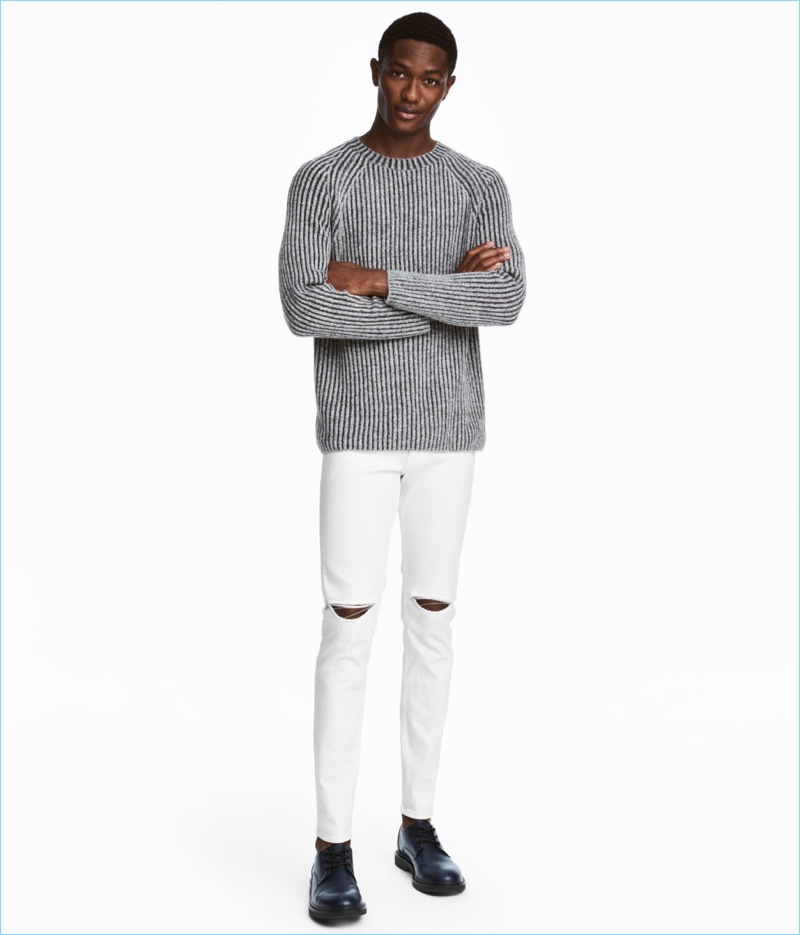 PinLeft: Elias de Poot sports a wide-cut H&M hooded sweatshirt $34.99. Right: Elias wears a H&M textured wool-blend sweater $34.99, wide-cut t-shirt $14.99, and white skinny jeans $34.99.