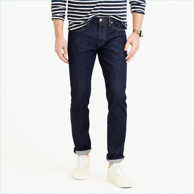 Take a stroll in J.Crew’s lightweight denim zip-front overshirt $79.50. It goes great with the brand’s striped t-shirt $45, 484 slim stretch indigo jeans $98, and New Balance for J.Crew 891 leather high-top sneakers $85.