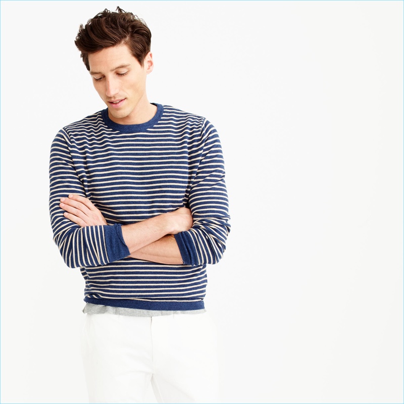 All smiles, Armando Cabral showcases effortless layering with a J.Crew striped sweater $59.50 and broken-in t-shirt $24.50.
