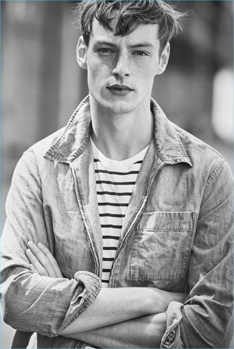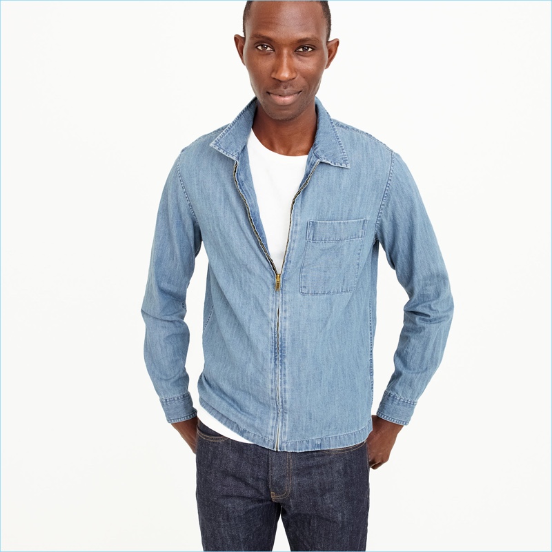 Take a stroll in J.Crew's lightweight denim zip-front overshirt $79.50. It goes great with the brand's striped t-shirt $45, 484 slim stretch indigo jeans $98, and New Balance for J.Crew 891 leather high-top sneakers $85.Pin