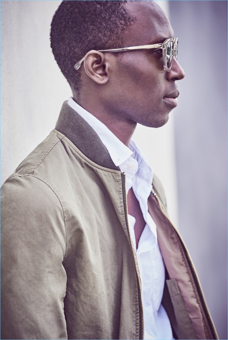 Play it cool in this city look by J.Crew. Model Armando Cabral wears a Wallace & Barnes MA-1 bomber jacket $148 with a J.Crew white shirt $59.50 and 9″ shorts $64.50.