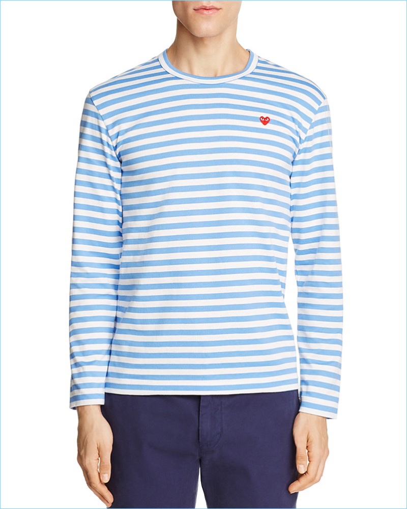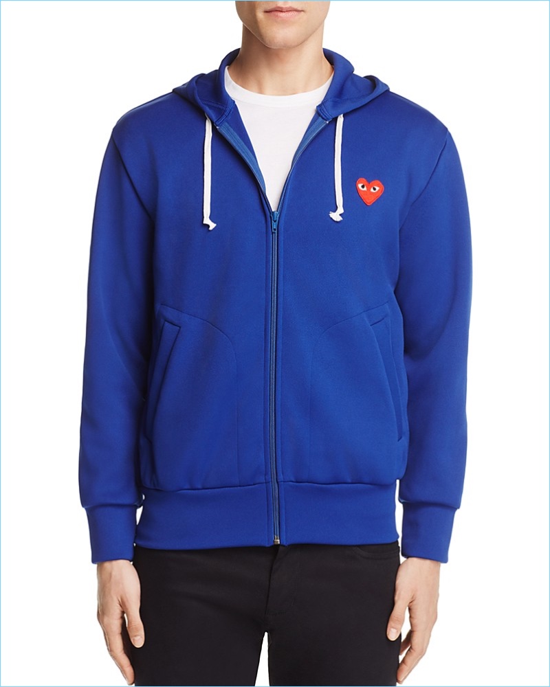 PinStyled for a Clambake: Playfully casual, this look begins with a vibrant blue heart logo hoodie by Comme des Garçons PLAY. It also includes the brand’s striped logo tee with NN07 slim-fit chinos and Vans classic suede slip-on sneakers.