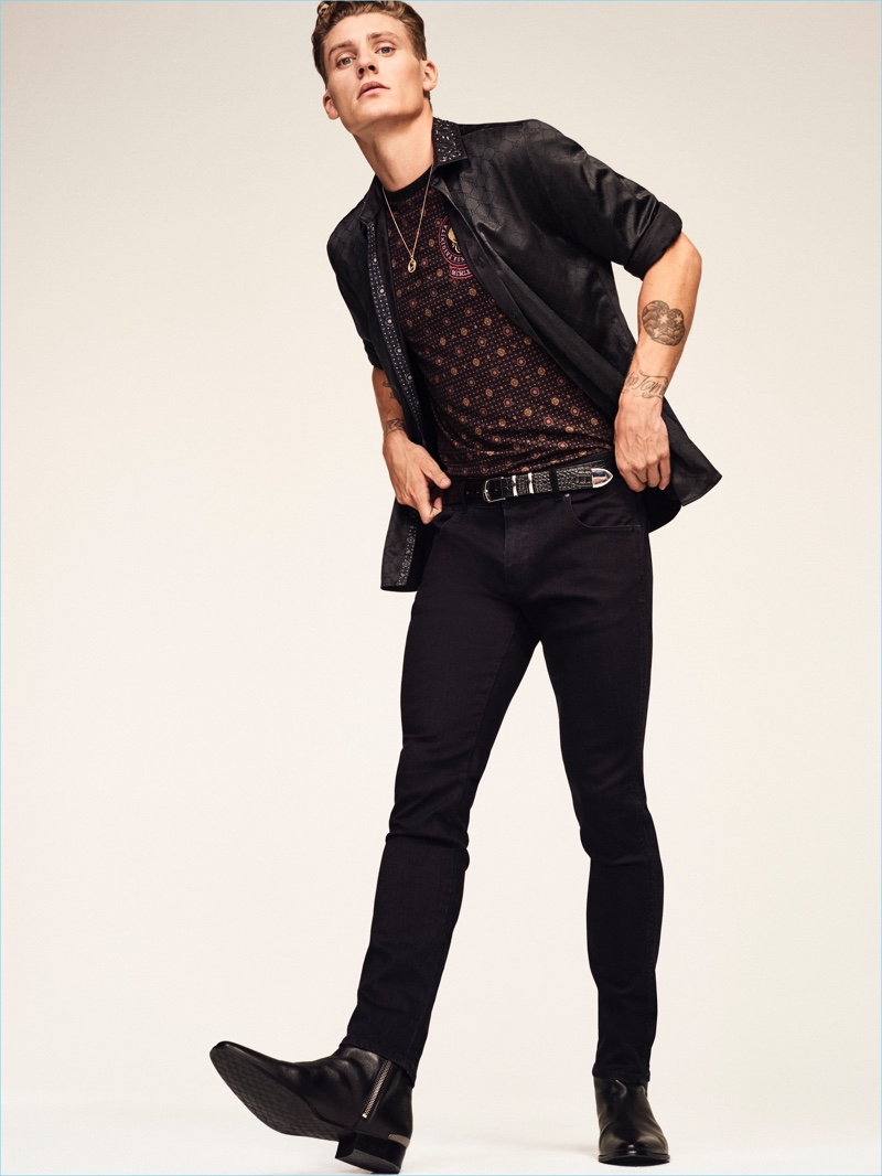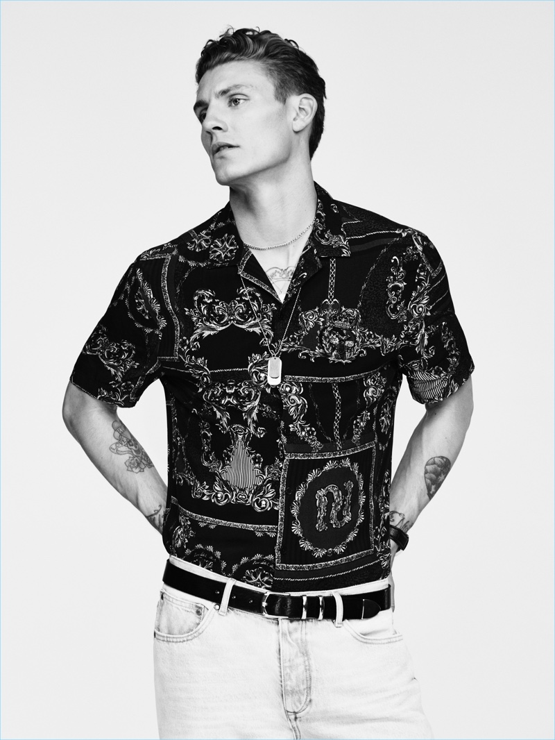 A cool vision, Mikkel Jensen wears a leather jacket, Chelsea boots, and a baroque print shirt from River Island’s RI30 collection.
